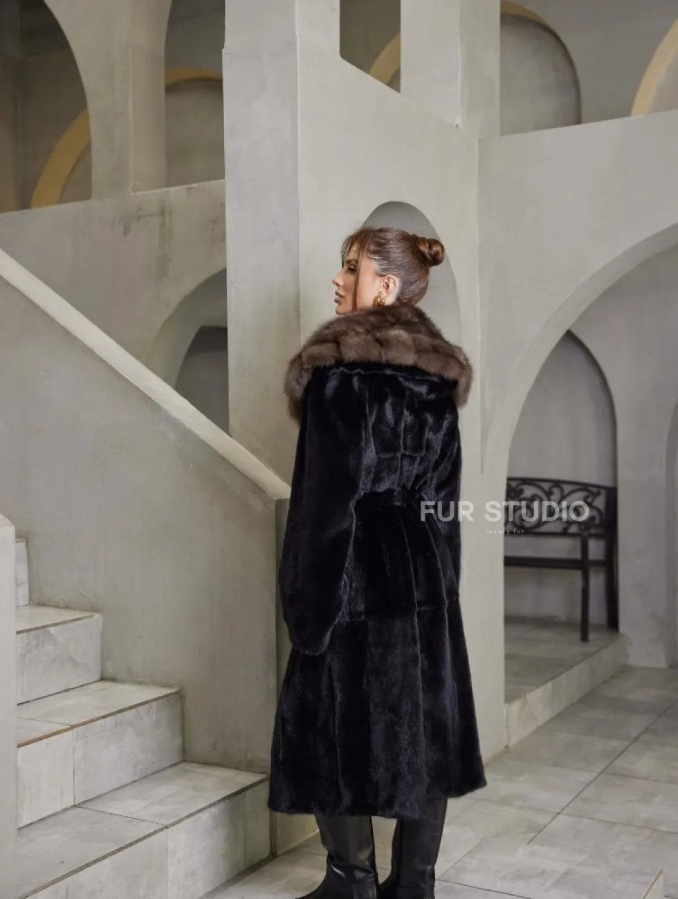 Мех данной шубы норка Blackglama , цвет черный. Предлагается в размерах от 40 до 48. Длина модели 115-120 см, что выгодно подчеркивает фигуру девушек. Эта модель идеально подойдет для девушек и женщин, предпочитающих роскошные натуральные меха.