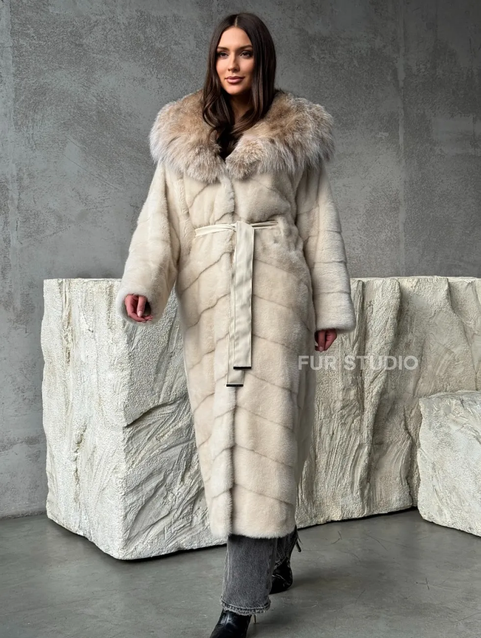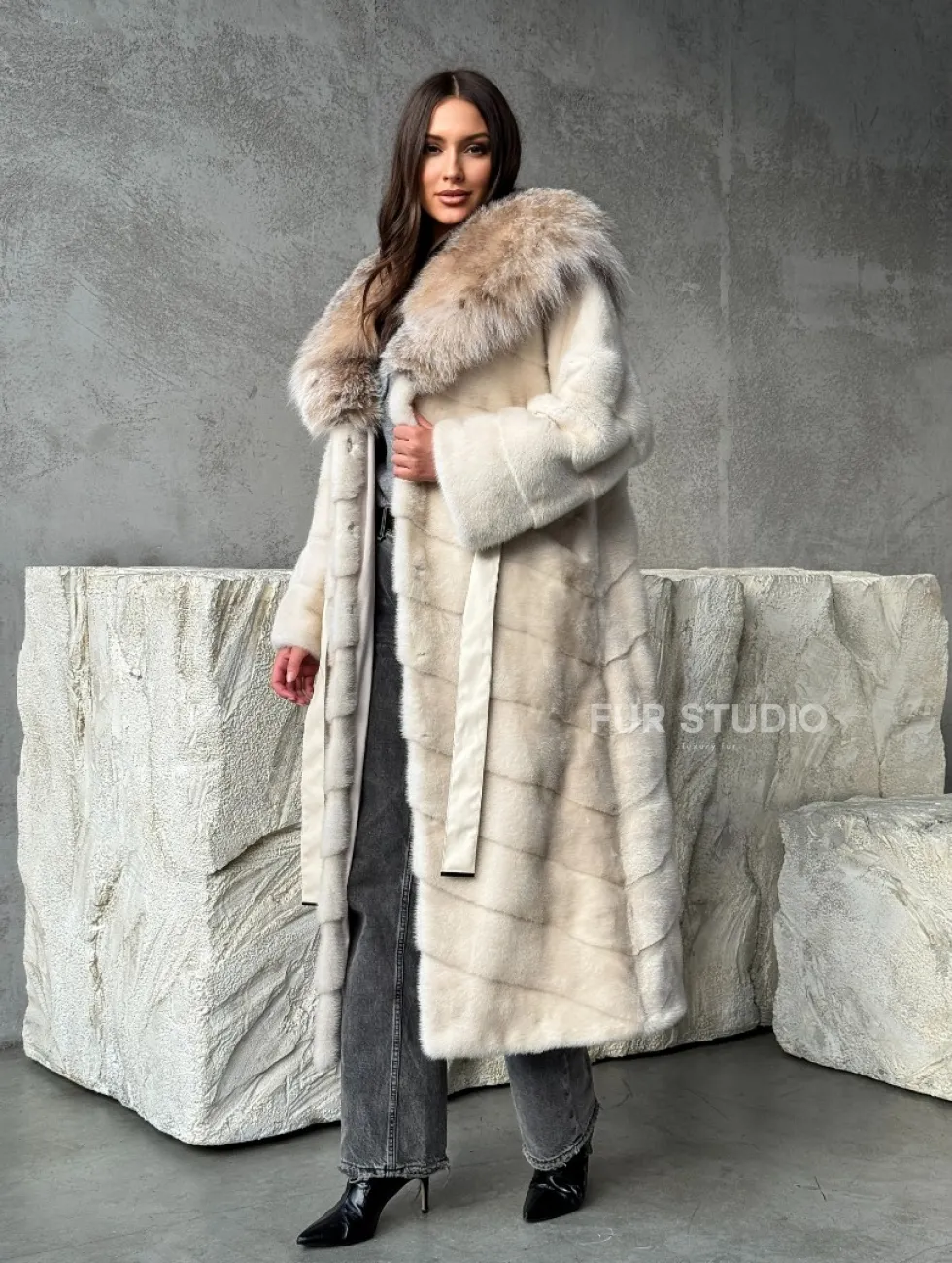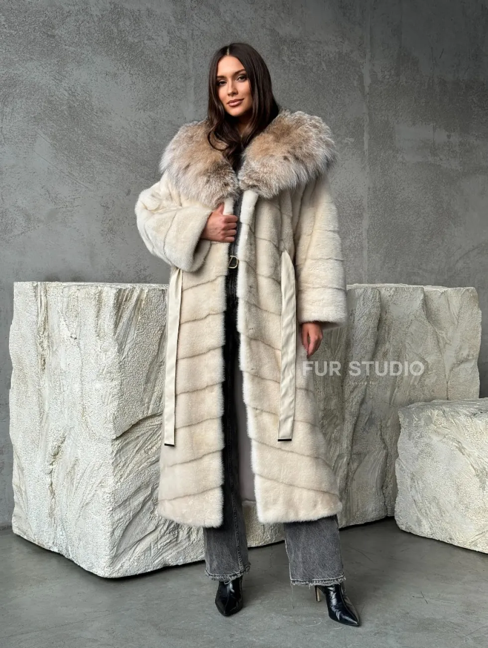 Мех данной шубы аукционная норка, цвет бежевый. Предлагается в размерах от 42 до 48. Длина модели 125-130 см, что выгодно подчеркивает фигуру девушек. Эта модель идеально подойдет для девушек и женщин, предпочитающих роскошные натуральные меха.