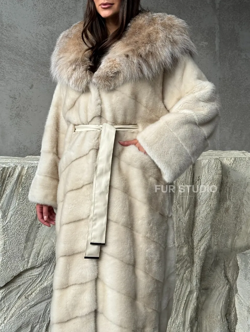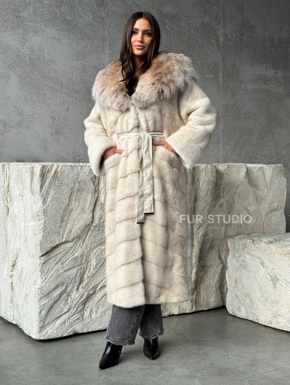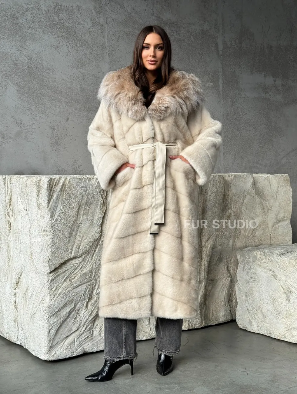 Мех данной шубы аукционная норка, цвет бежевый. Предлагается в размерах от 42 до 48. Длина модели 125-130 см, что выгодно подчеркивает фигуру девушек. Эта модель идеально подойдет для девушек и женщин, предпочитающих роскошные натуральные меха.