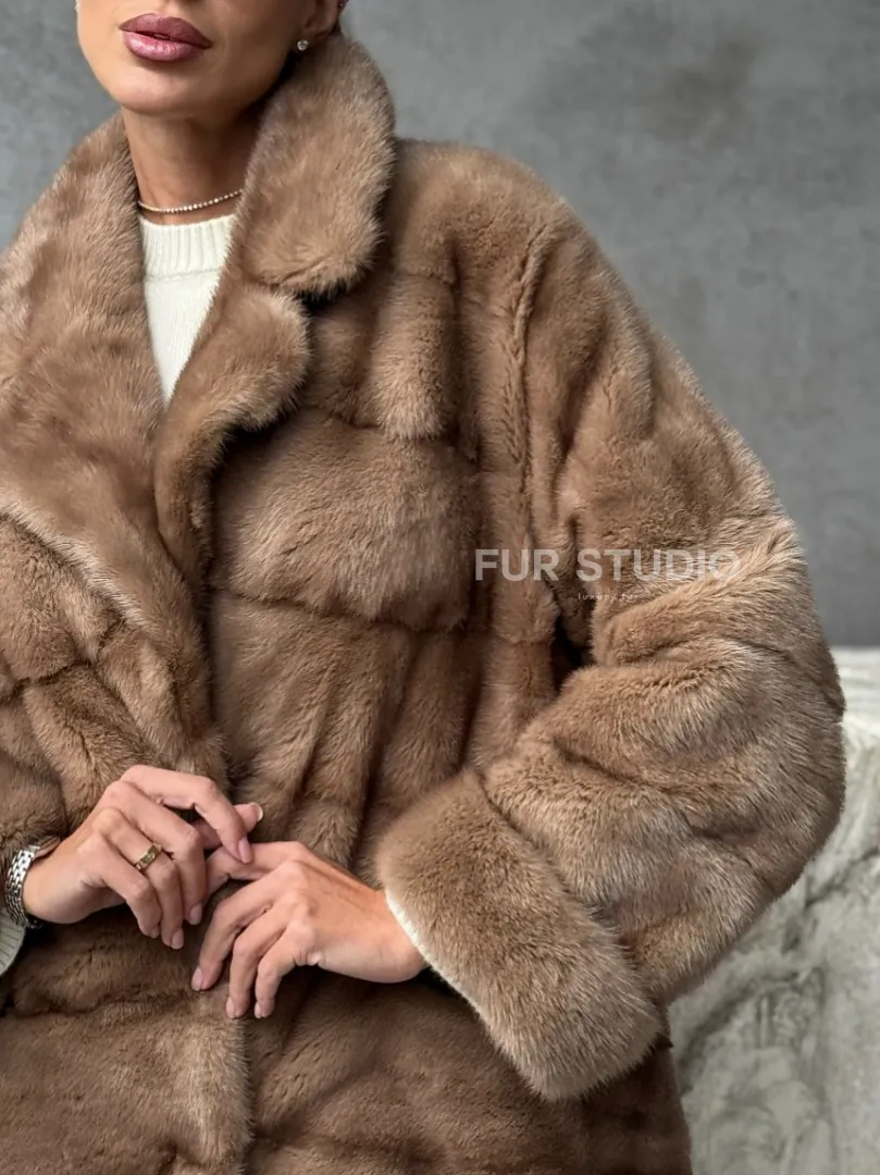 Мех данной шубы аукционная норка, цвет бежевый. Предлагается в размерах от 42 до 54. Длина модели 65-70 см , что выгодно подчеркивает фигуру девушек. Эта модель идеально подойдет для девушек и женщин, предпочитающих роскошные натуральные меха.