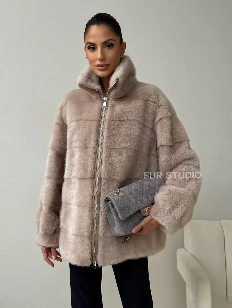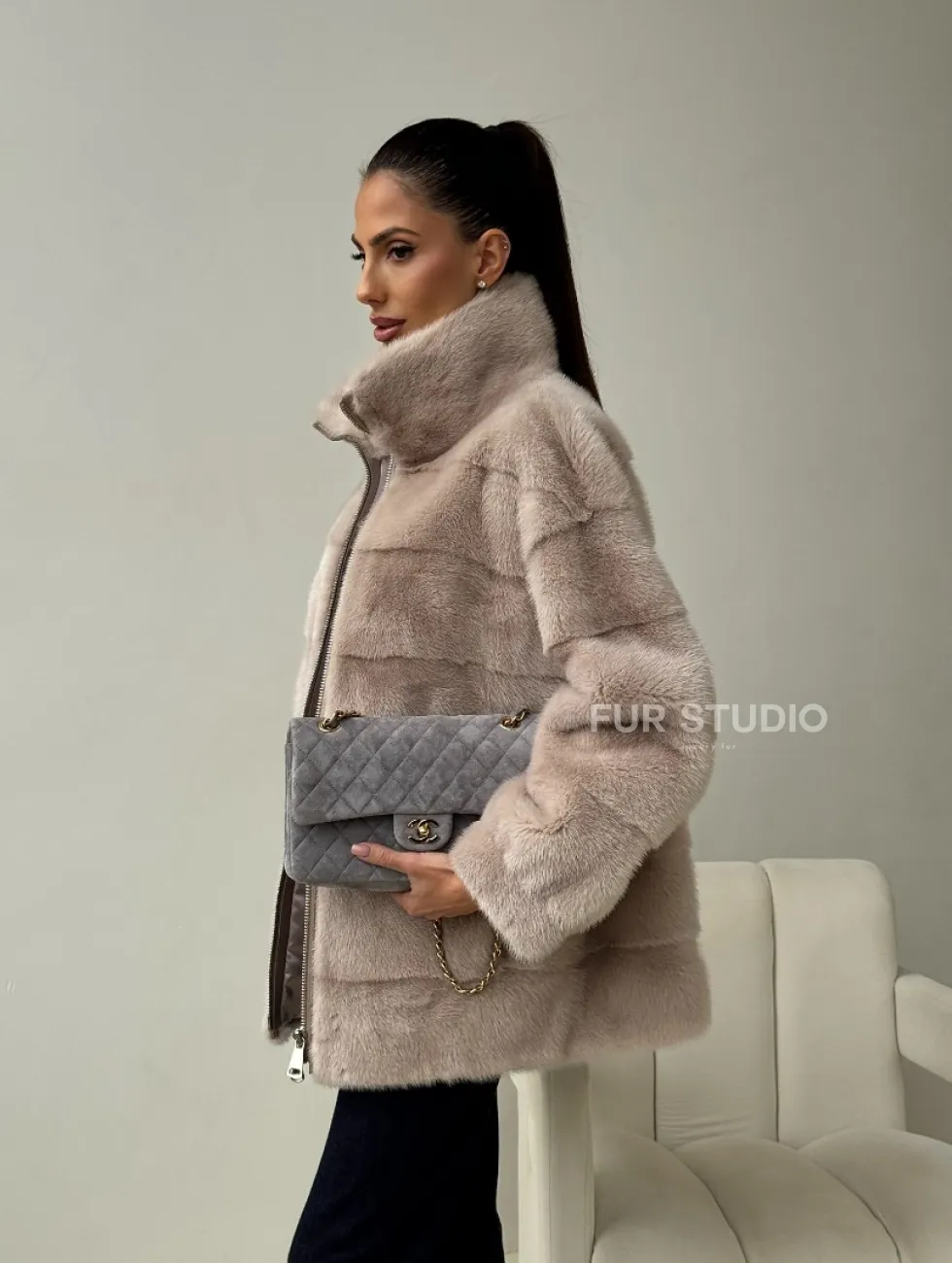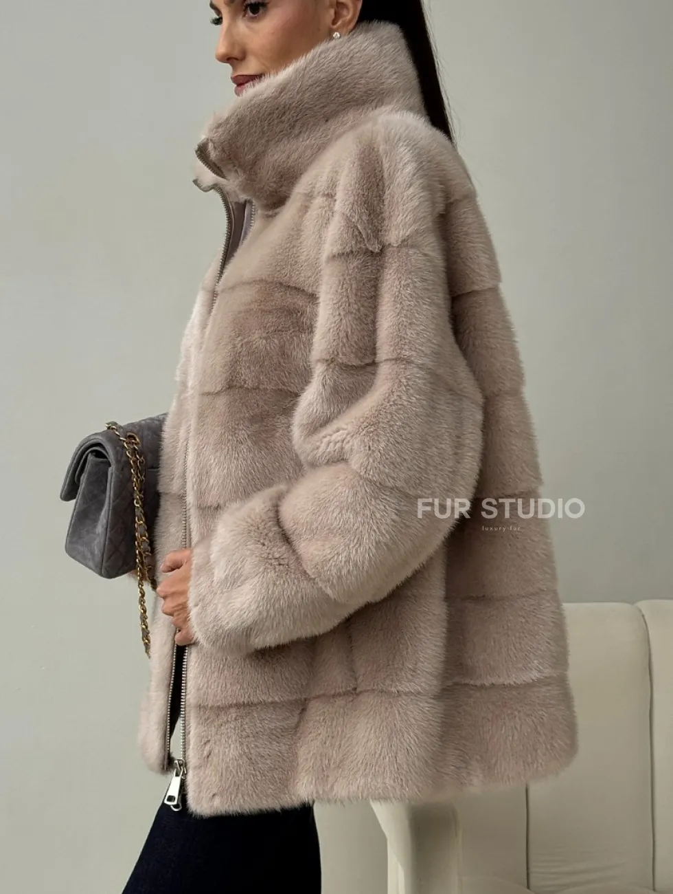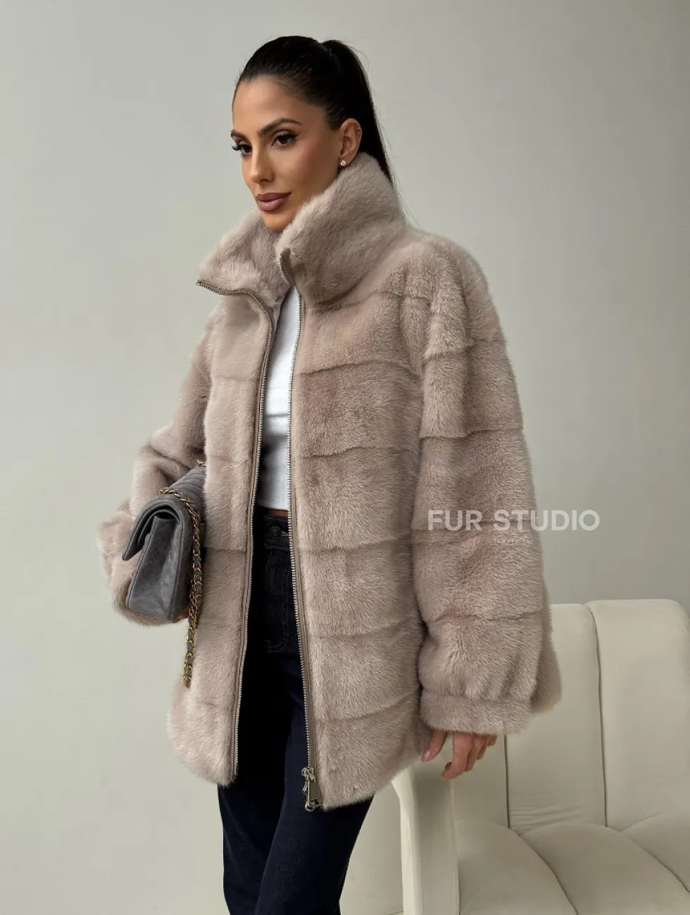 Норковая куртка стойка воротник доступна для покупки в нашем шоуруме Furs Studio в Москве. У нас так же есть доставка во все города России. Добавьте немного роскоши в свой гардероб с этой шубой, которая будет служить вам многие годы.