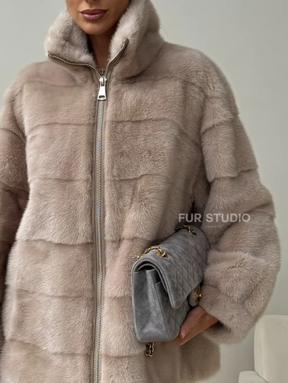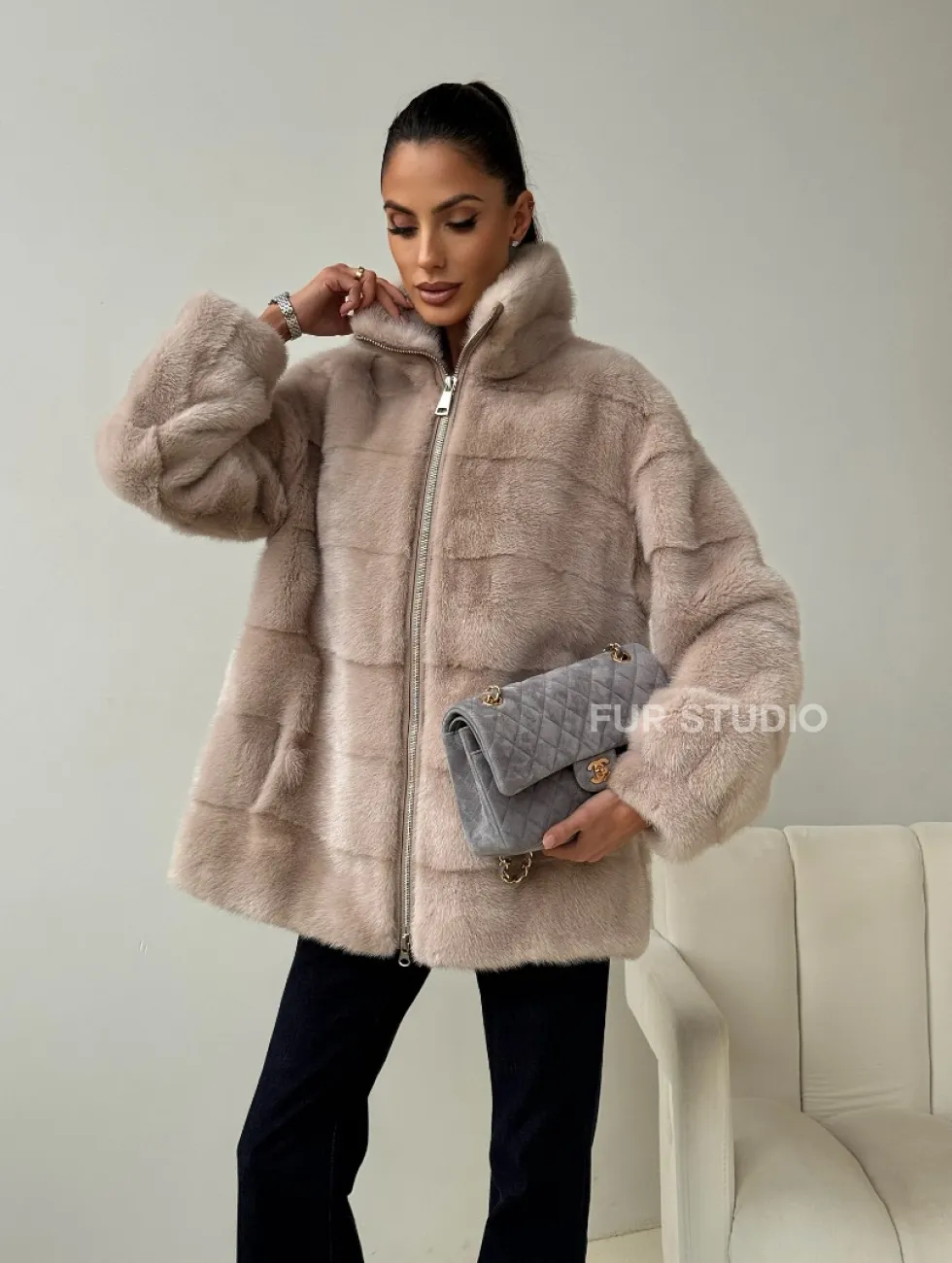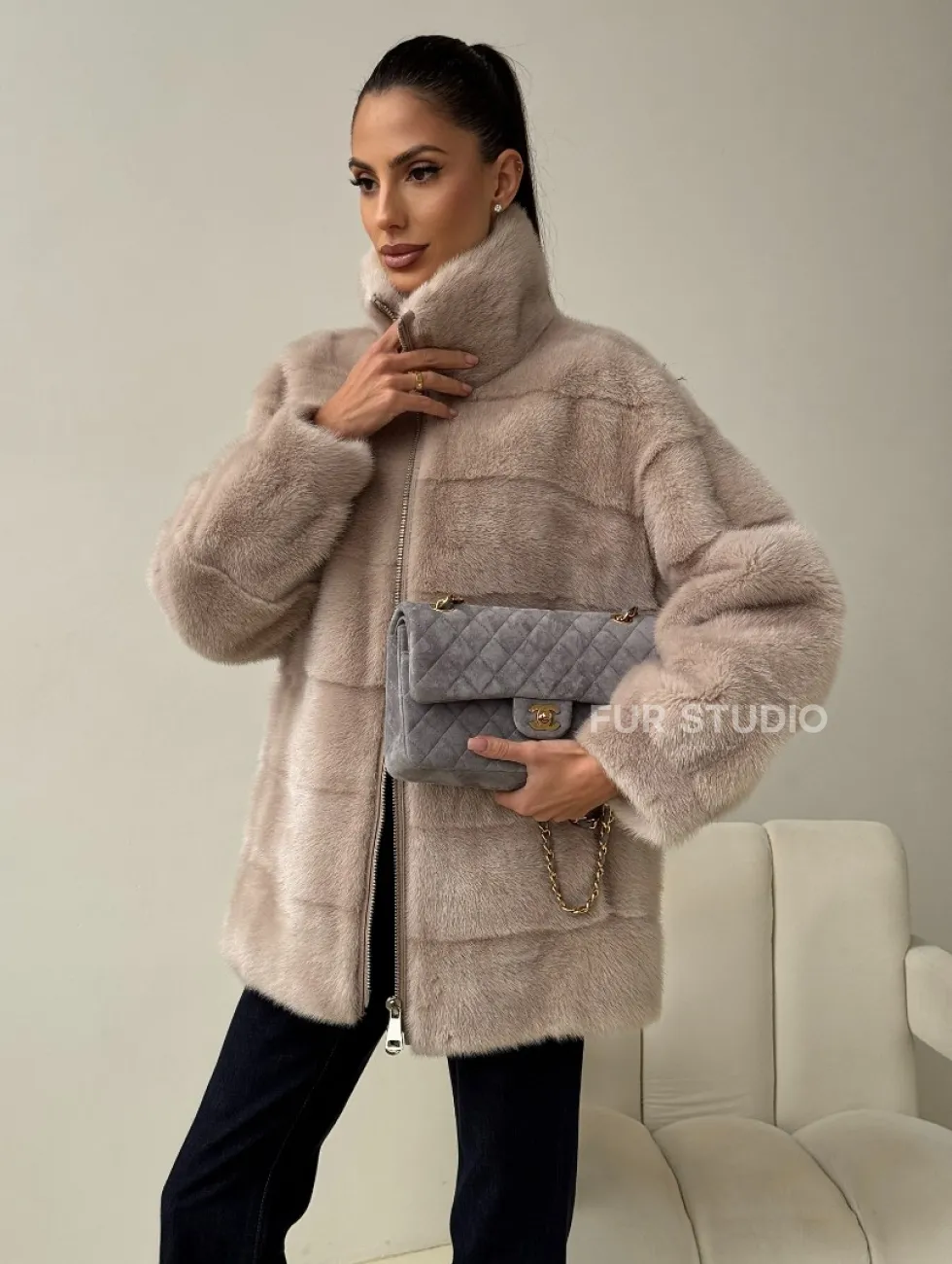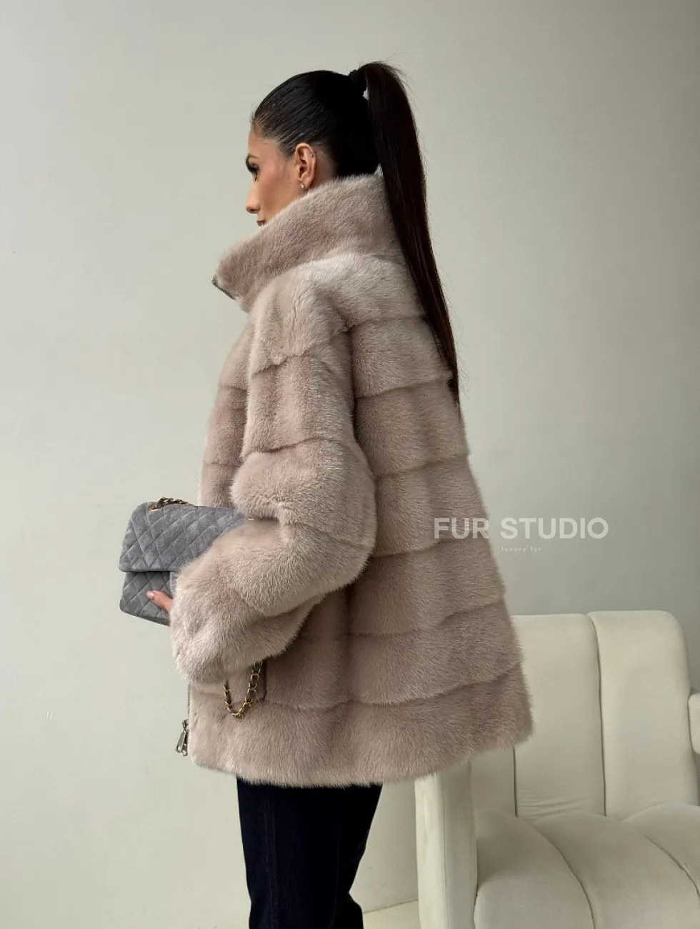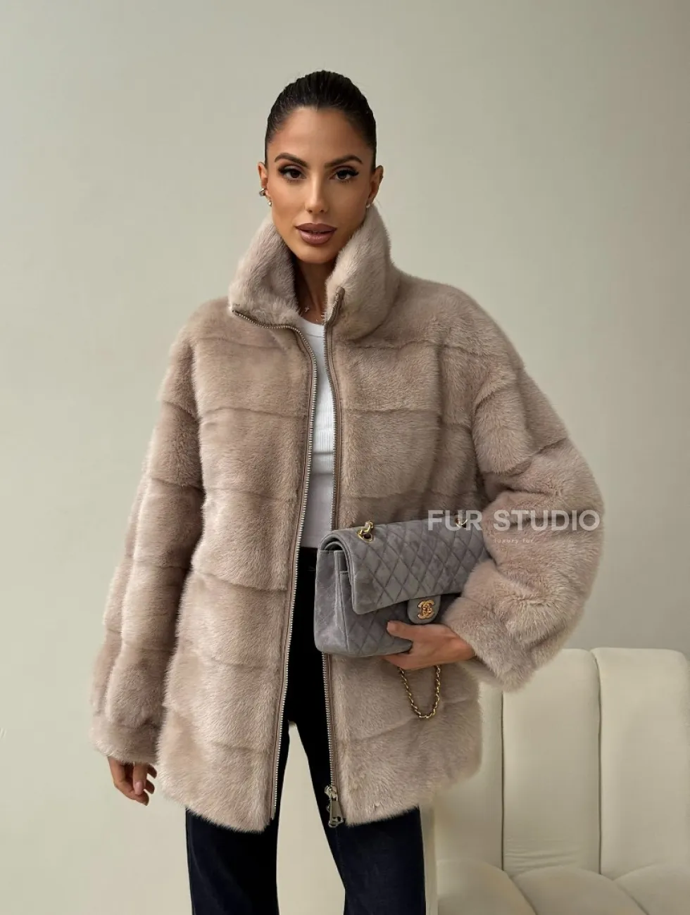 Норковая куртка стойка воротник доступна для покупки в нашем шоуруме Furs Studio в Москве. У нас так же есть доставка во все города России. Добавьте немного роскоши в свой гардероб с этой шубой, которая будет служить вам многие годы.
