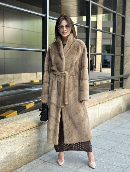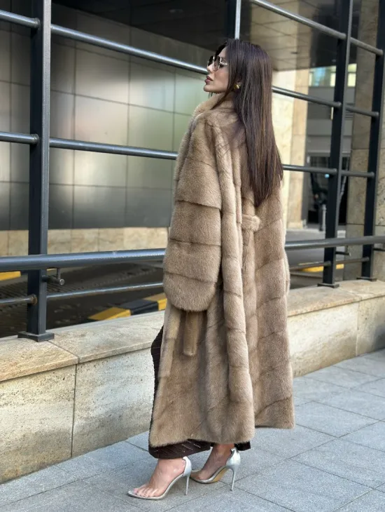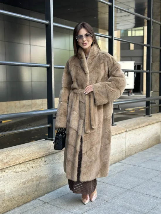 Мех данной шубы аукционная норка, цвет бежевый. Предлагается в размерах от 42 до 44. Длина модели 105-110 см, что выгодно подчеркивает фигуру девушек. Эта модель идеально подойдет для девушек и женщин, предпочитающих роскошные натуральные меха.