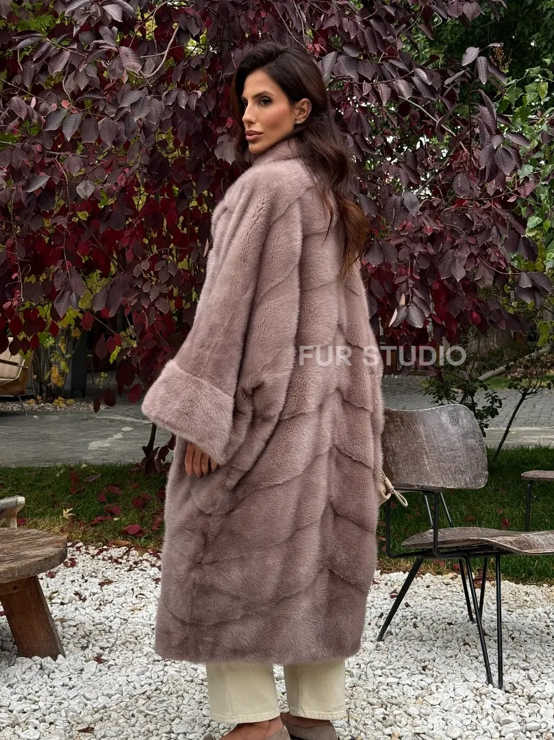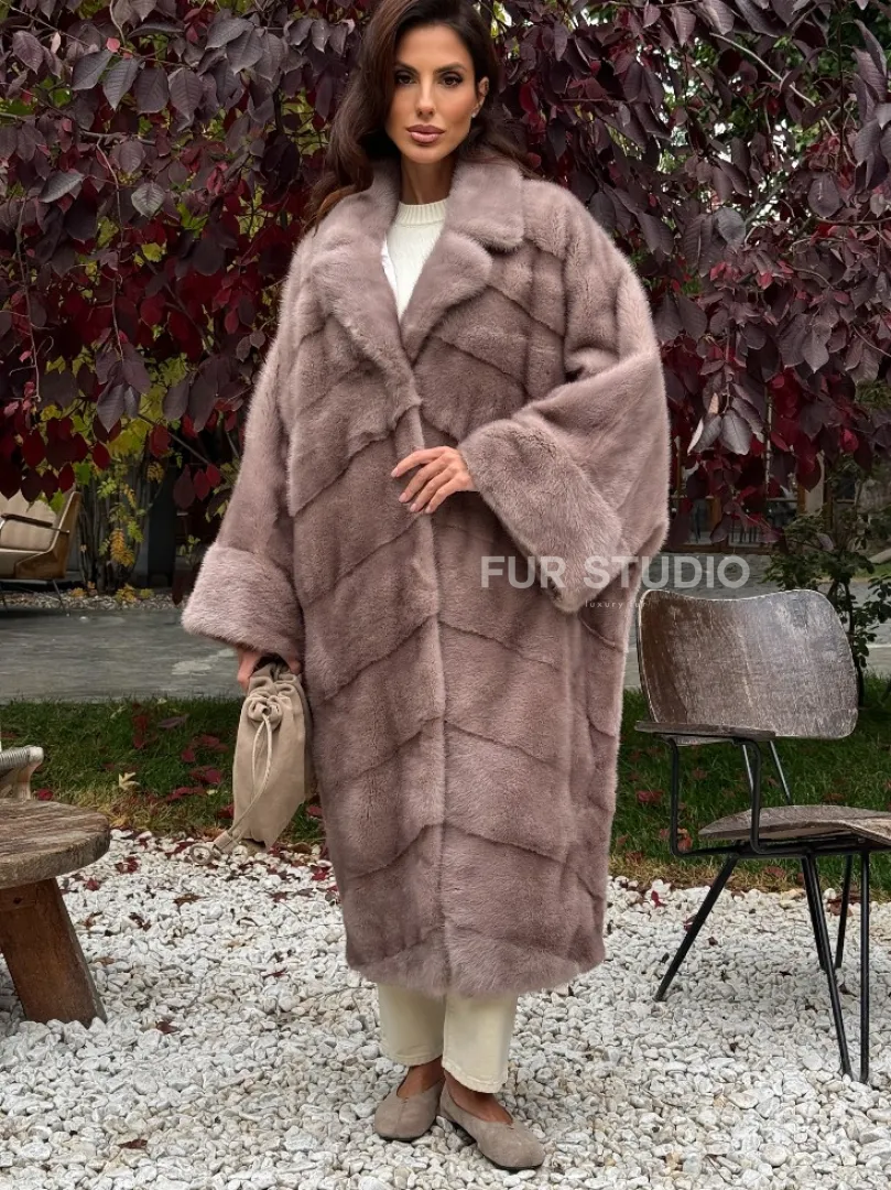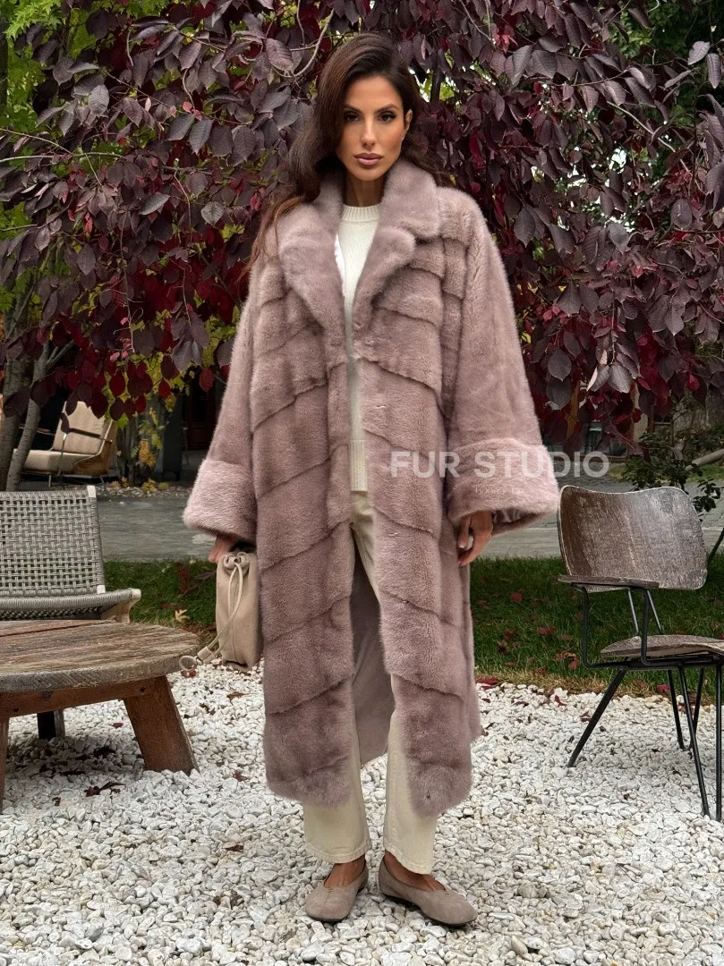 Мех данной шубы аукционная норка , цвет розовый. Предлагается в размерах от oversize (42 до 68). Длина модели 115-120 см, что выгодно подчеркивает фигуру девушек. Эта модель идеально подойдет для девушек и женщин, предпочитающих роскошные натуральные меха.