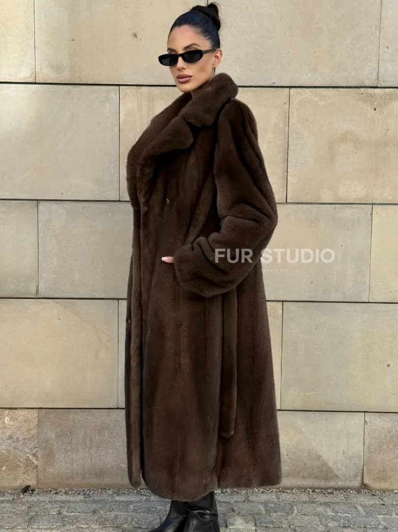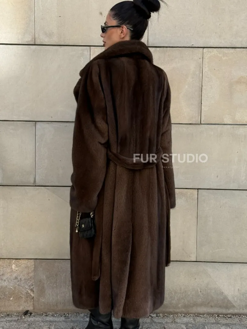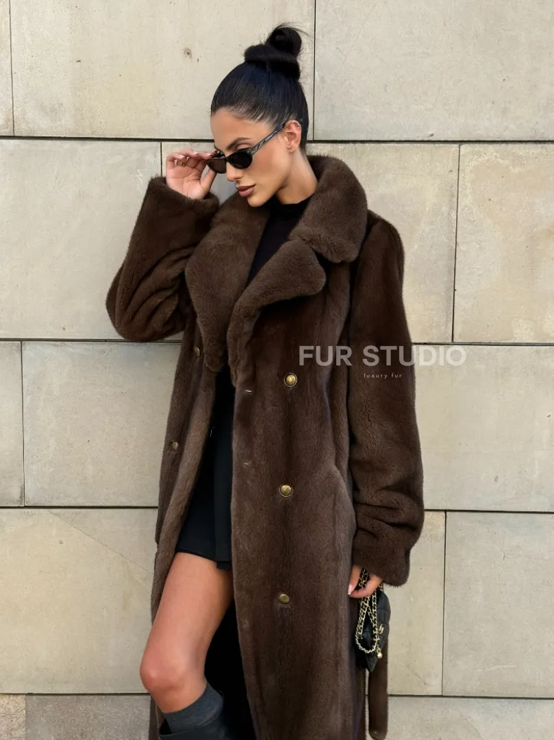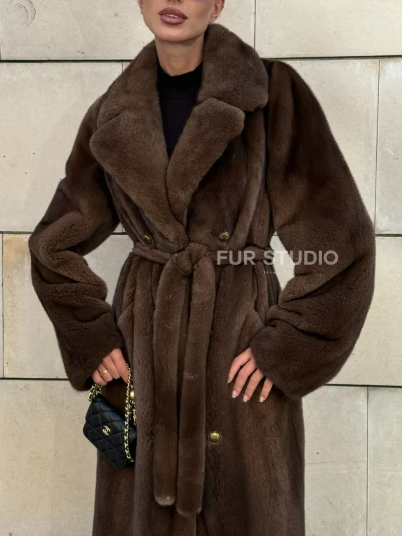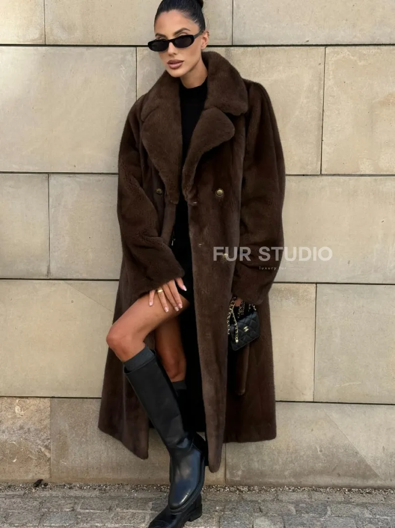 Мех данной шубы аукционная норка , цвет коричневый. Предлагается в размерах от 40 до 52. Длина модели 115-120 см, что выгодно подчеркивает фигуру девушек. Эта модель идеально подойдет для девушек и женщин, предпочитающих роскошные натуральные меха.