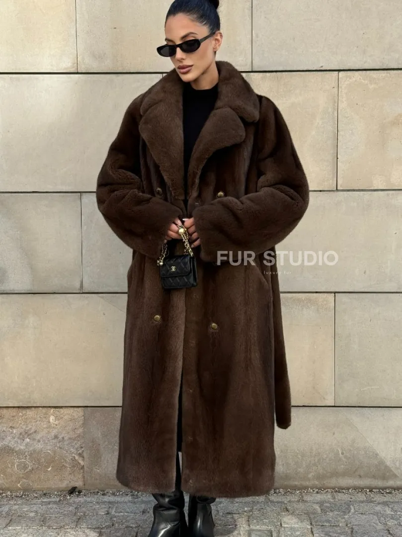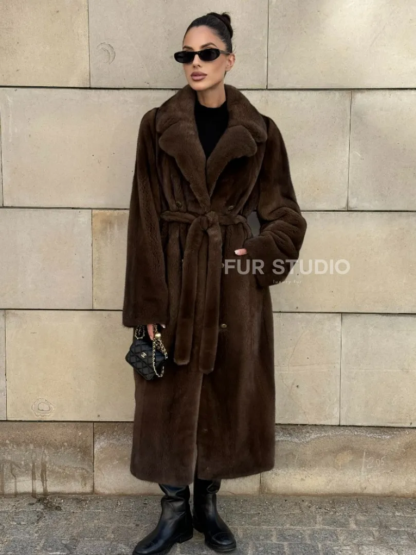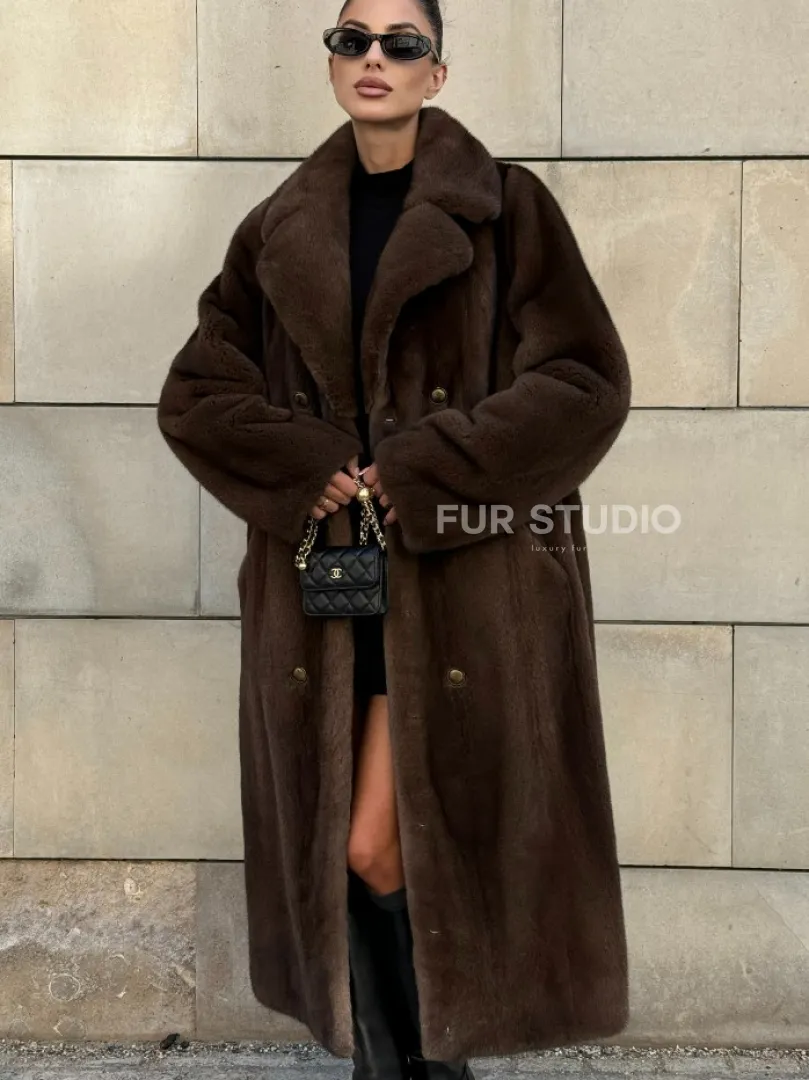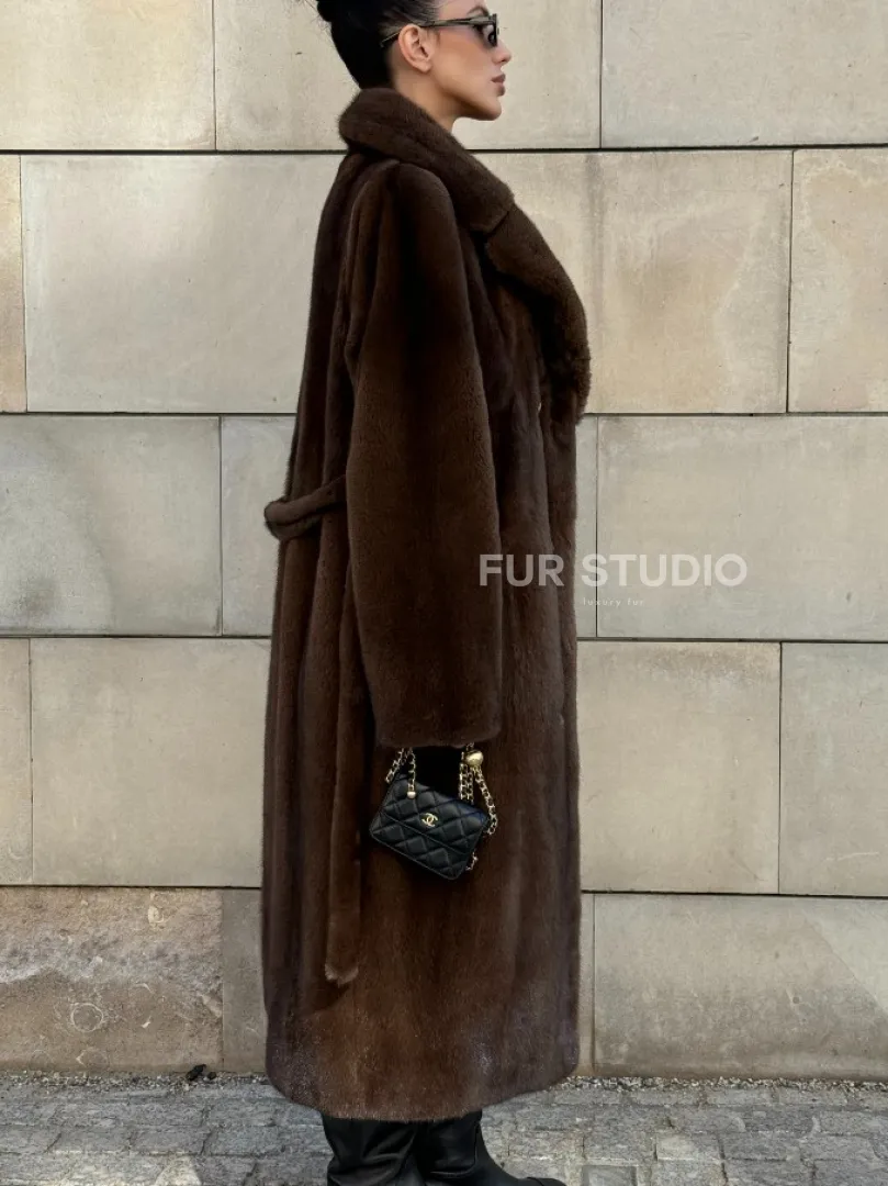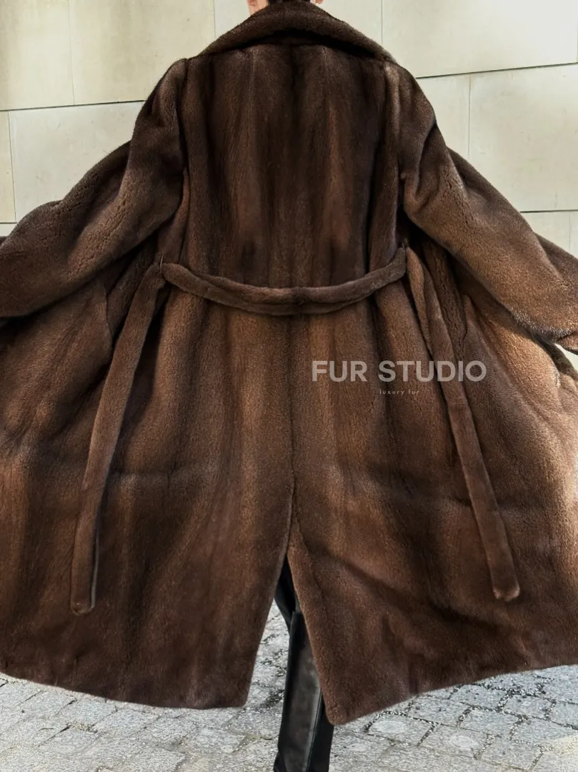 Мех данной шубы аукционная норка , цвет коричневый. Предлагается в размерах от 40 до 52. Длина модели 115-120 см, что выгодно подчеркивает фигуру девушек. Эта модель идеально подойдет для девушек и женщин, предпочитающих роскошные натуральные меха.
