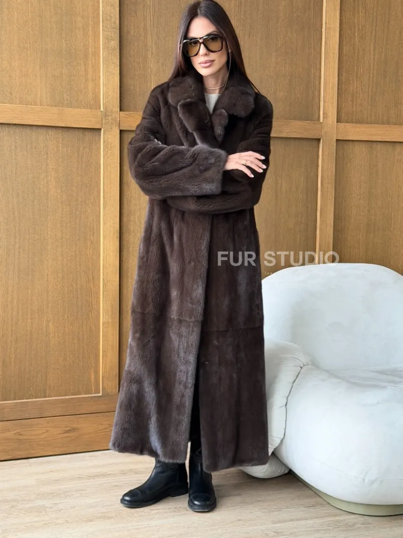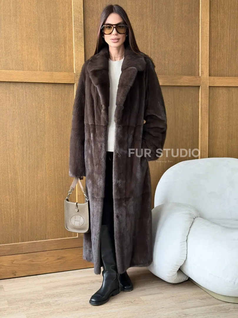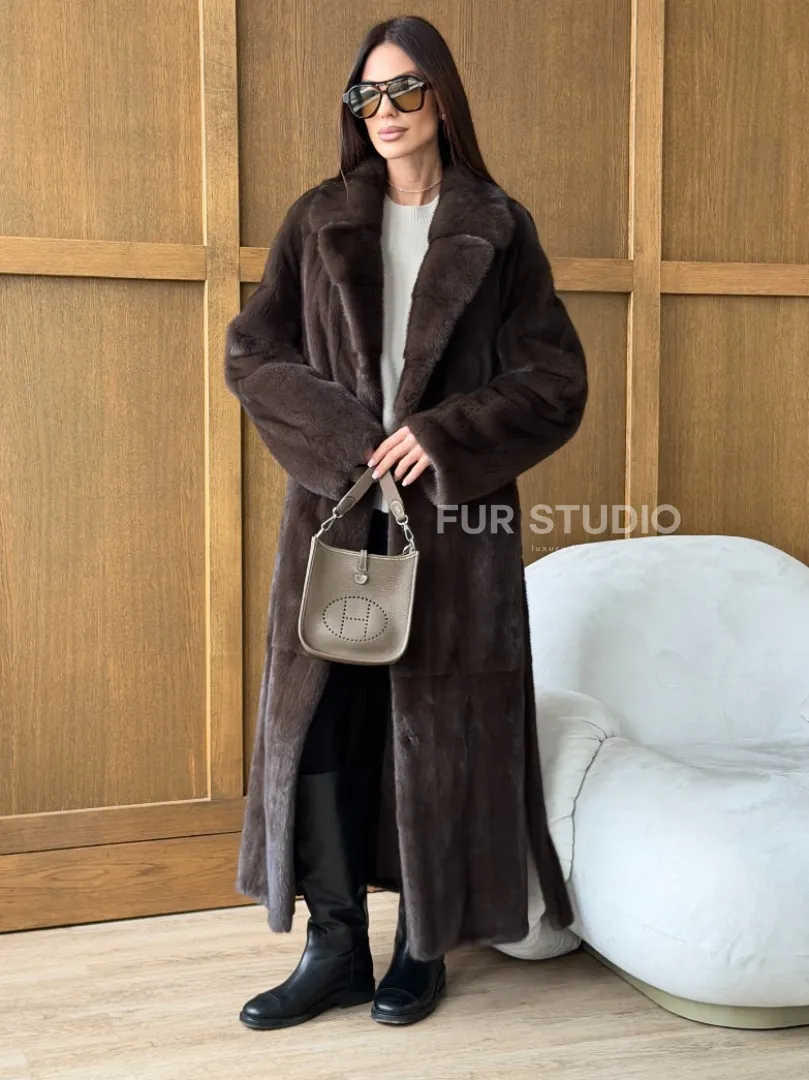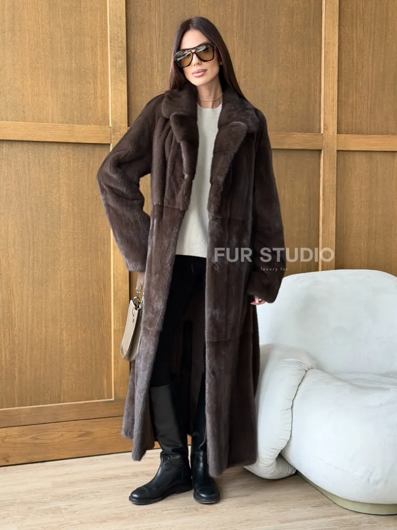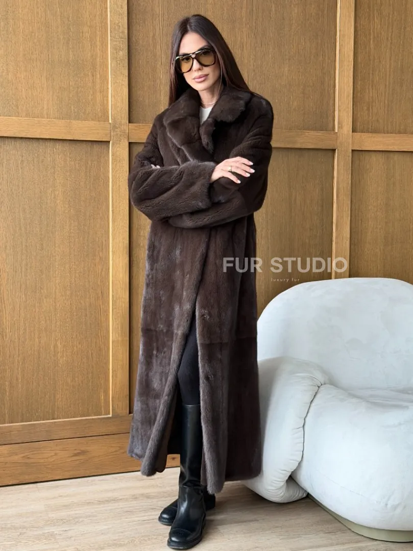 Мех данной шубы аукционная норка, цвет коричневый. Предлагается в размерах от 42 до 52. Длина модели 125-130 см, что выгодно подчеркивает фигуру девушек. Эта модель идеально подойдет для девушек и женщин, предпочитающих роскошные натуральные меха.