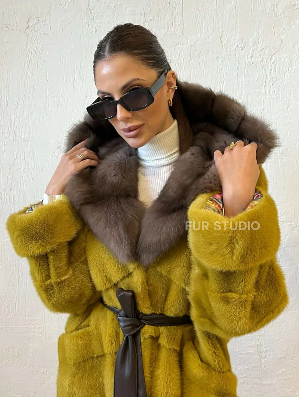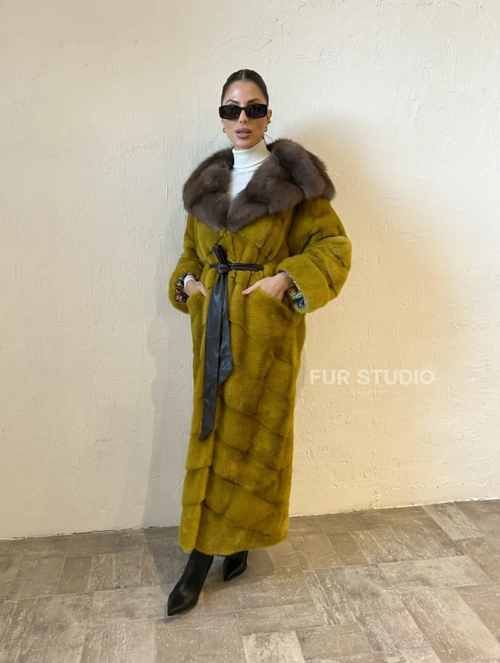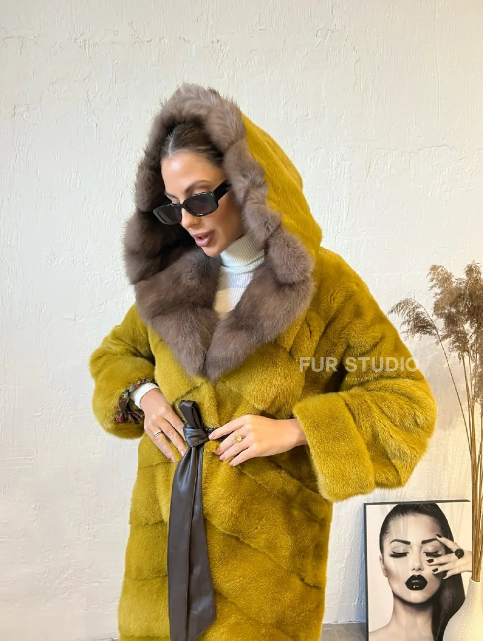 При этом в шубе будет тепло в холодную зиму. Шикарный капюшон позаботится о прическе. Стильный пояс придаст силуэту женственности. Купить норковую шубу из меха норки с капюшоном куница - цвет горчичный могут женщины, которые привыкли удивлять и быть в центре внимания.