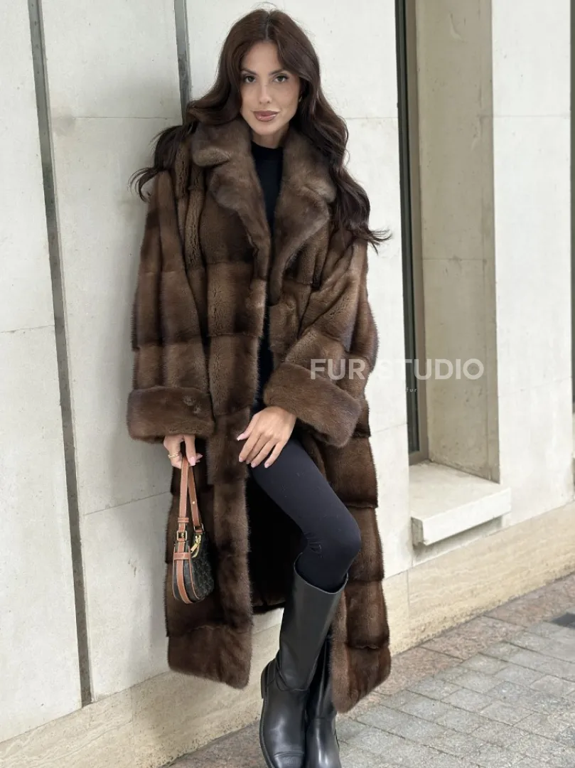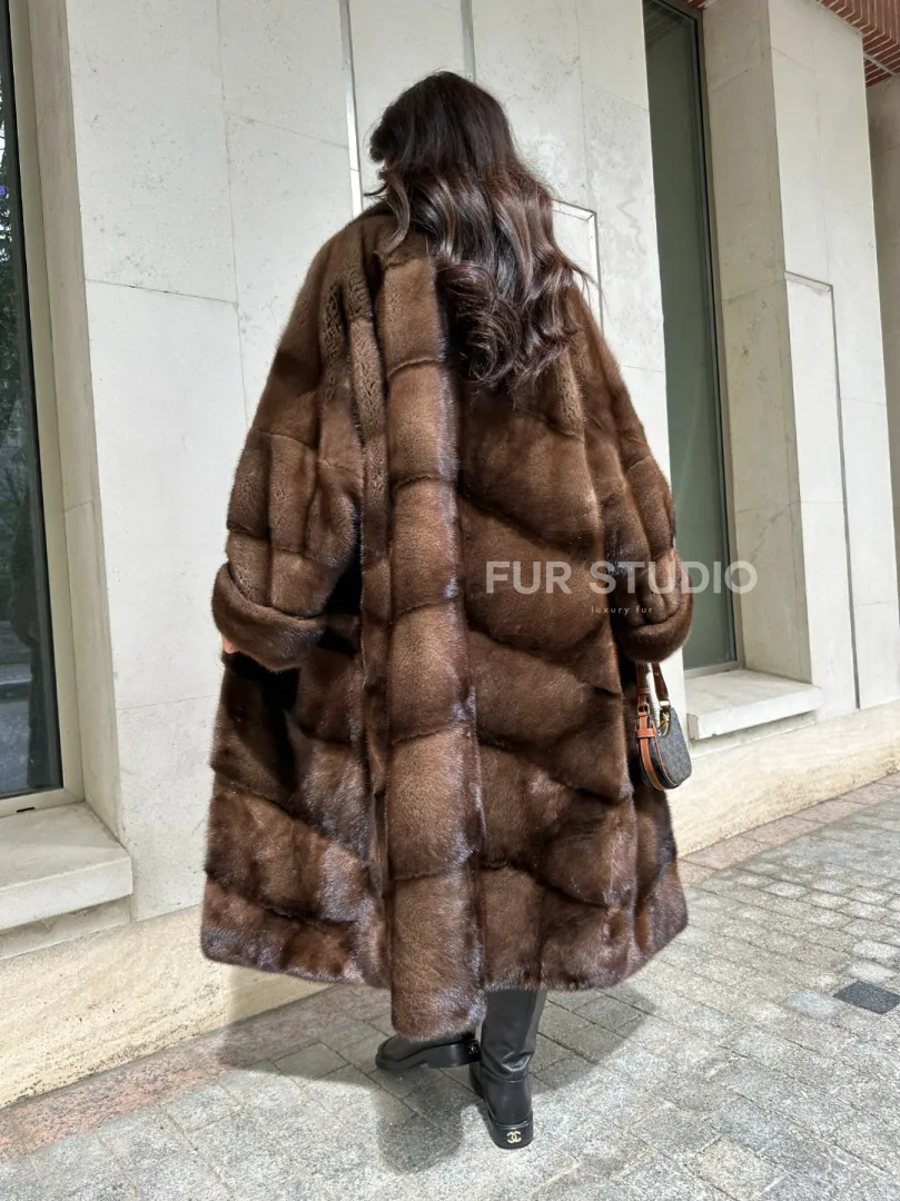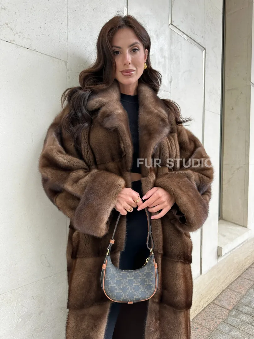 Мех данной шубы аукционная норка, цвет коричневый. Предлагается в размерах от 42 до 66. Длина модели 115-120 см, что выгодно подчеркивает фигуру девушек. Эта модель идеально подойдет для девушек и женщин, предпочитающих роскошные натуральные меха.