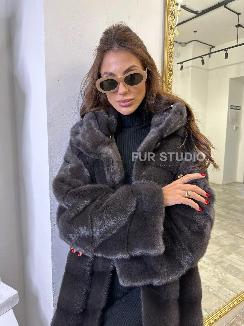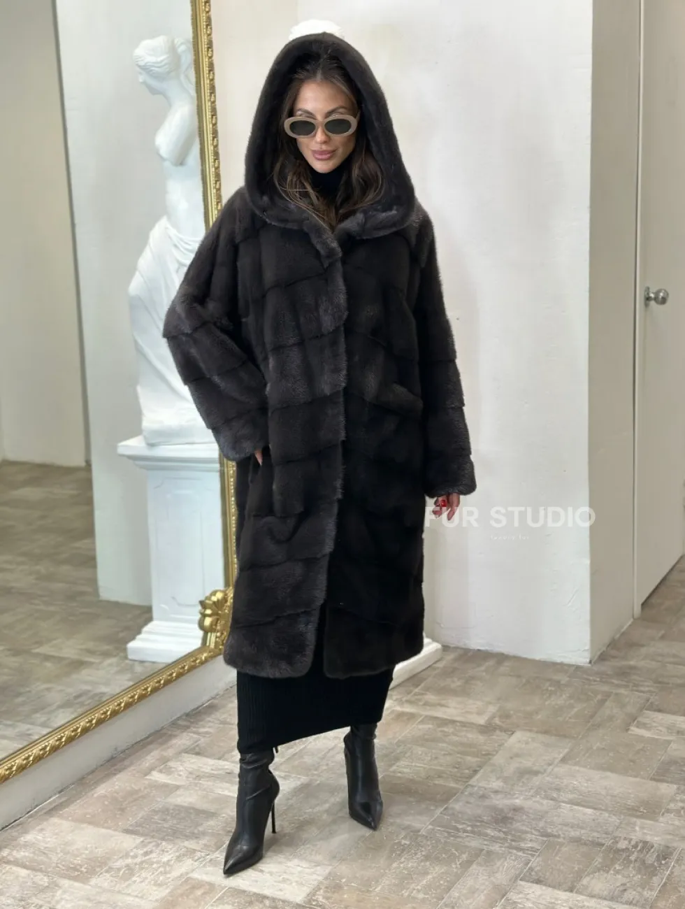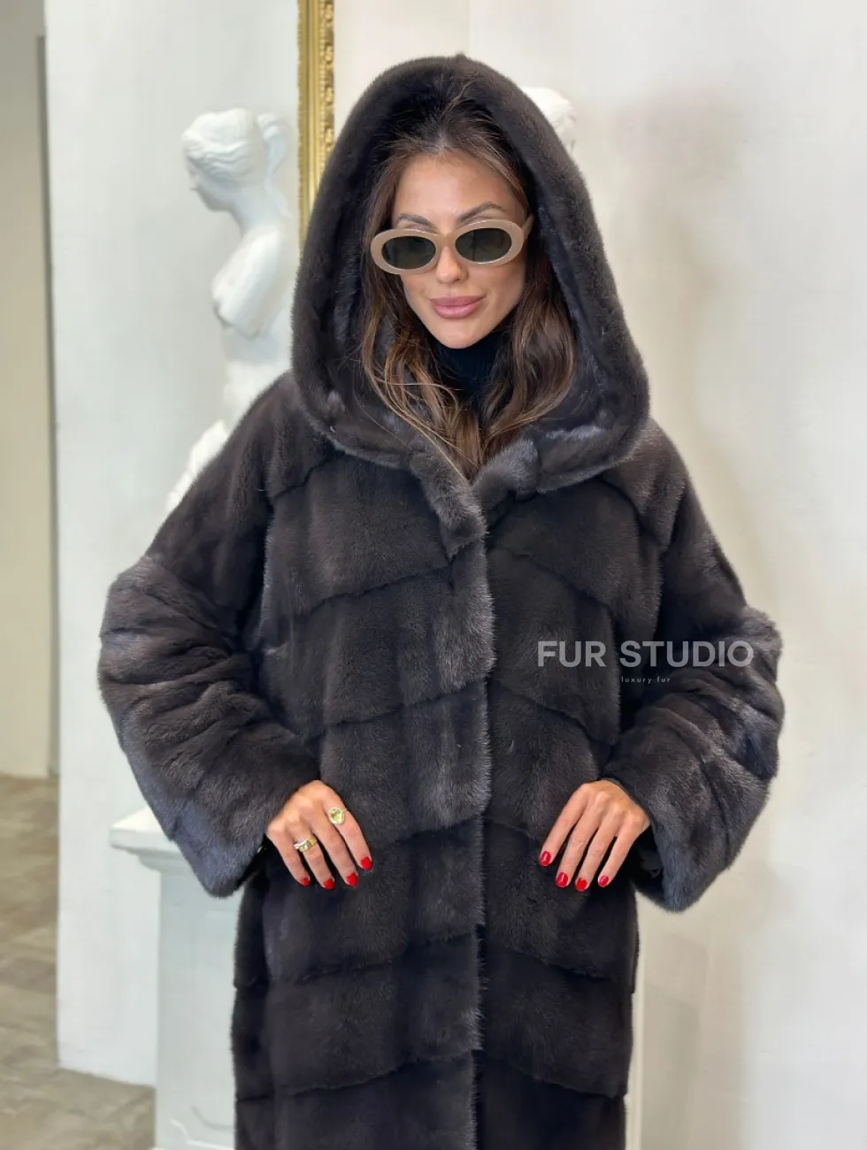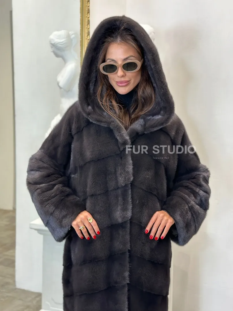 Норковая шуба в цвете графитовый уголь с капюшоном доступна для покупки в нашем шоуруме Furs Studio в Москве. У нас так же есть доставка во все города России. Добавьте немного роскоши в свой гардероб с этой шубой, которая будет служить вам многие годы.