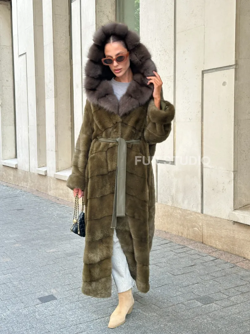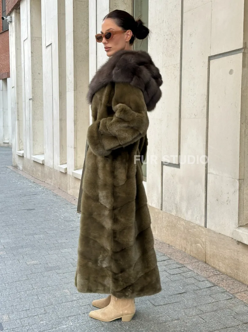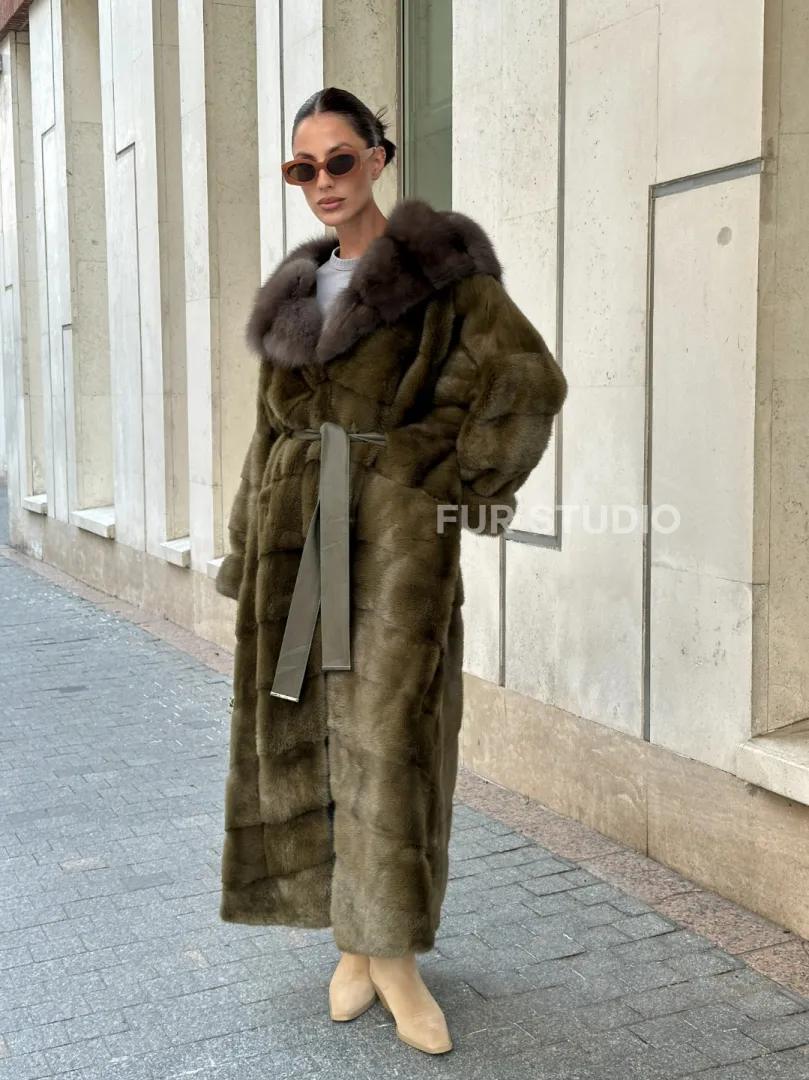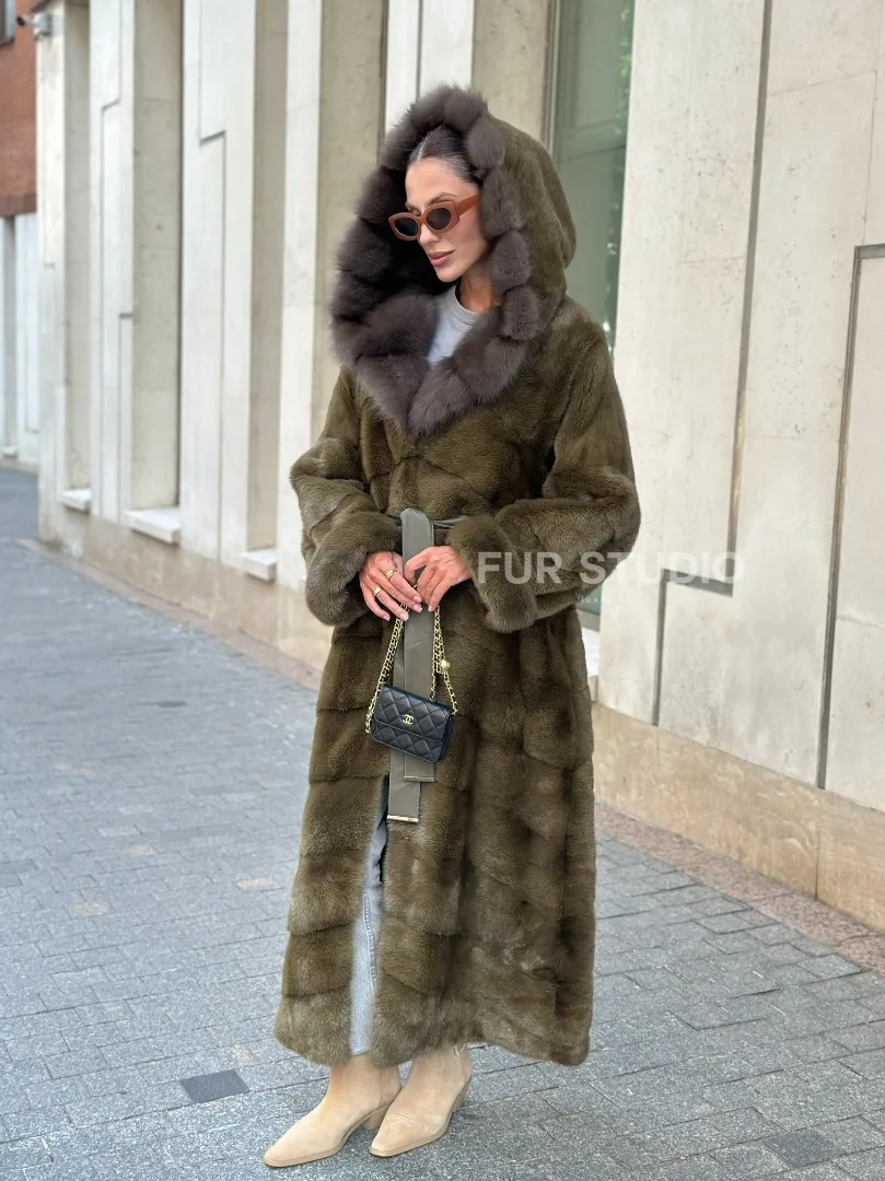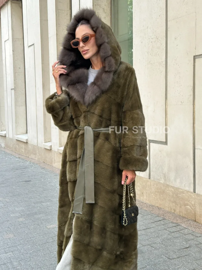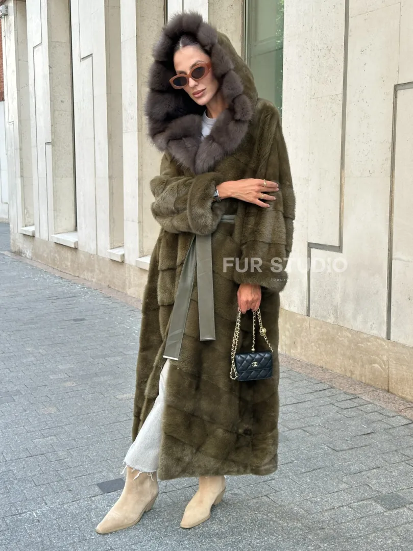 Норковая шуба зеленого цвета с капюшоном из меха куницы доступна для покупки в нашем шоуруме Furs Studio в Москве. У нас так же есть доставка во все города России. Добавьте немного роскоши в свой гардероб с этой шубой, которая будет служить вам многие годы.