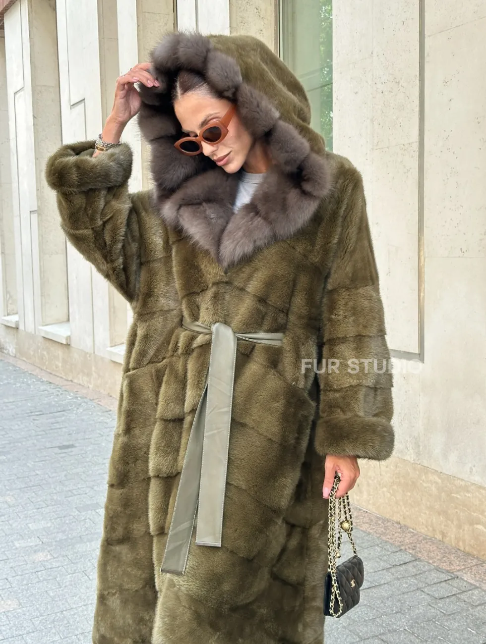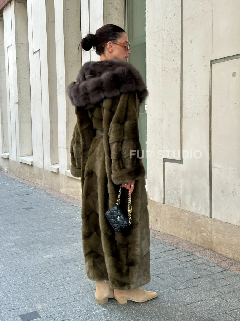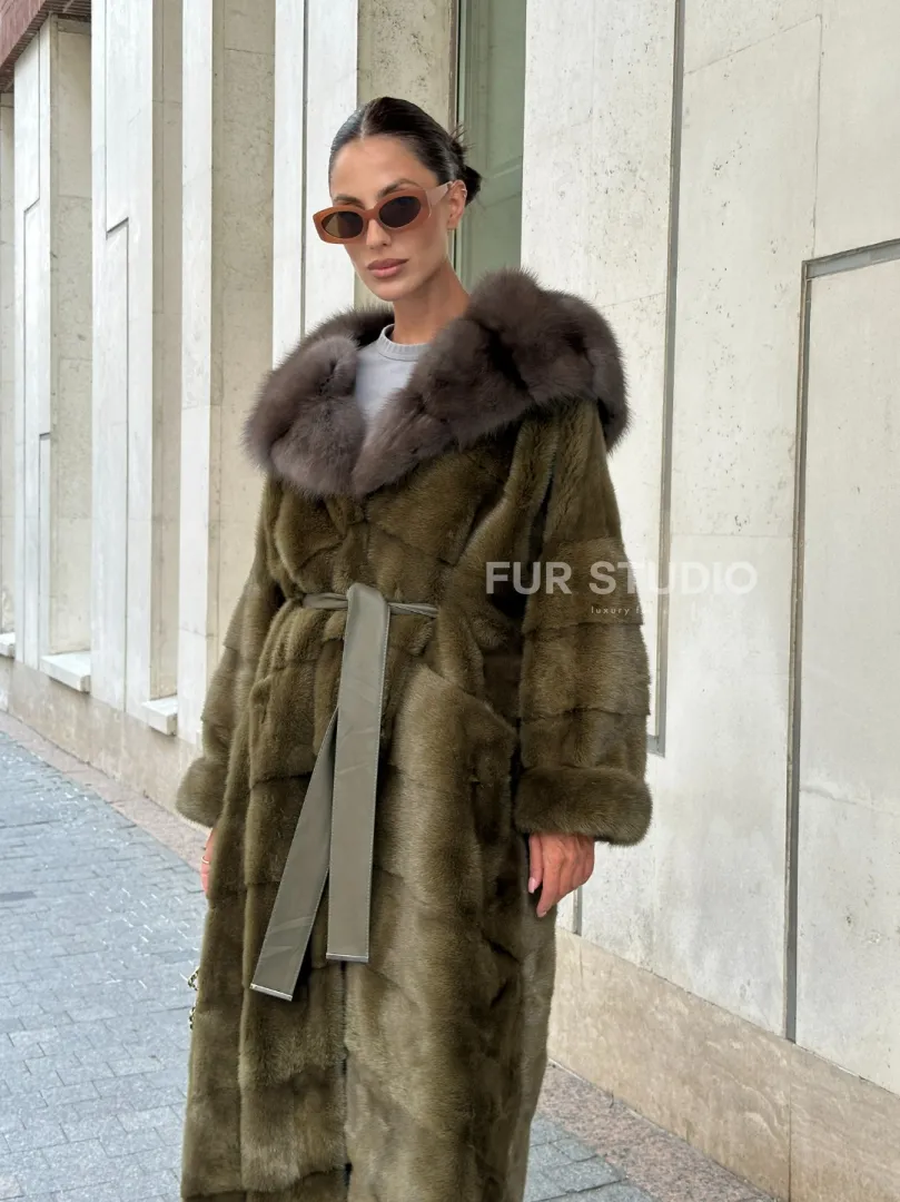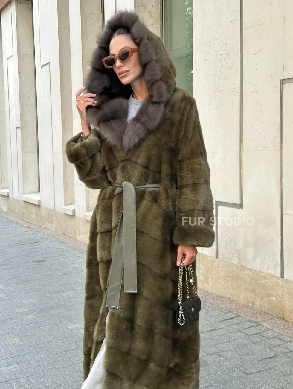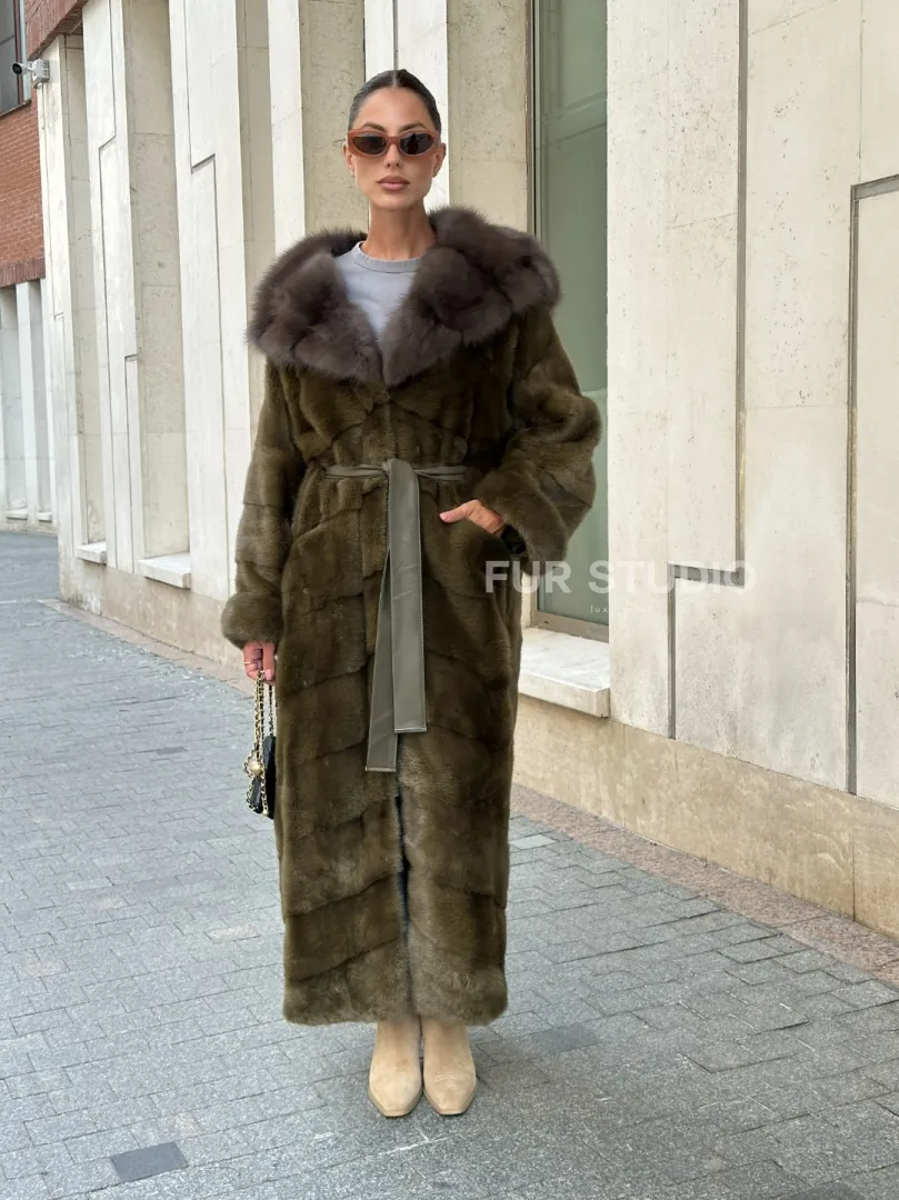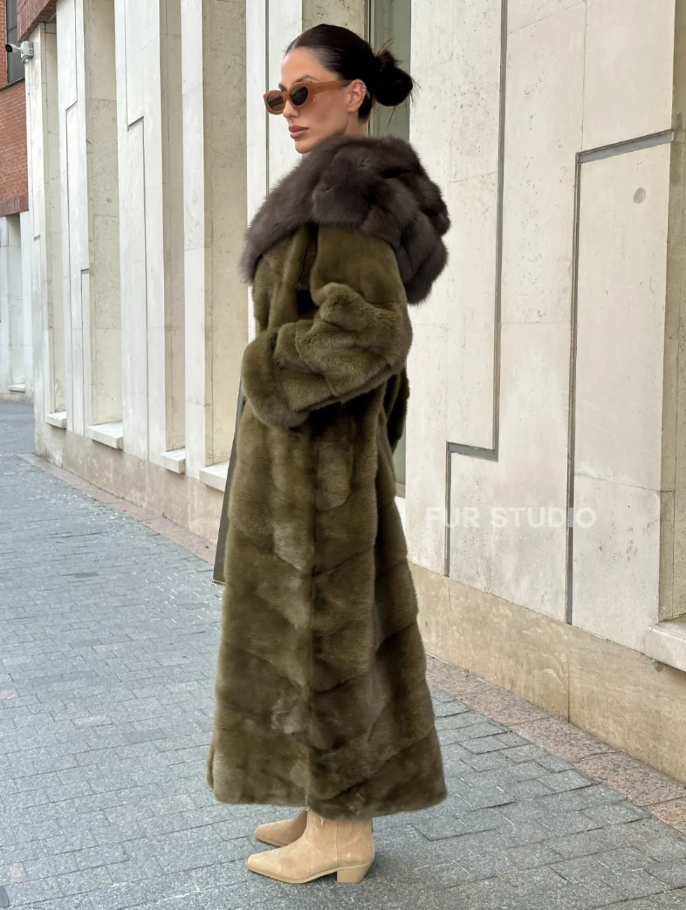 Норковая шуба зеленого цвета с капюшоном из меха куницы доступна для покупки в нашем шоуруме Furs Studio в Москве. У нас так же есть доставка во все города России. Добавьте немного роскоши в свой гардероб с этой шубой, которая будет служить вам многие годы.
