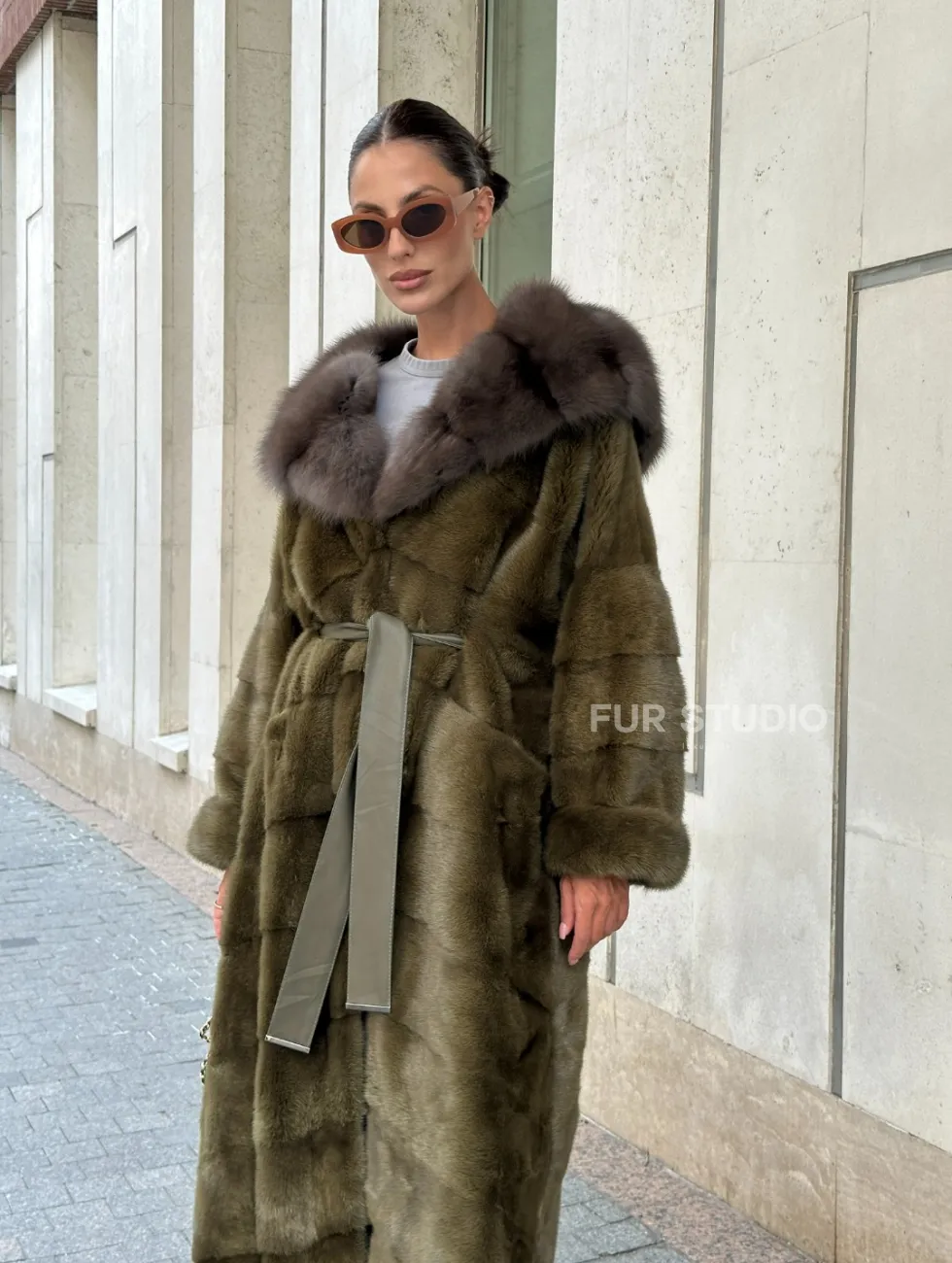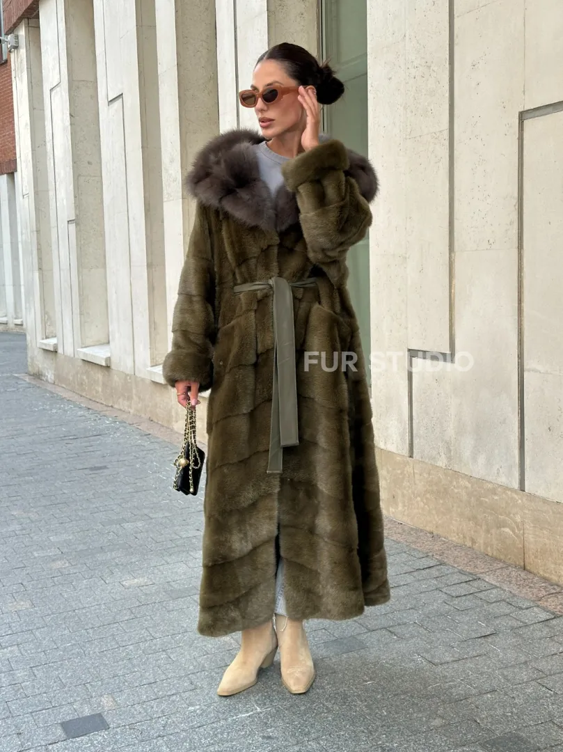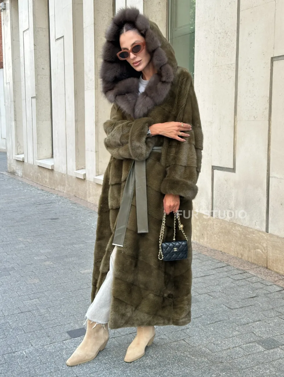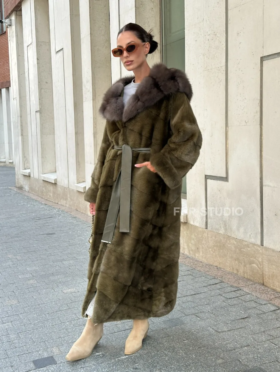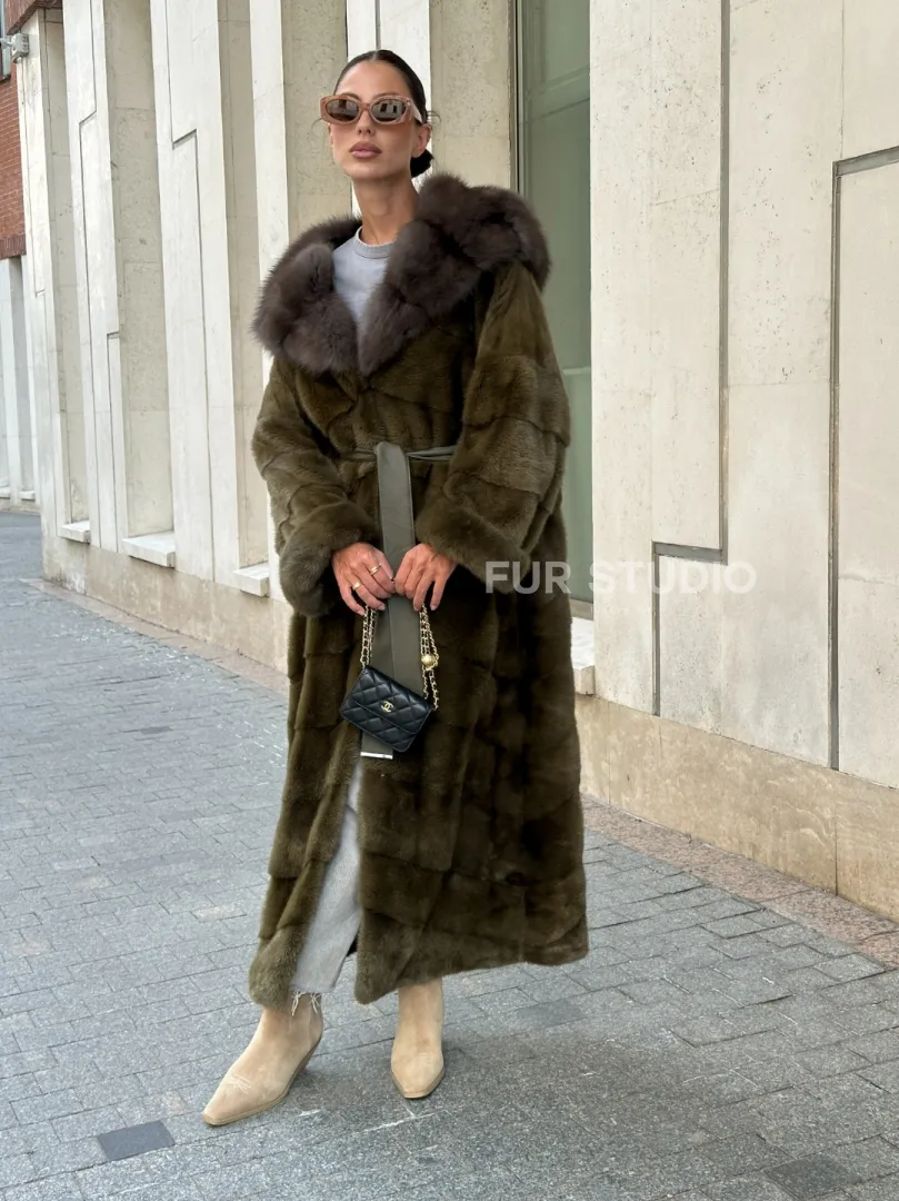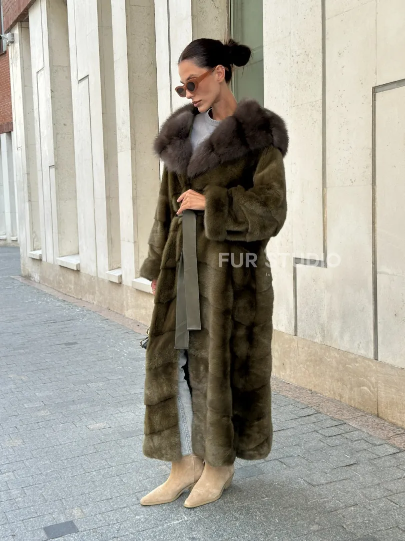 Норковая шуба зеленого цвета с капюшоном из меха куницы доступна для покупки в нашем шоуруме Furs Studio в Москве. У нас так же есть доставка во все города России. Добавьте немного роскоши в свой гардероб с этой шубой, которая будет служить вам многие годы.