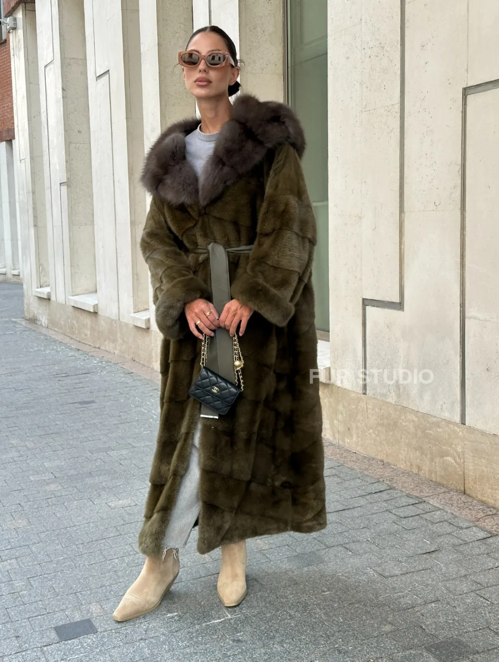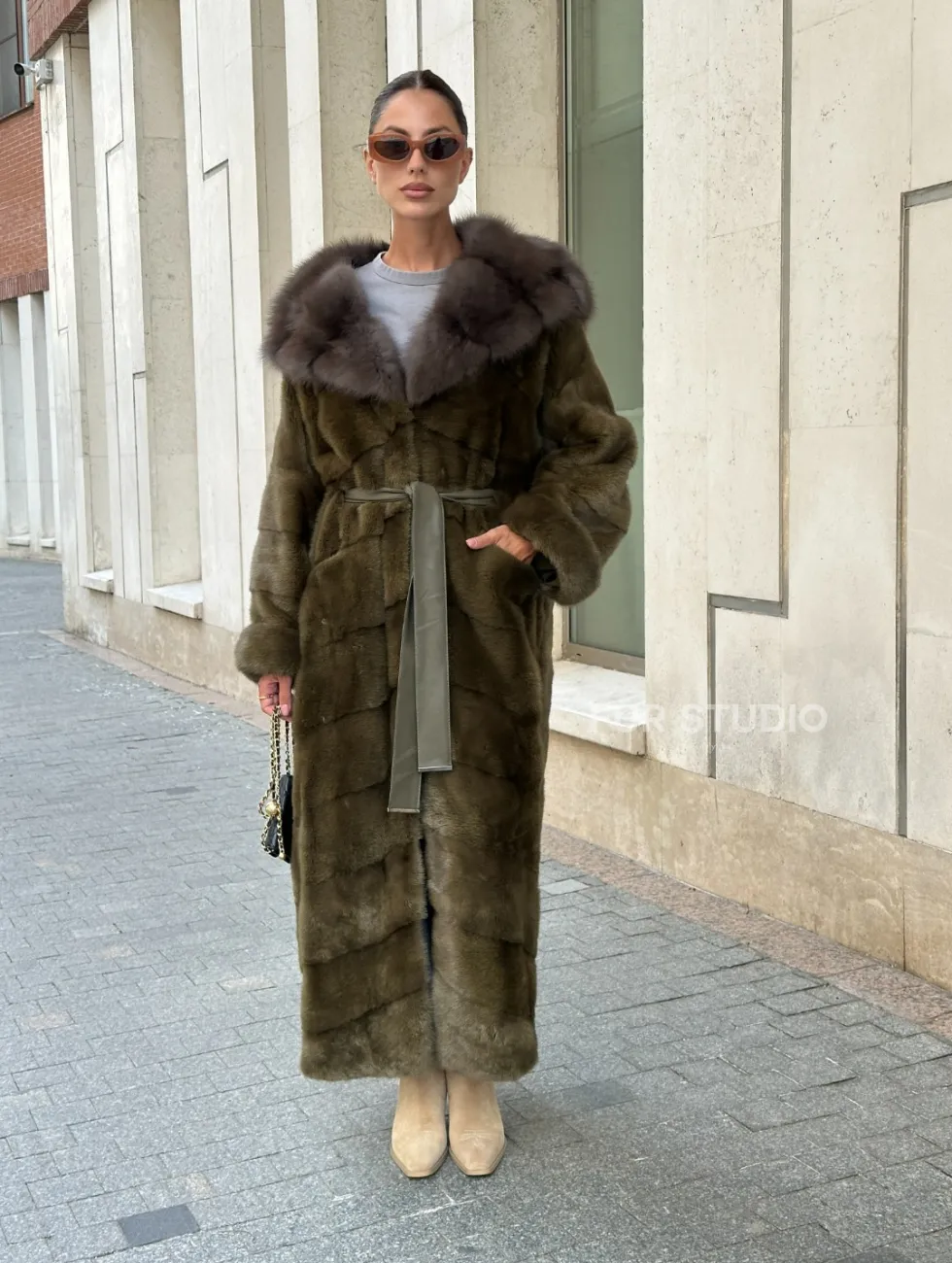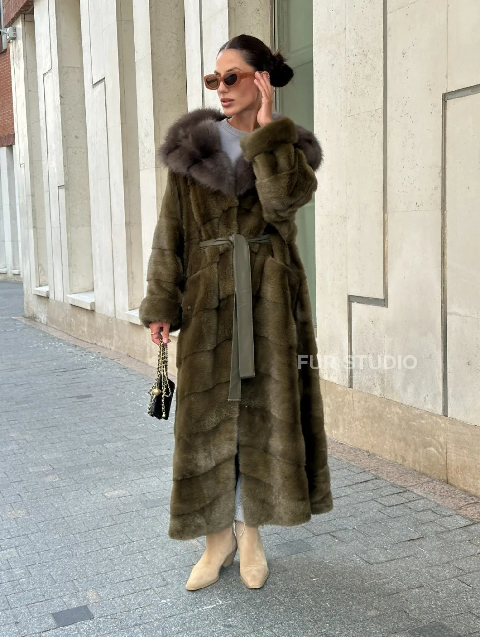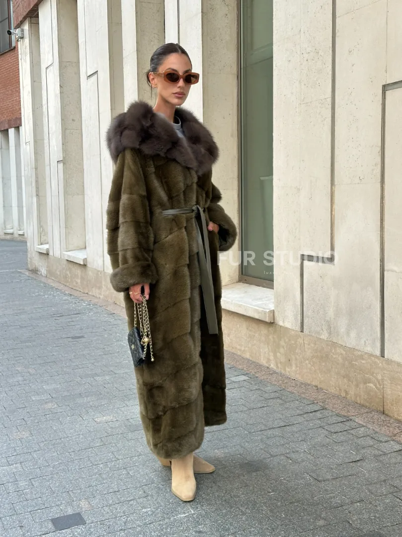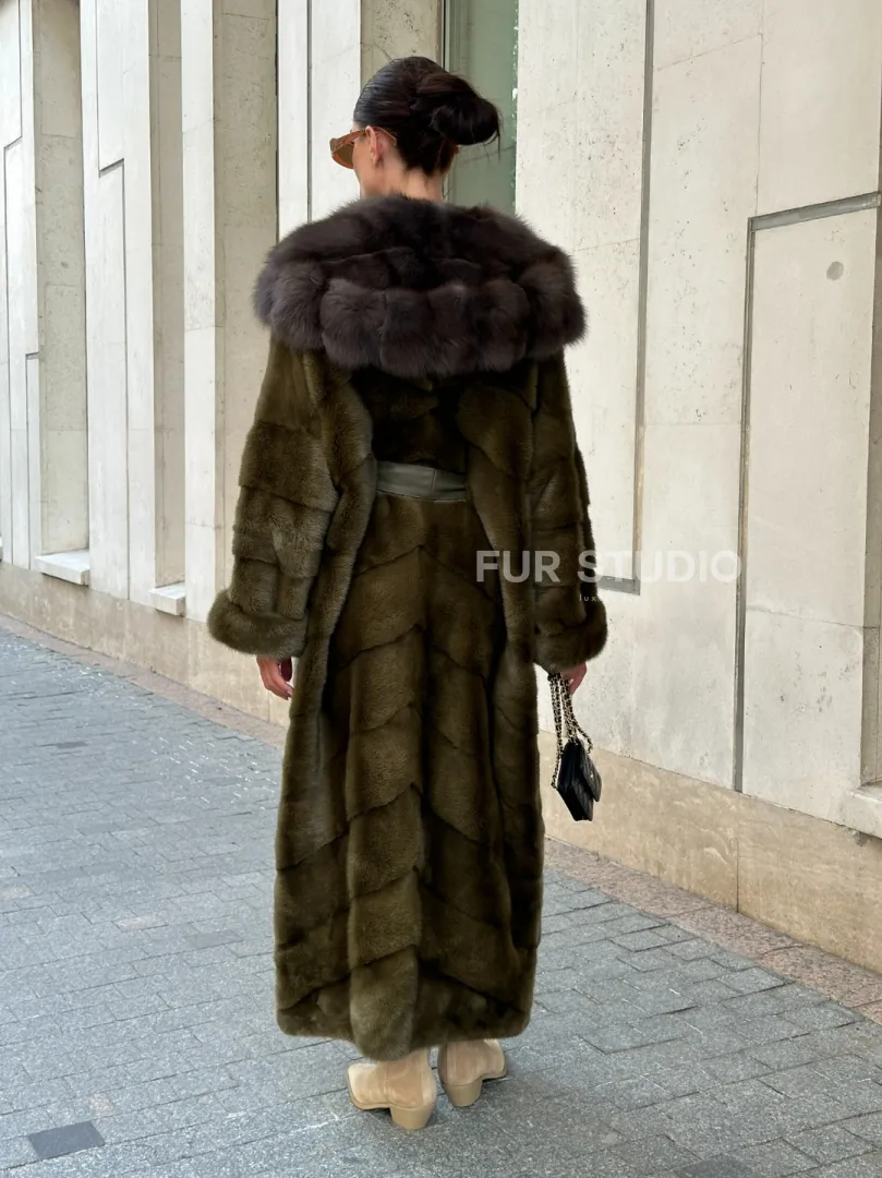 Норковая шуба зеленого цвета с капюшоном из меха куницы доступна для покупки в нашем шоуруме Furs Studio в Москве. У нас так же есть доставка во все города России. Добавьте немного роскоши в свой гардероб с этой шубой, которая будет служить вам многие годы.