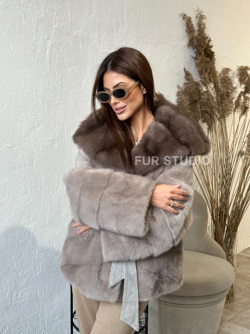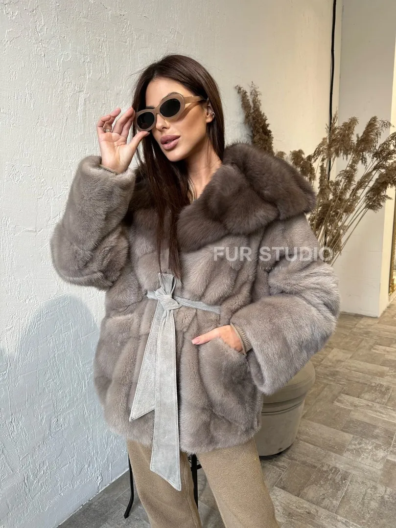 Длина оптимальна и не сковывает движений. Стильный пояс выделит талию и создаст силуэт “песочных часов”. Широкие рукава акцентируют внимание на тонких кистях, а удобные карманы позаботятся о комфортной температуре ручек. Купить норковое пончо-шубу с капюшоном из меха куницы в цвете пастель могут женщины с изысканным вкусом.