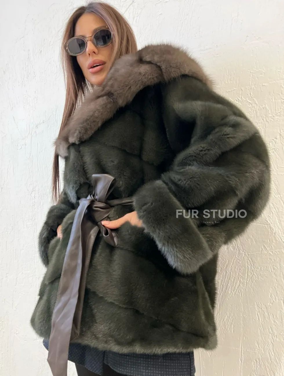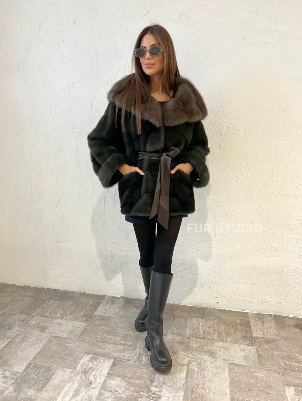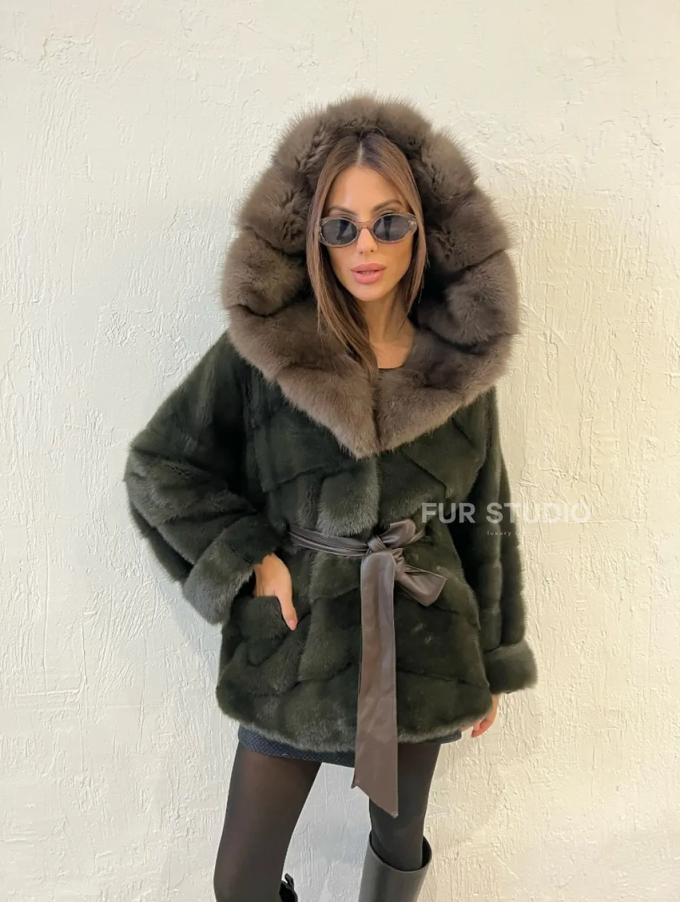Широкие манжеты выгодно подчеркнут изящность ручек. А удобные карманы согреют их в прохладную погоду. Широкий размерный ряд дает возможность купить верхнюю одежду девушкам любого типа фигуры и размера. Купить норковое пончо шубу с капюшоном из меха куницы - цвет оливковый могут лишь девушки с изысканным вкусом.