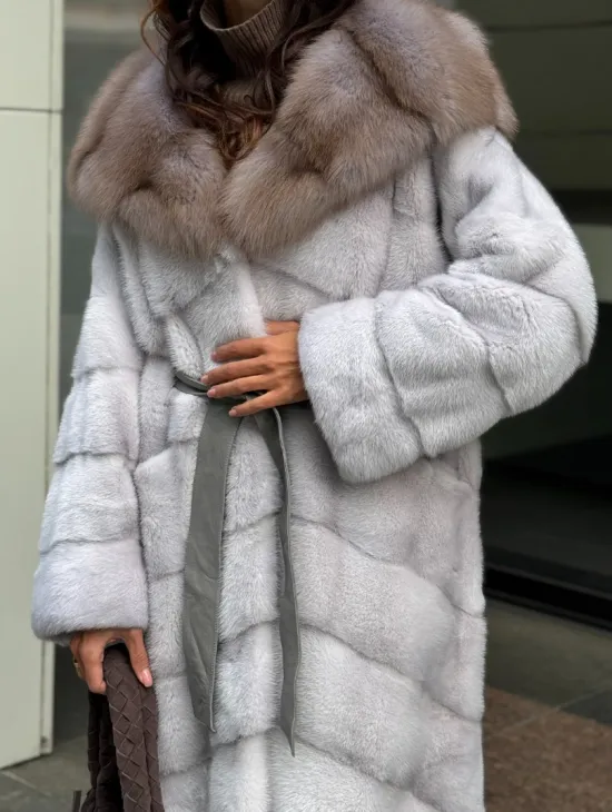 Мех данной шубы аукционная норка, цвет серый. Предлагается в размерах от 42 до 52. Длина модели 65-70 см, что выгодно подчеркивает фигуру девушек. Эта модель идеально подойдет для девушек и женщин, предпочитающих роскошные натуральные меха.