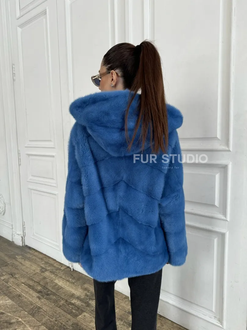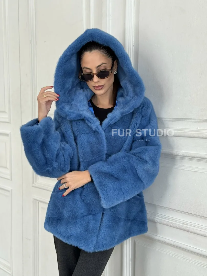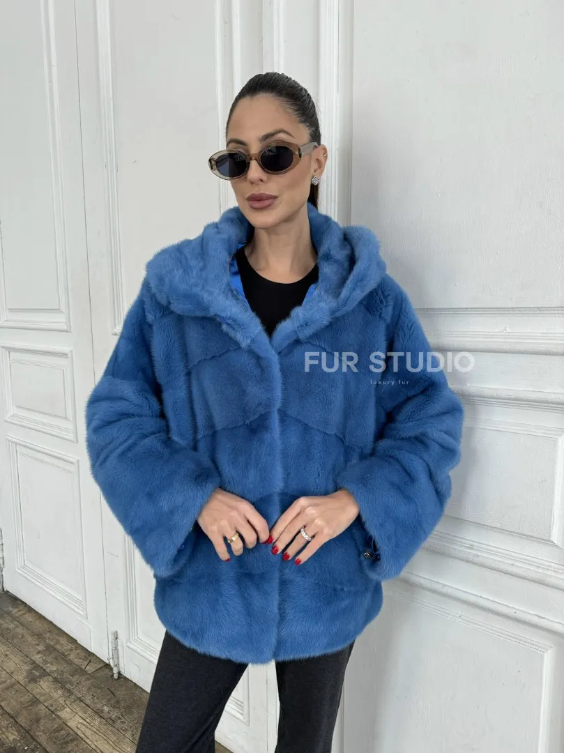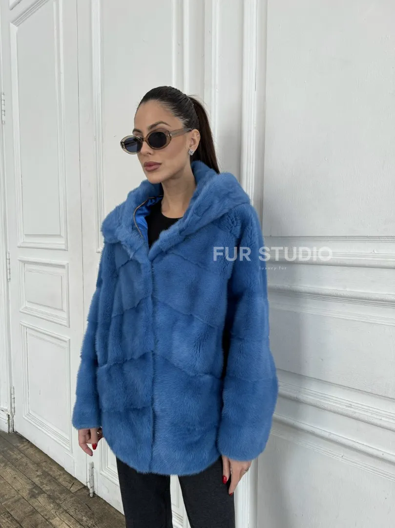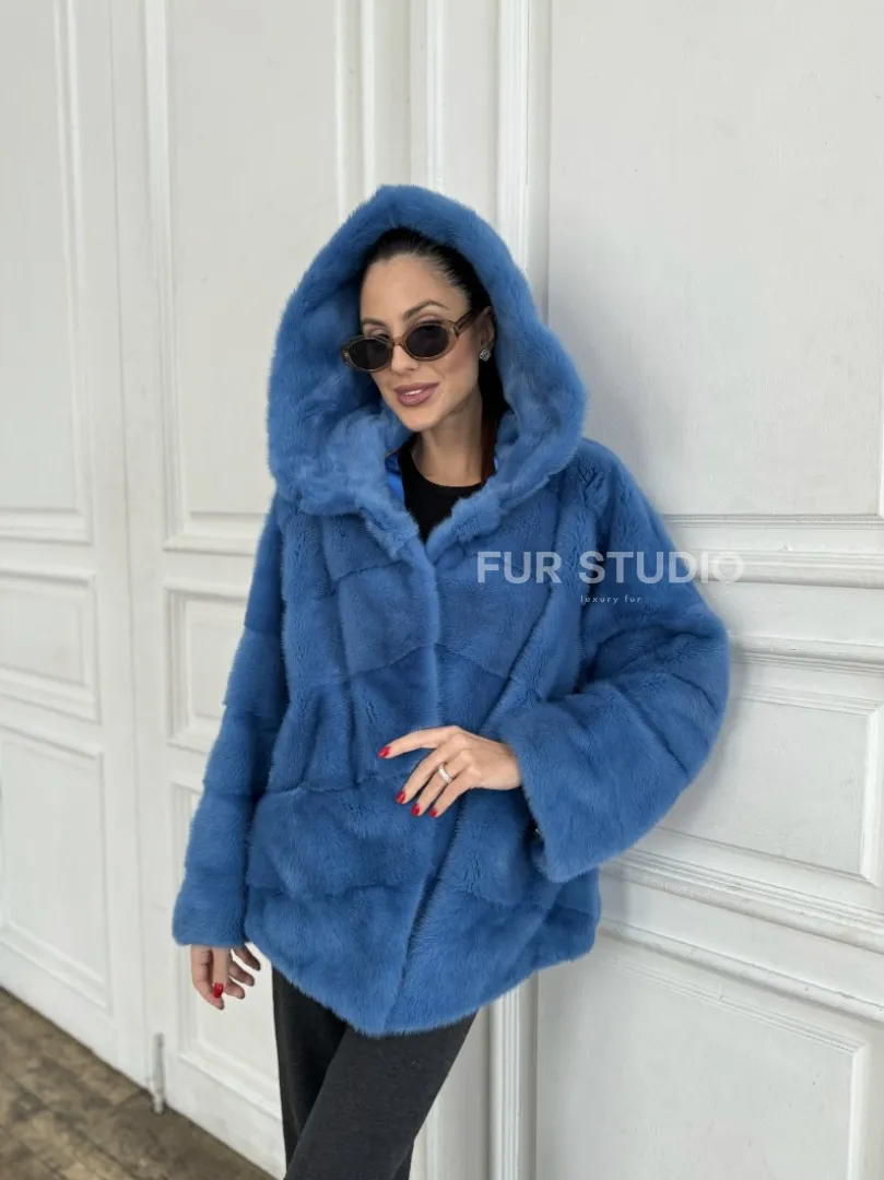 Норковый полушубок с капюшоном, паркет - цвет васильковый доступна для покупки в нашем шоуруме Furs Studio в Москве. У нас так же есть доставка во все города России. Добавьте немного роскоши в свой гардероб с этой шубой, которая будет служить вам многие годы.