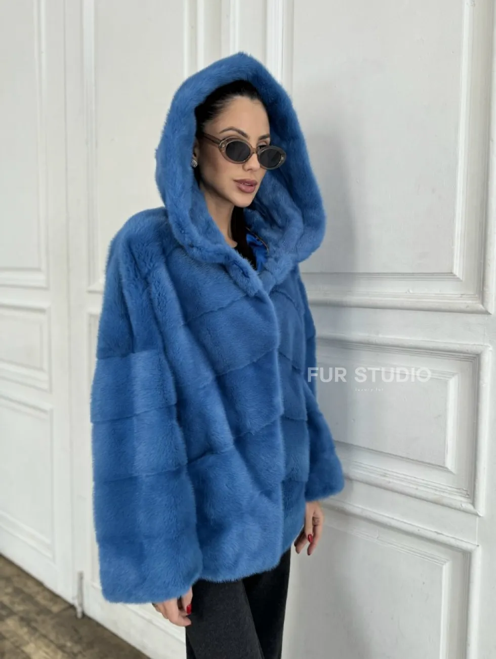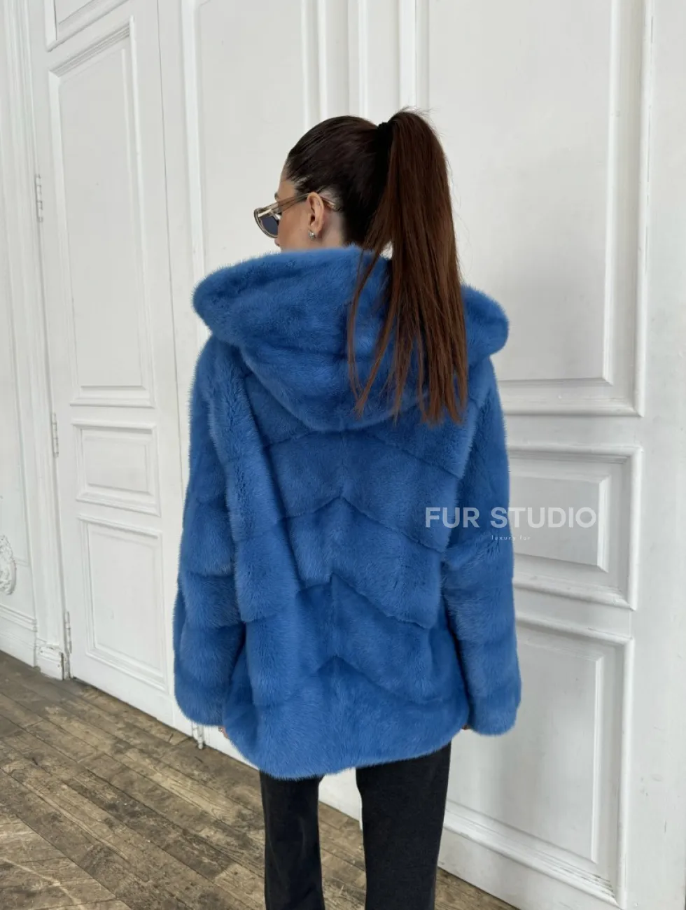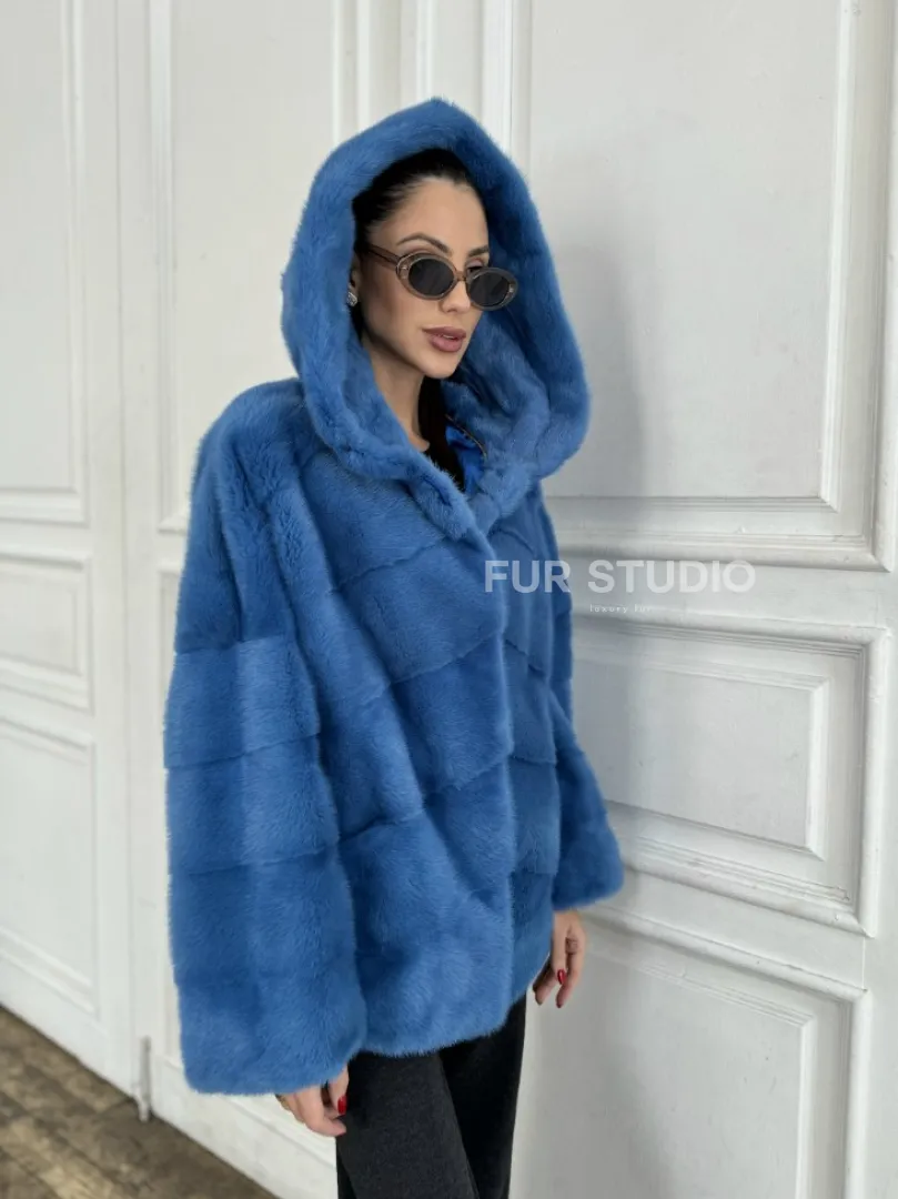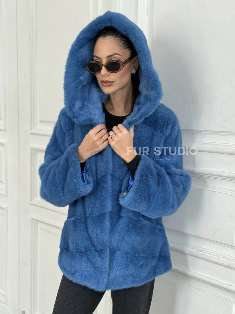 Норковый полушубок с капюшоном, паркет - цвет васильковый доступна для покупки в нашем шоуруме Furs Studio в Москве. У нас так же есть доставка во все города России. Добавьте немного роскоши в свой гардероб с этой шубой, которая будет служить вам многие годы.
