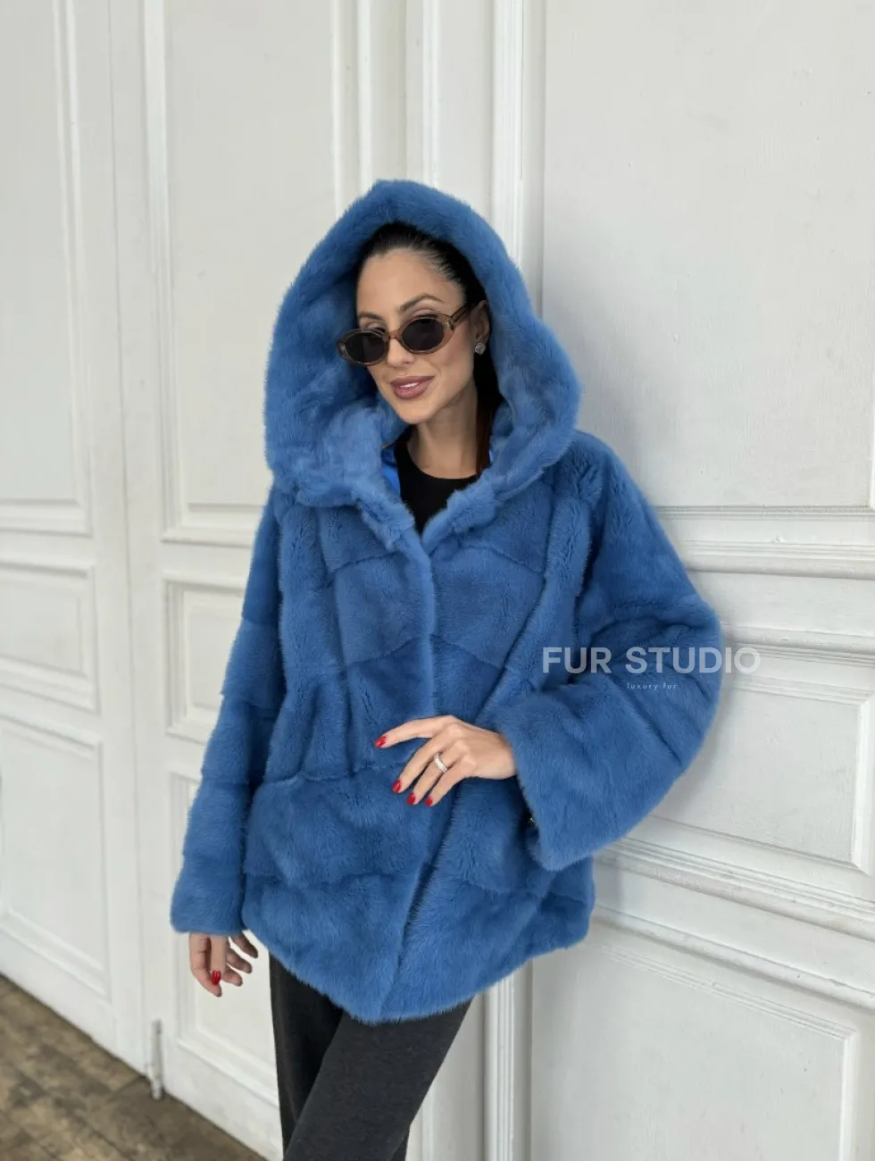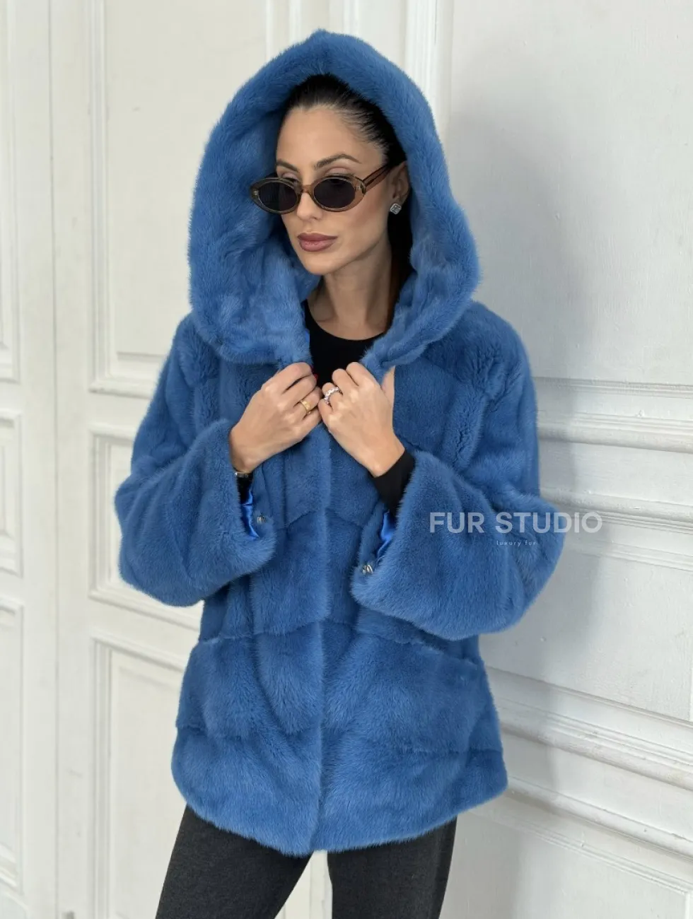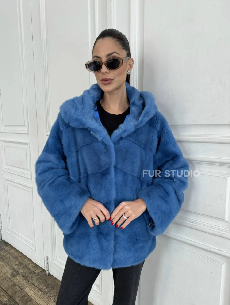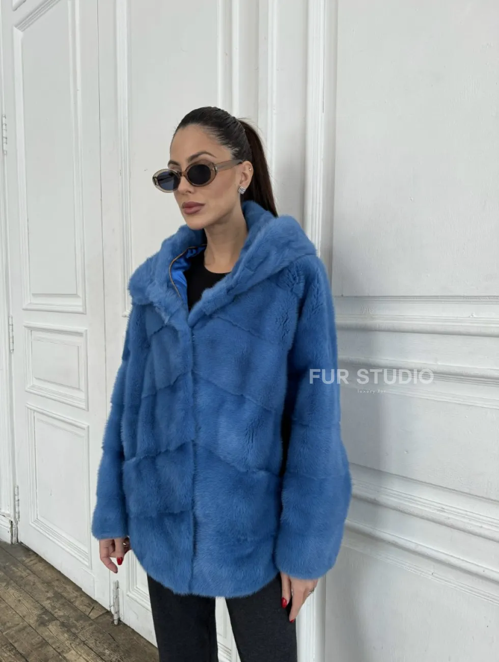 Норковый полушубок с капюшоном, паркет - цвет васильковый доступна для покупки в нашем шоуруме Furs Studio в Москве. У нас так же есть доставка во все города России. Добавьте немного роскоши в свой гардероб с этой шубой, которая будет служить вам многие годы.