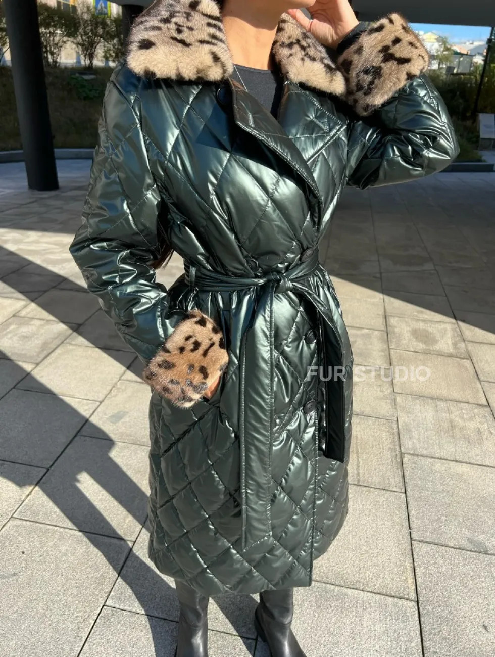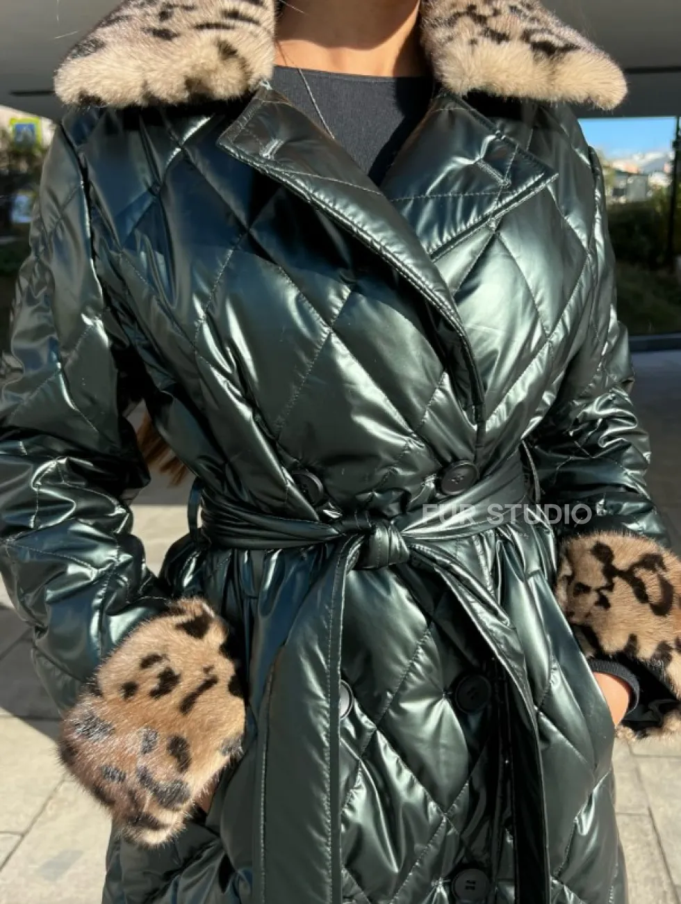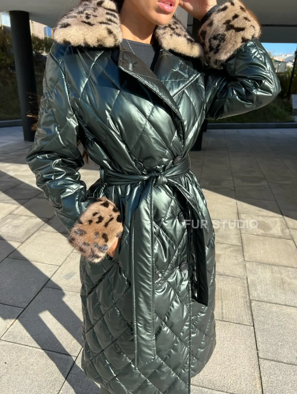 Роскошный воротник из норки выделит изящную шею. Меховые манжеты акцентируют внимание на тонкости кистей. Глубокие карманы не дадут замерзнуть ручкам. Оригинальный пояс очертит талию и сделает образ женственным. Купить пальто – пуховик с воротником из меха норки в цвете изумруд могут леди, предпочитающие выглядеть стильно и дорого в любое время года.