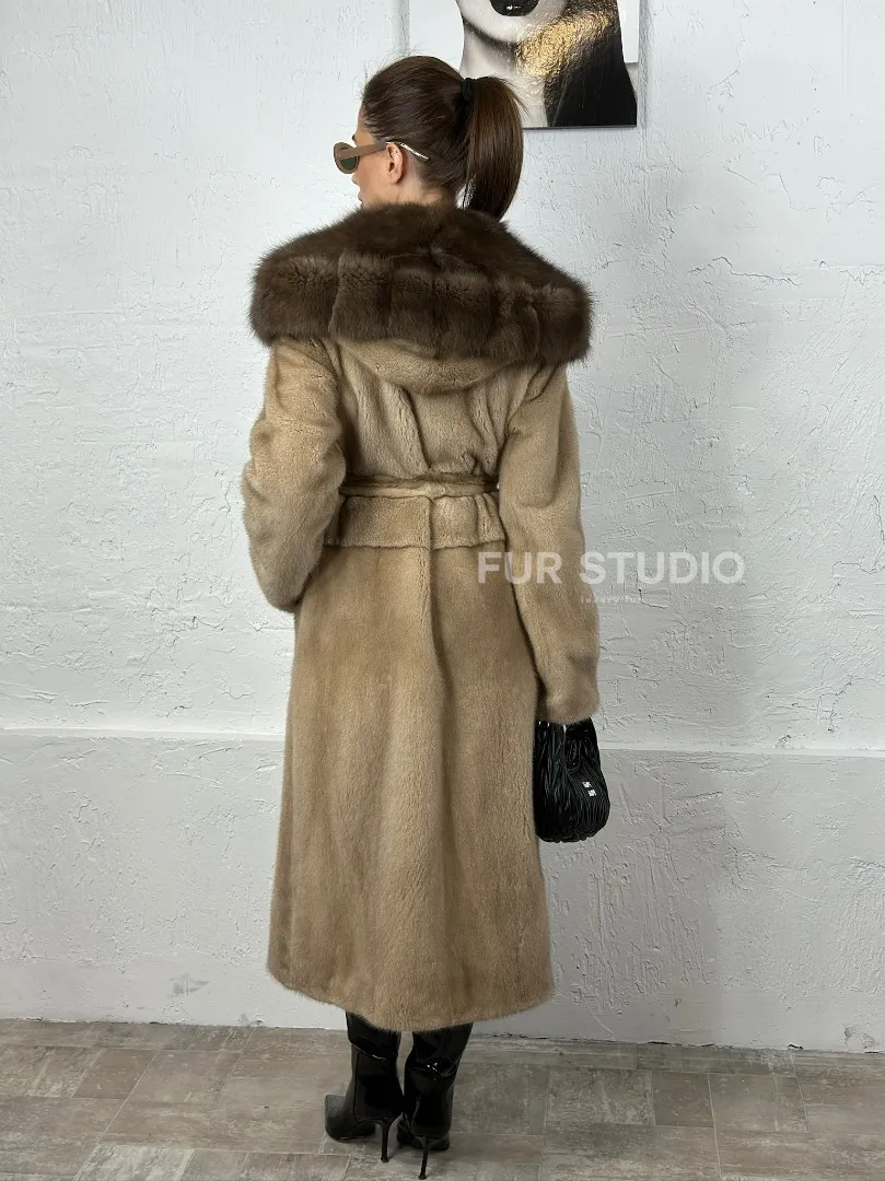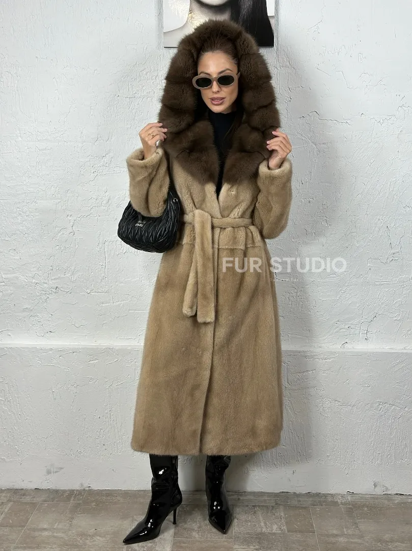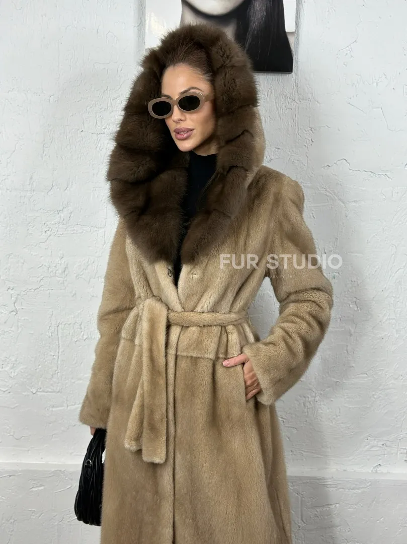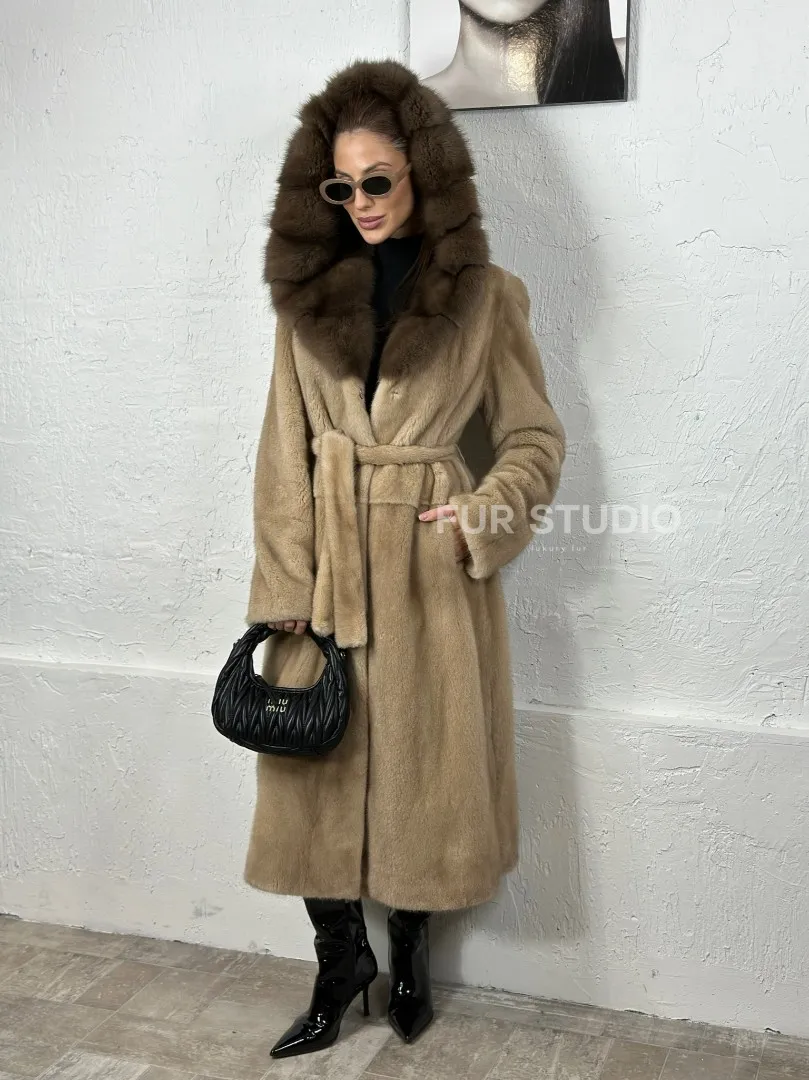 Песочная норковая шуба с капюшоном из куницы доступна для покупки в нашем шоуруме Furs Studio в Москве. У нас так же есть доставка во все города России. Добавьте немного роскоши в свой гардероб с этой шубой, которая будет служить вам многие годы.