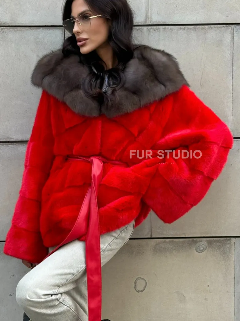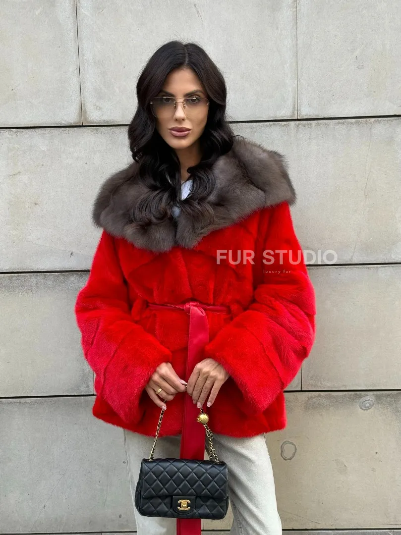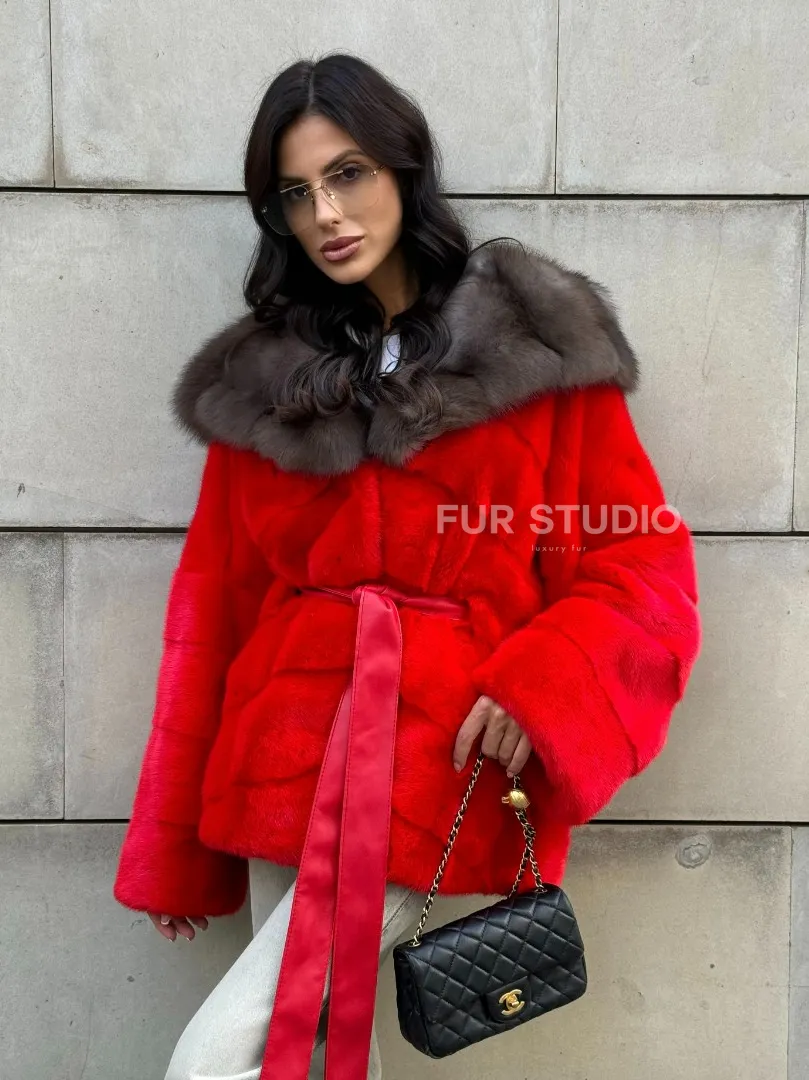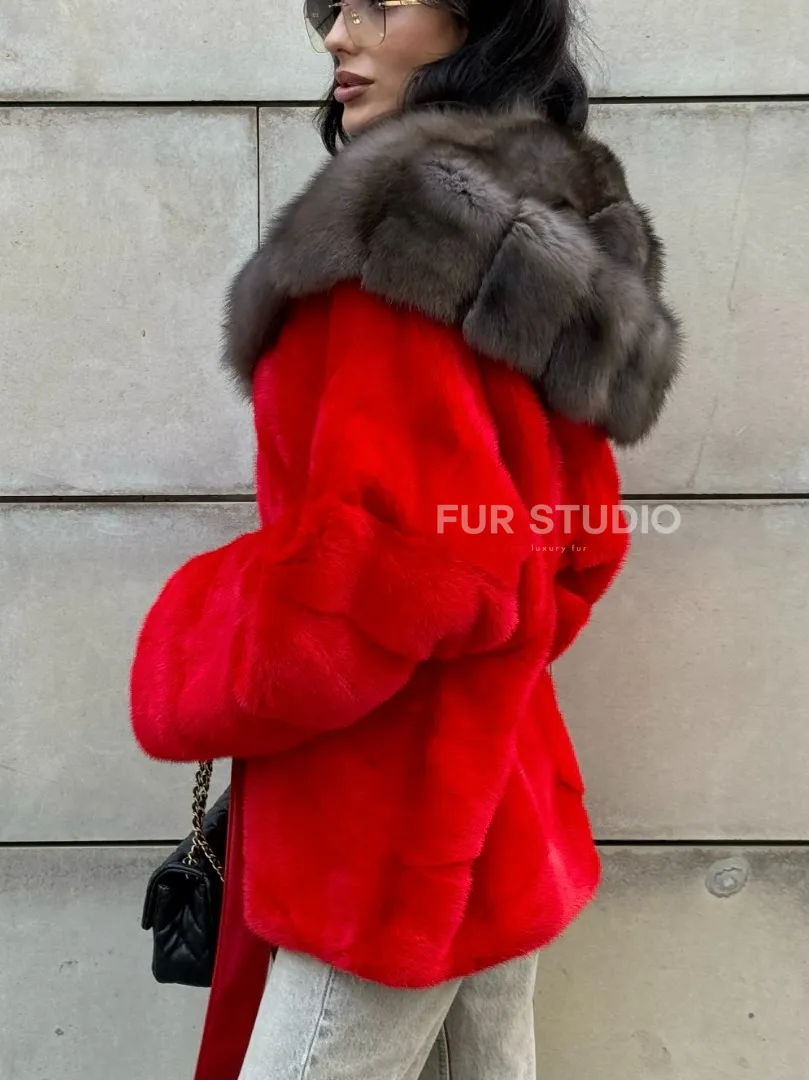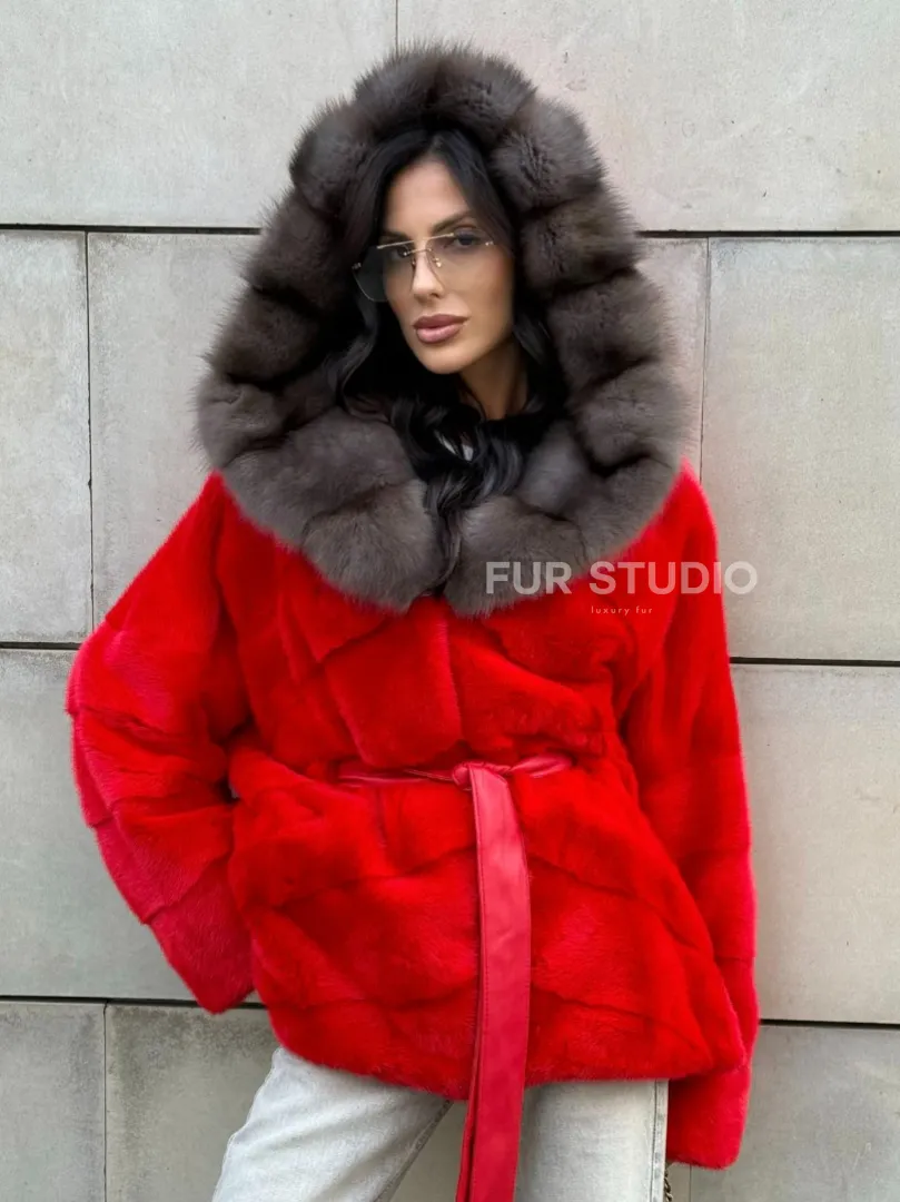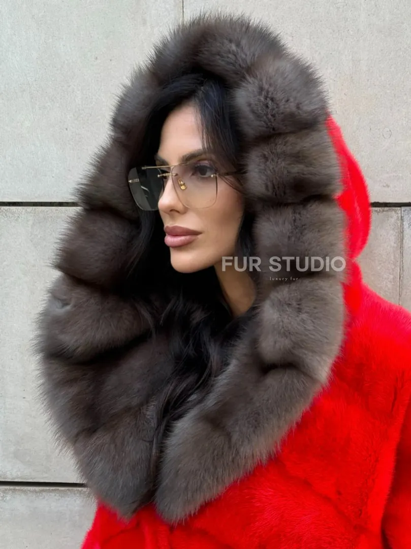 Полушубок из меха норки с капюшоном из куницы в карминовом цвете (красный) доступна для покупки в нашем шоуруме Furs Studio в Москве. У нас так же есть доставка во все города России. Добавьте немного роскоши в свой гардероб с этой шубой, которая будет служить вам многие годы.