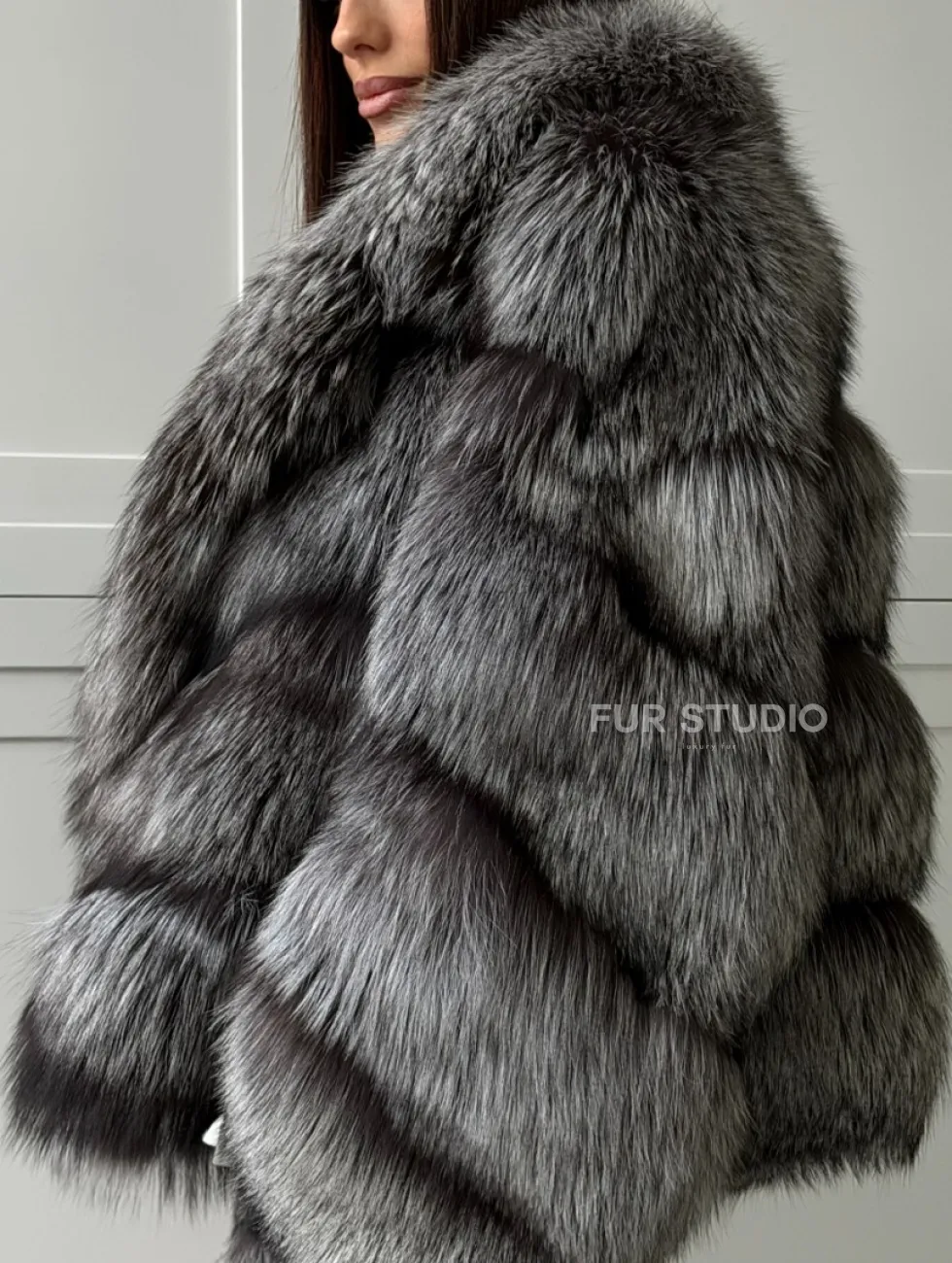 Мех данной шубы лиса, цвет серый. Предлагается в размерах от 42 до 48. Длина модели 55-60 см, что выгодно подчеркивает фигуру девушек. Эта модель идеально подойдет для девушек и женщин, предпочитающих роскошные натуральные меха.