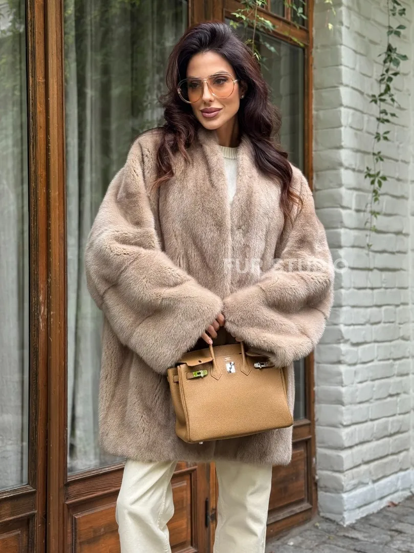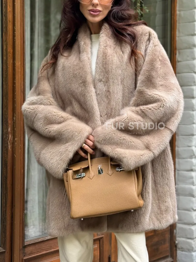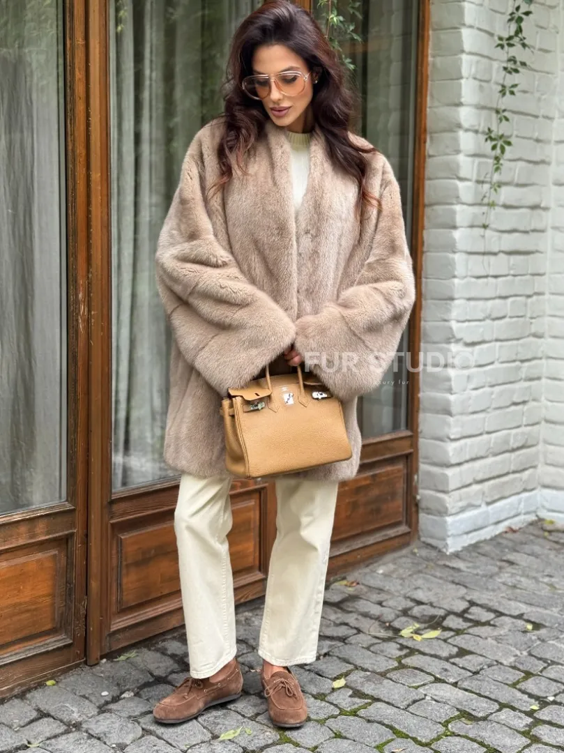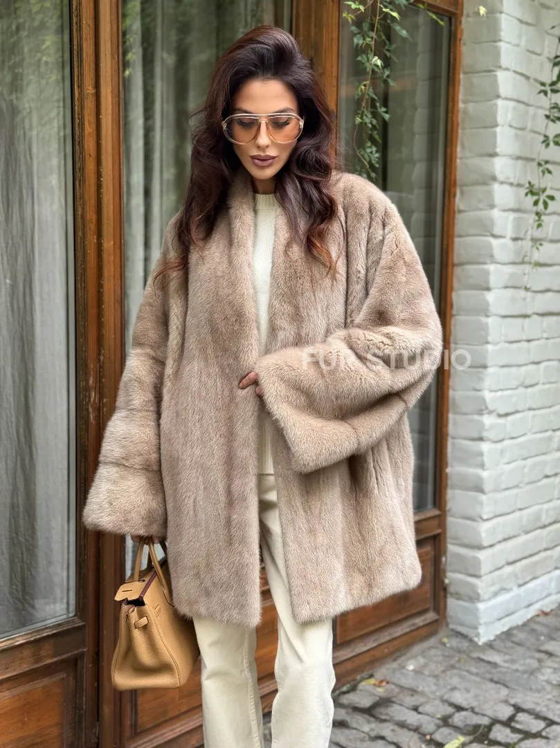 Мех данной шубы аукционная норка, цвет бежевый. Предлагается в размерах от 42 до 54. Длина модели 75-80 см, что выгодно подчеркивает фигуру девушек. Эта модель идеально подойдет для девушек и женщин, предпочитающих роскошные натуральные меха.