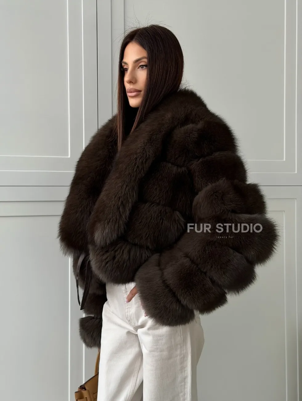 Мех данной шубы финский песец, цвет коричневый. Предлагается в размерах от 42 до 48. Длина модели 50-55 см, что выгодно подчеркивает фигуру девушек. Эта модель идеально подойдет для девушек и женщин, предпочитающих роскошные натуральные меха.