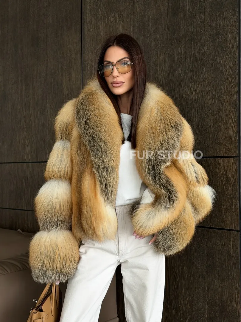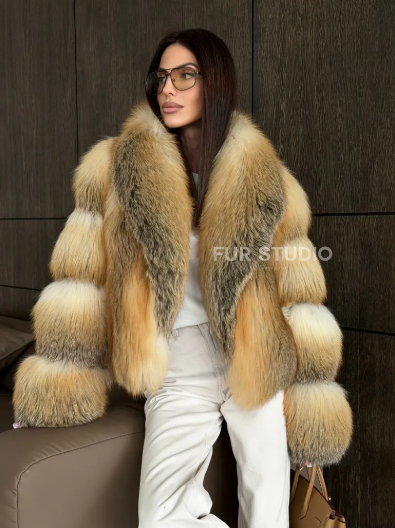 Мех данной шубы лиса, цвет рыжий. Предлагается в размерах от 42 до 50. Длина модели 50-55 см, что выгодно подчеркивает фигуру девушек. Эта модель идеально подойдет для девушек и женщин, предпочитающих роскошные натуральные меха.