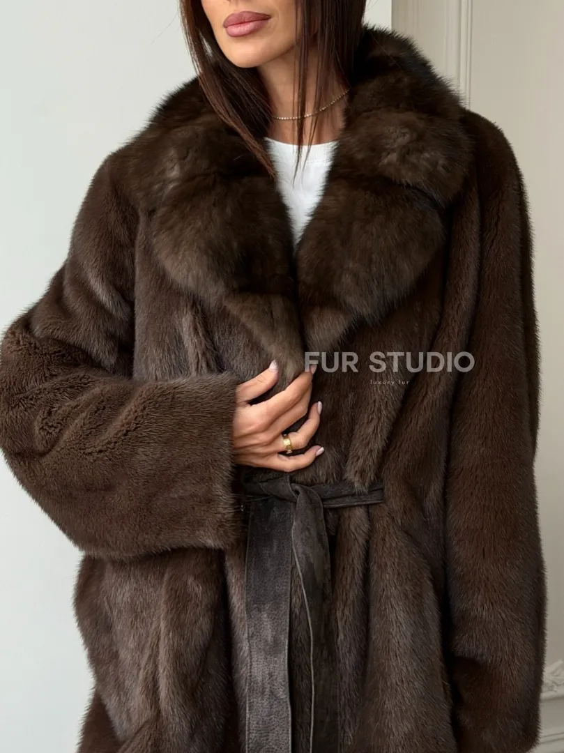 Мех данной шубы аукционная норка , цвет коричневый. Предлагается в размерах от 42 до 58. Длина модели 75-80 см, что выгодно подчеркивает фигуру девушек. Эта модель идеально подойдет для девушек и женщин, предпочитающих роскошные натуральные меха.