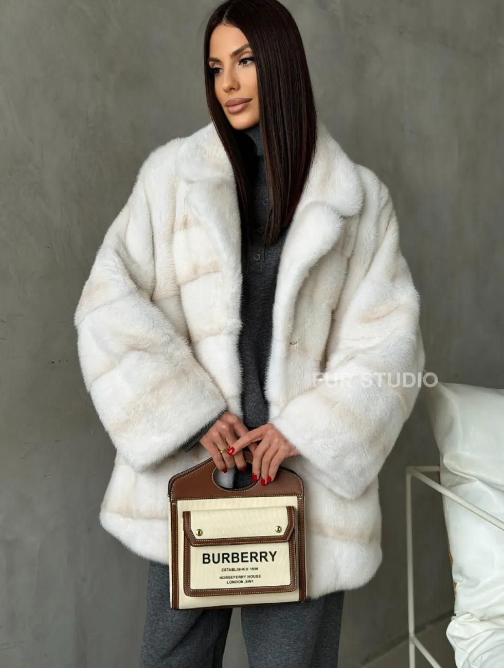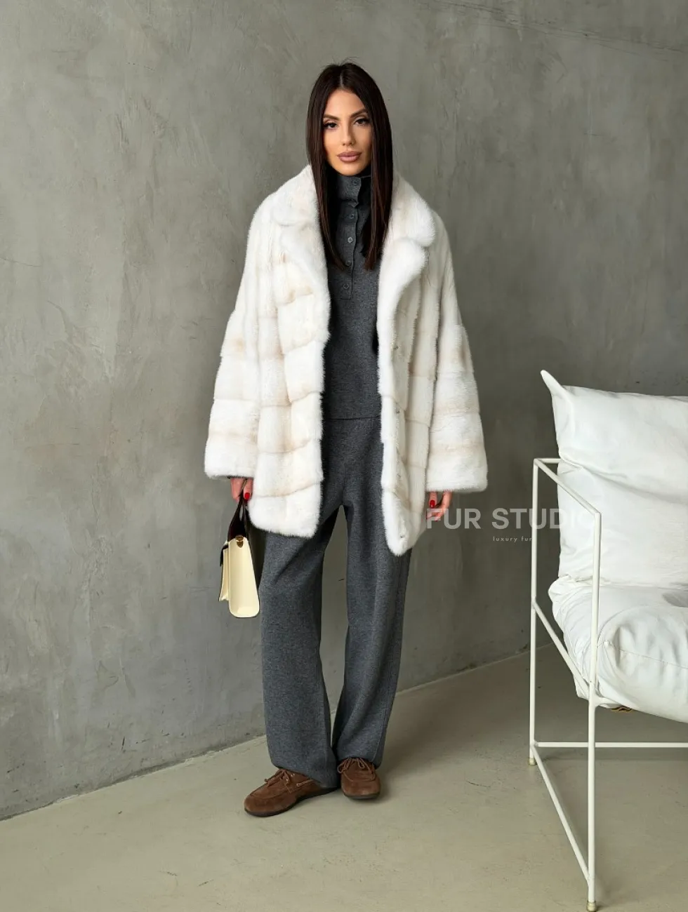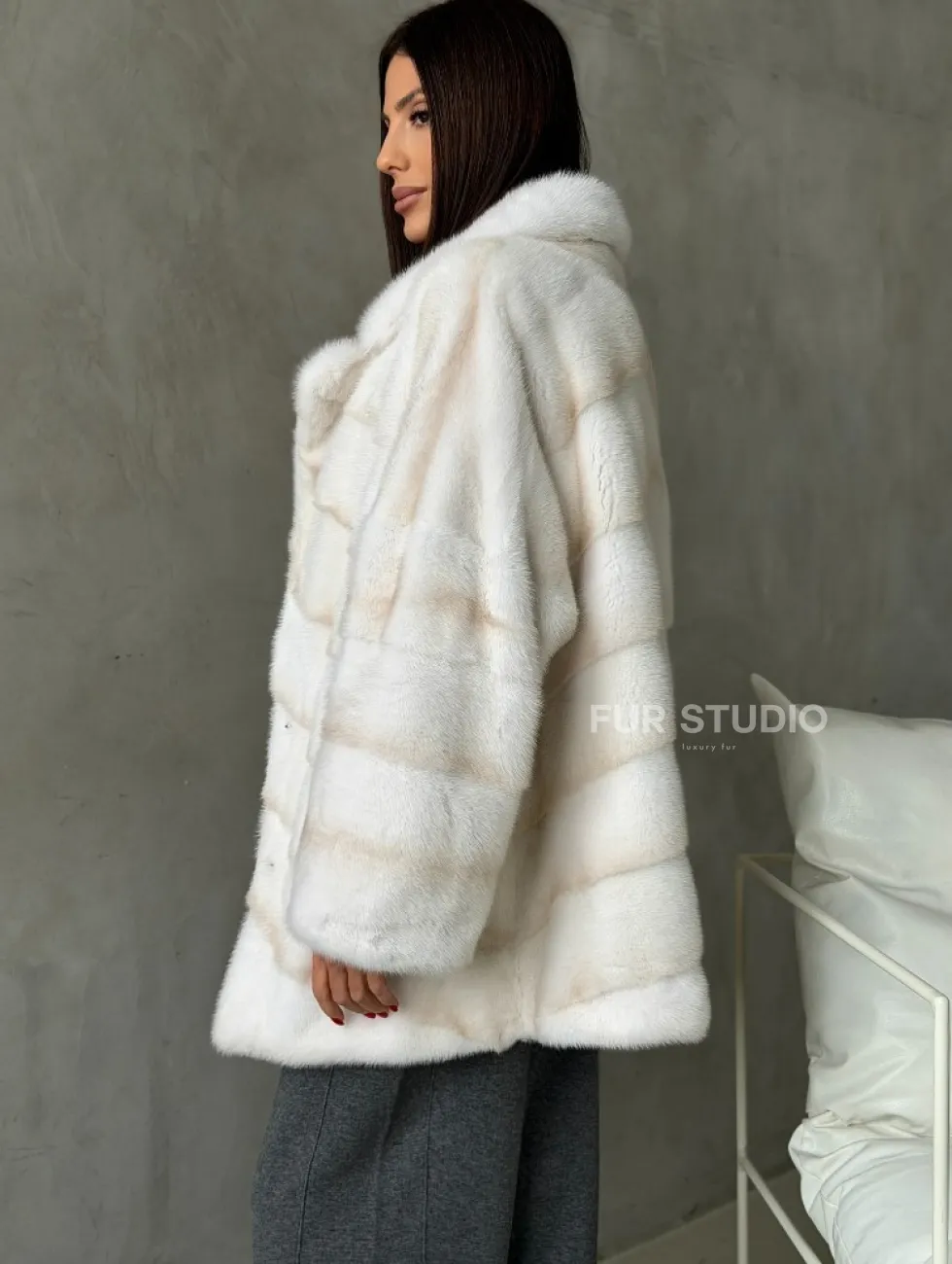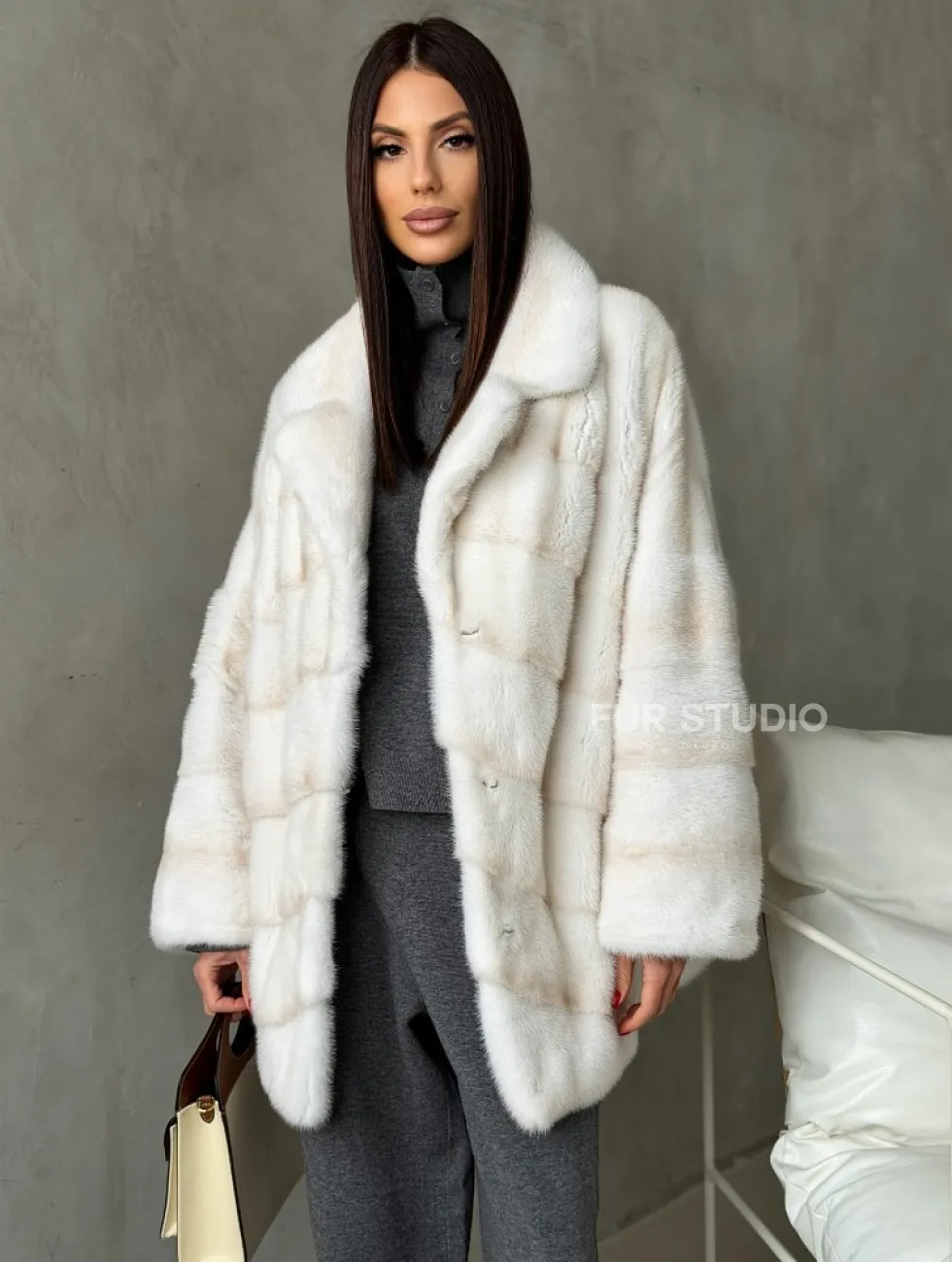 Мех данной шубы аукционная норка, цвет белый. Предлагается в размерах от 42 до 50. Длина модели 70-75 см, что выгодно подчеркивает фигуру девушек. Эта модель идеально подойдет для девушек и женщин, предпочитающих роскошные натуральные меха.