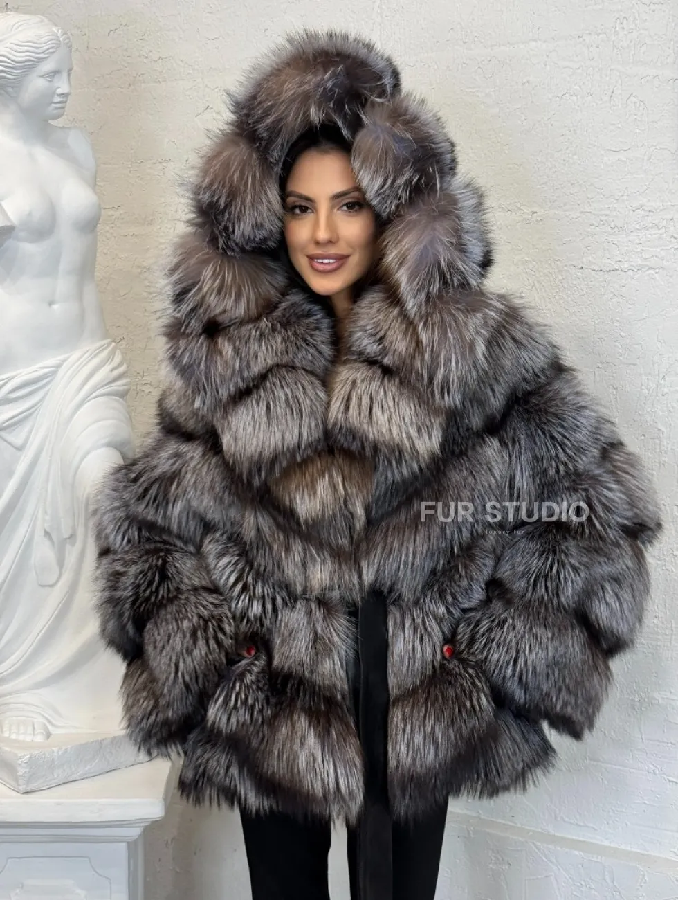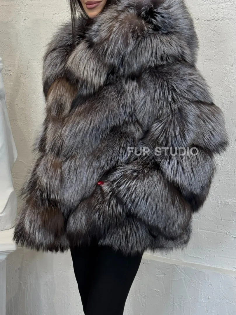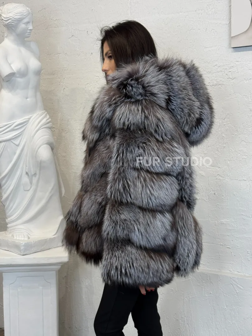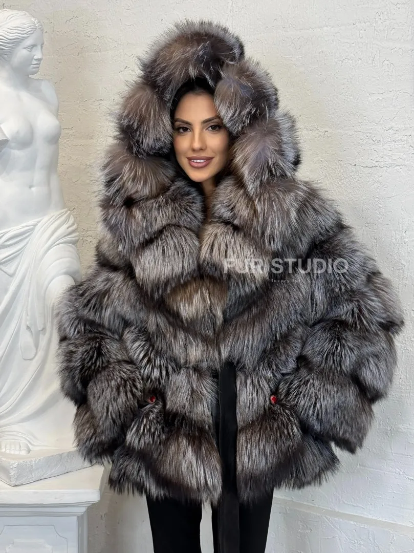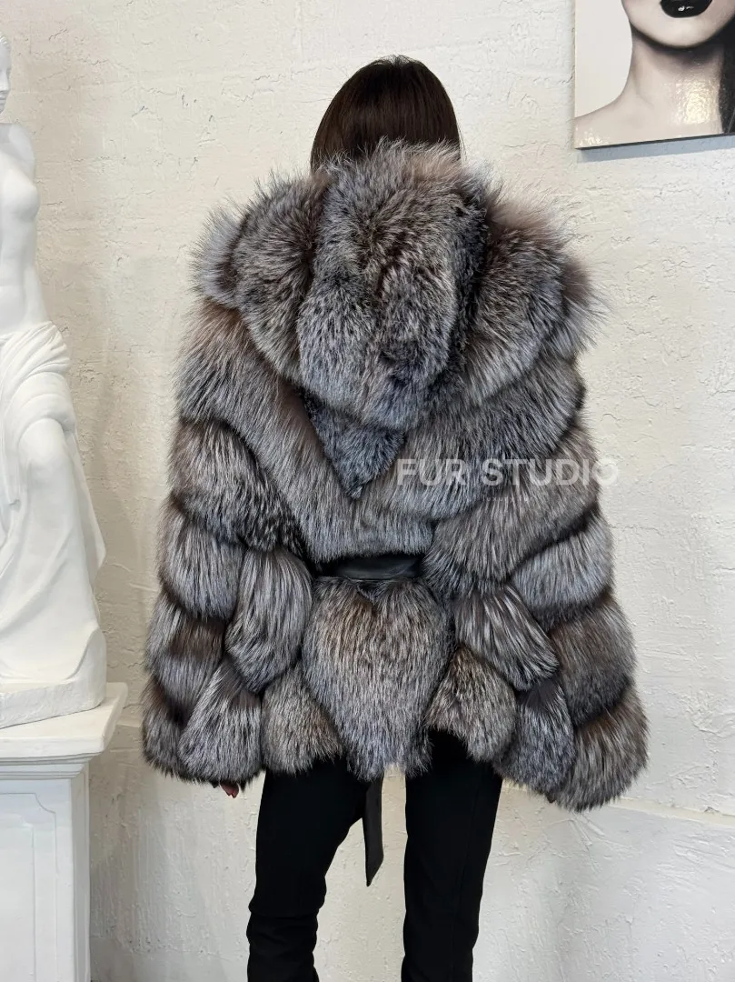 Полушубок с капюшоном из натурального меха лисы чернобурки с поясом доступна для покупки в нашем шоуруме Furs Studio в Москве. У нас так же есть доставка во все города России. Добавьте немного роскоши в свой гардероб с этой шубой, которая будет служить вам многие годы.