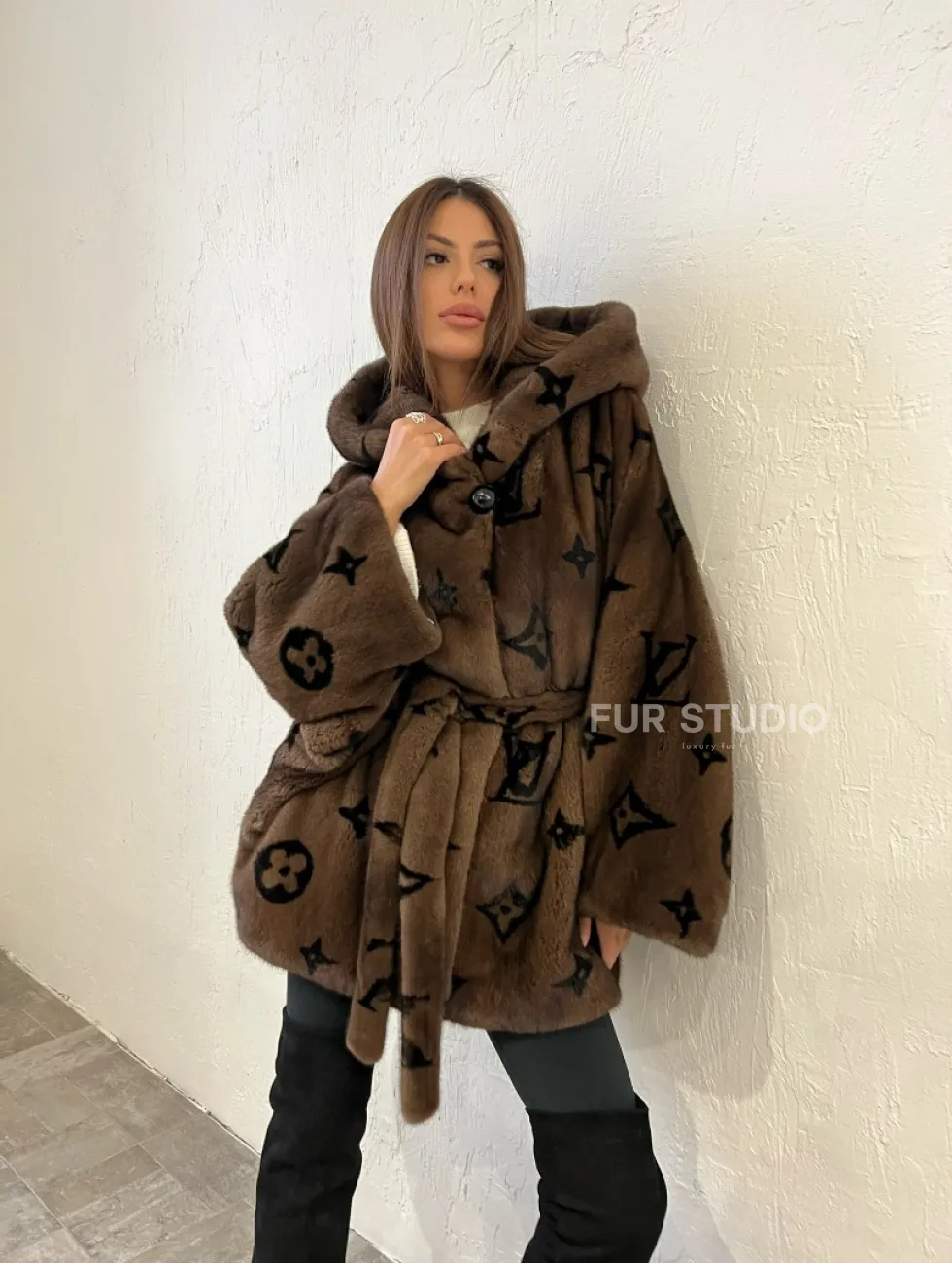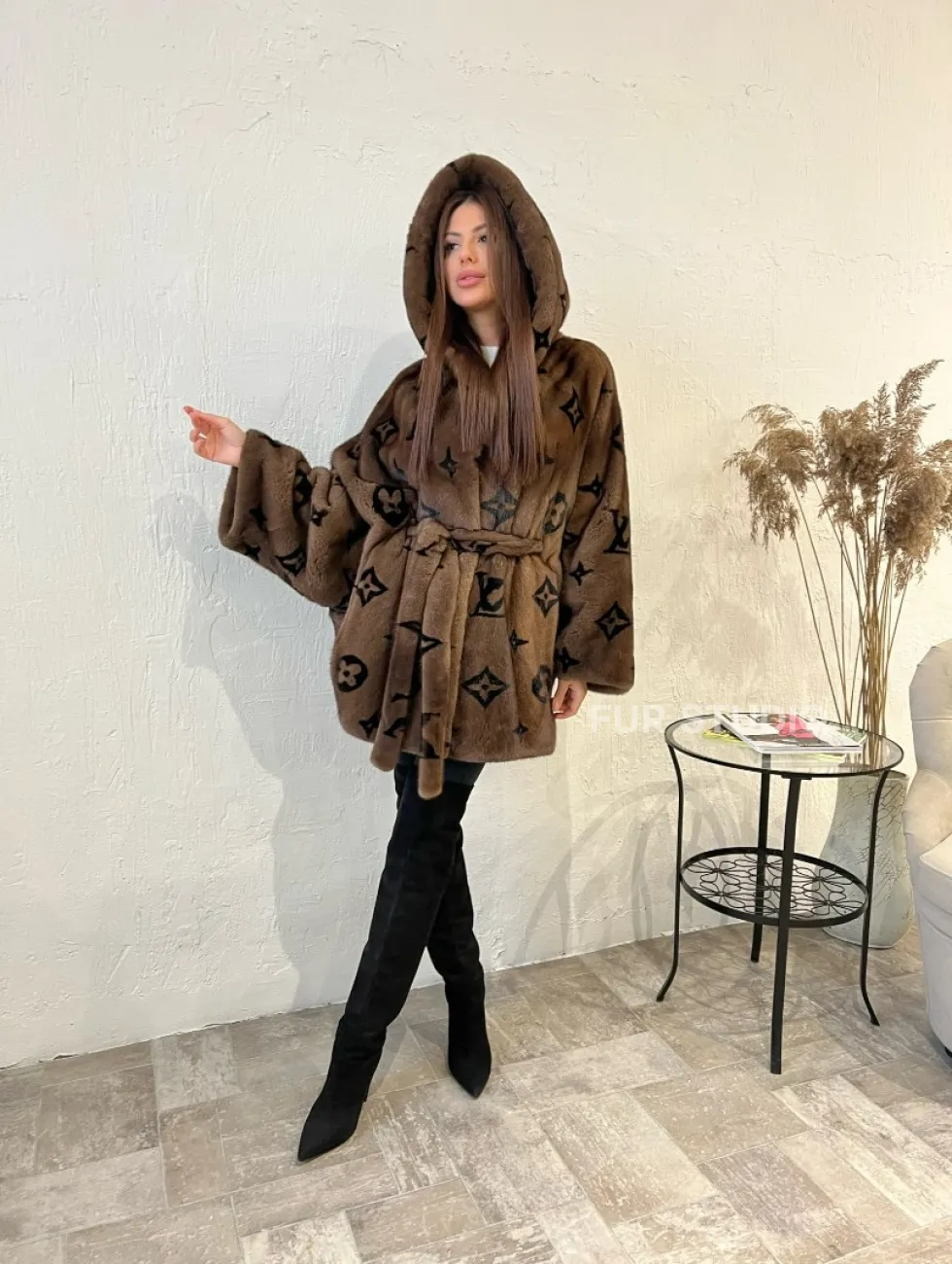 Пончо - шуба из плюшевой норки VELVET с капюшоном - цвет соболь - выбор стильных девушек. Оригинальный принт изделия создает изысканный и необычный образ. Теплый мех бережно согреет владелицу в холодное время года. Свободный крой не сковывает движений и скрывает недостатки фигуры. Роскошный капюшон сохранит укладку и не даст замерзнуть голове в непогоду.