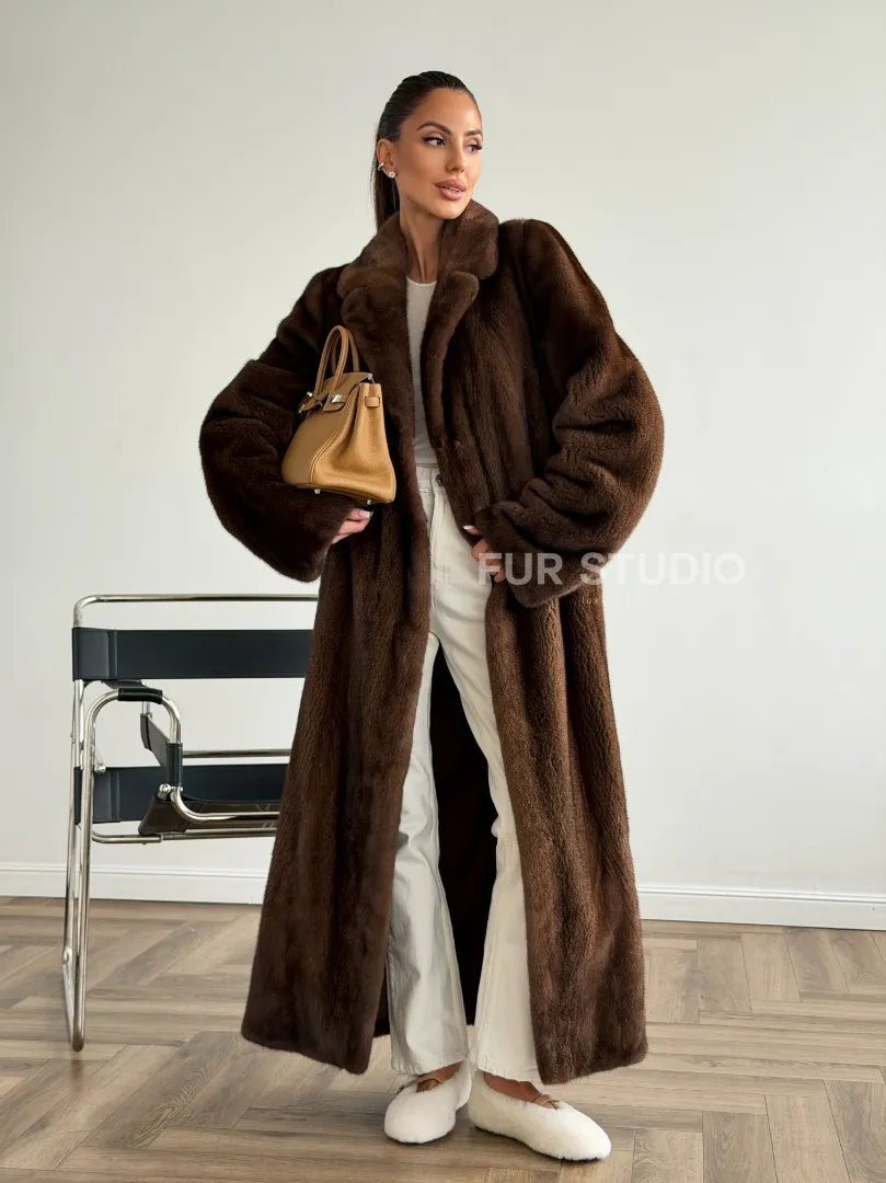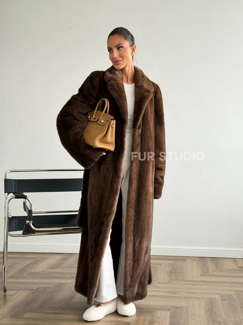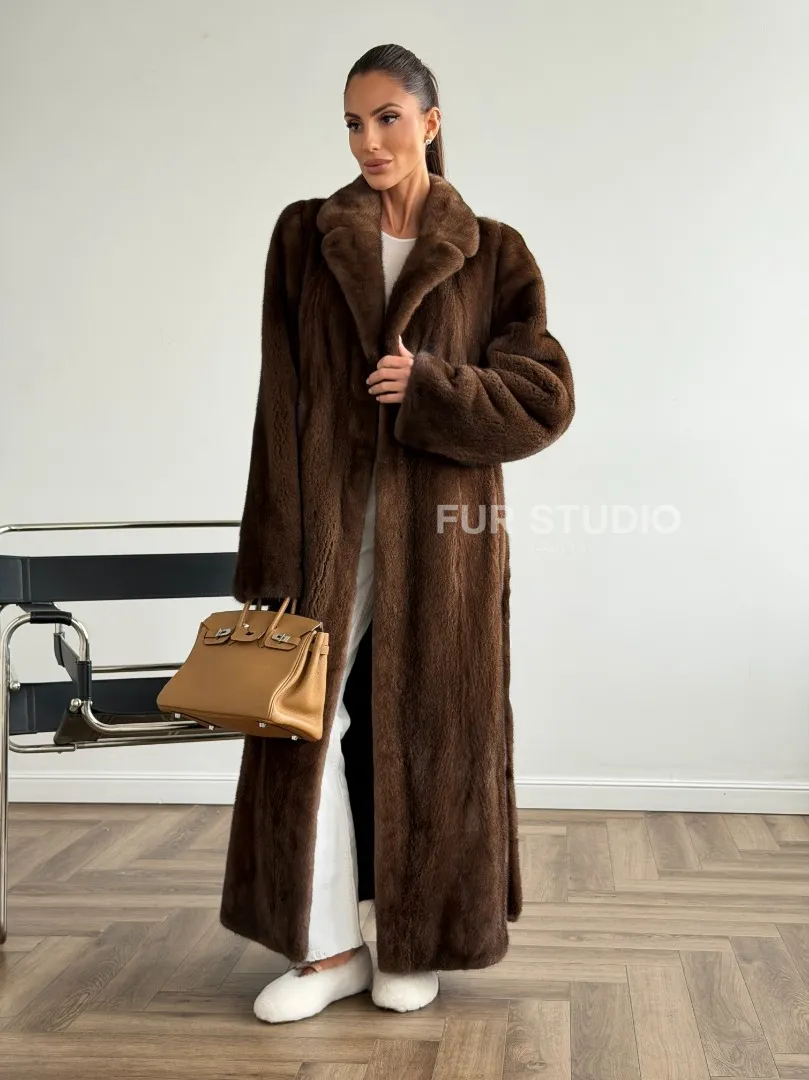 Мех данной шубы аукционная норка , цвет коричневый. Предлагается в размерах от 42 до 48. Длина модели 125-130 см, что выгодно подчеркивает фигуру девушек. Эта модель идеально подойдет для девушек и женщин, предпочитающих роскошные натуральные меха.