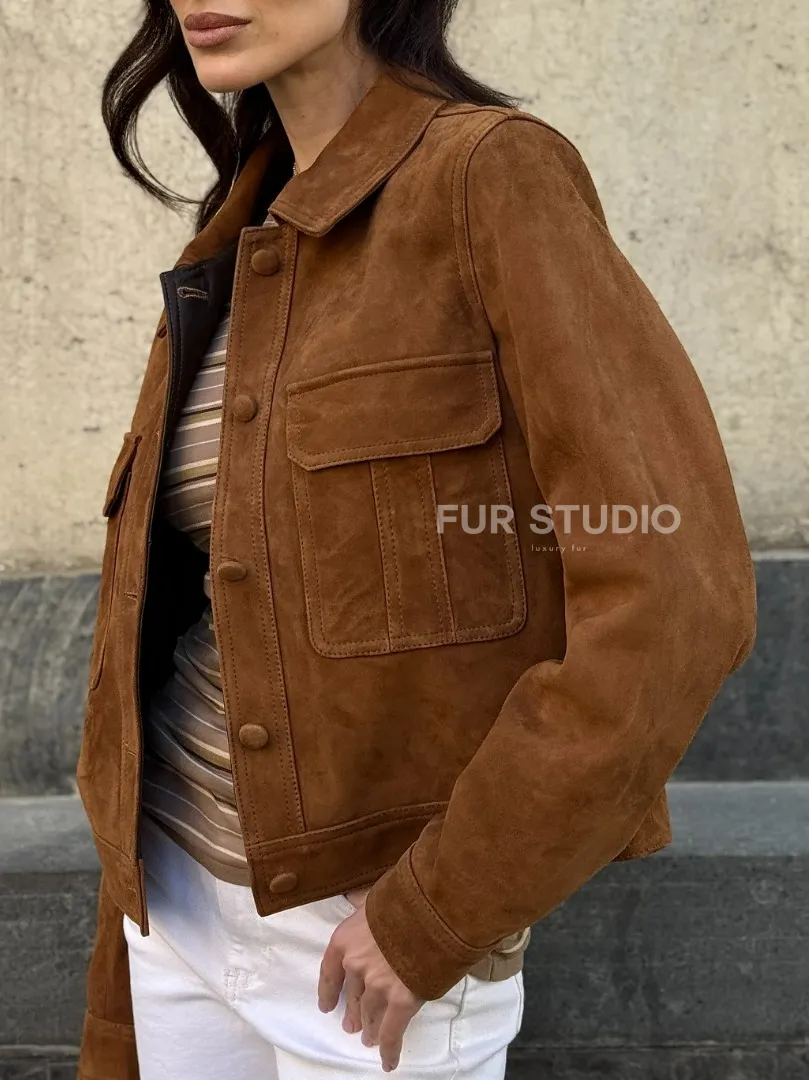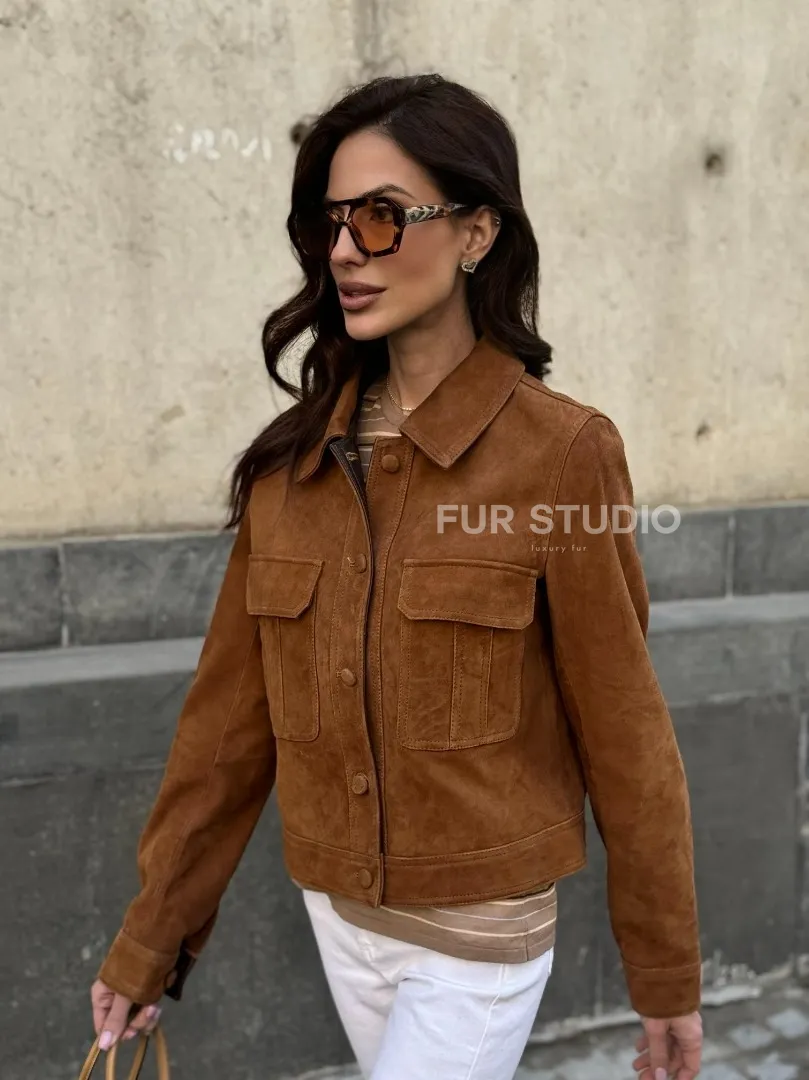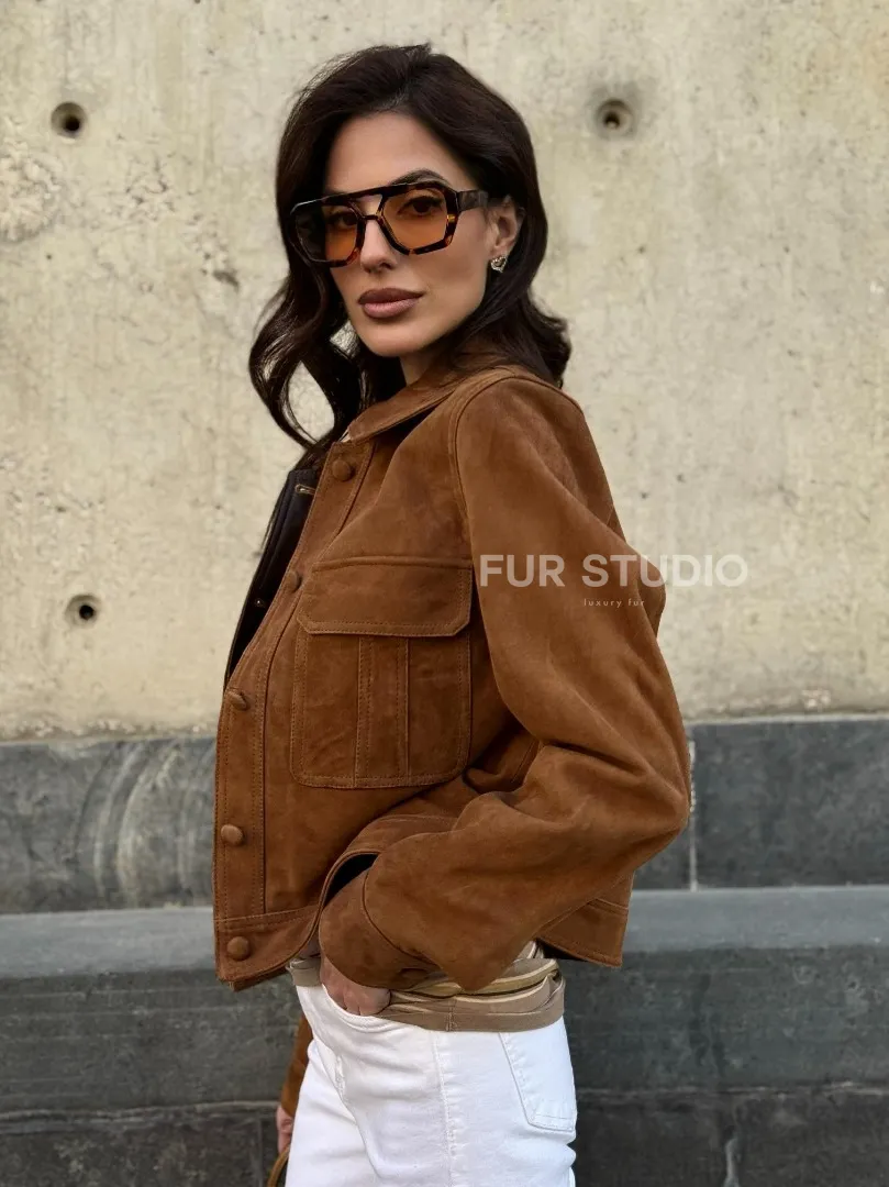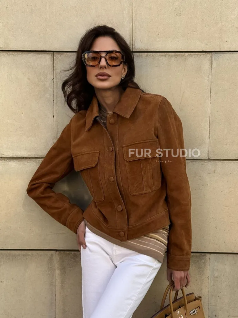 Прямой жакет из натуральной замши с накладными карманами доступна для покупки в нашем шоуруме Furs Studio в Москве, где также предоставляется удобная доставка во все города России.