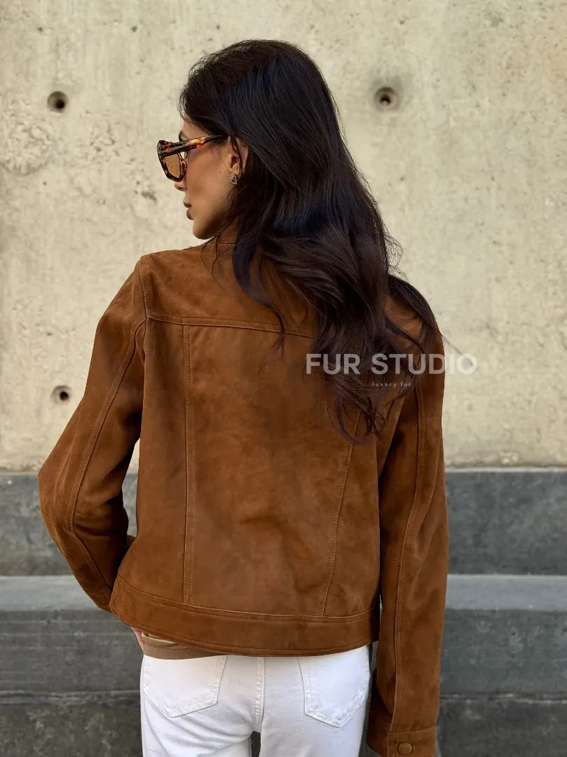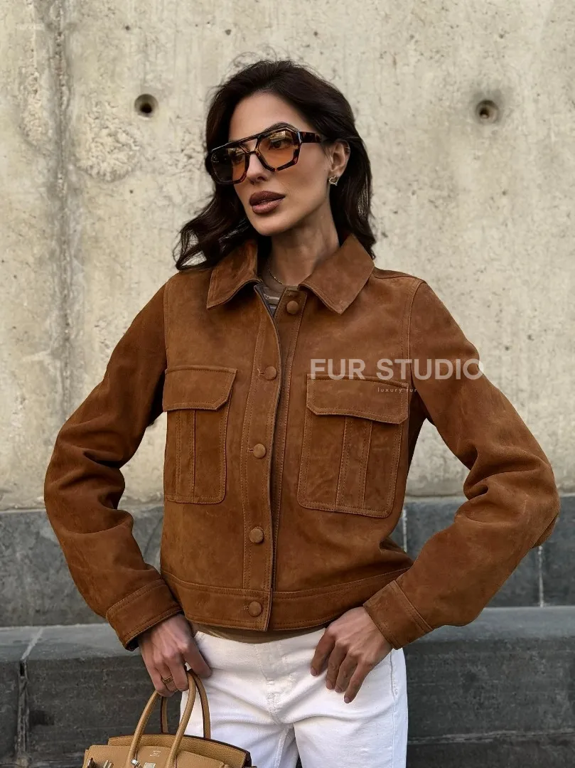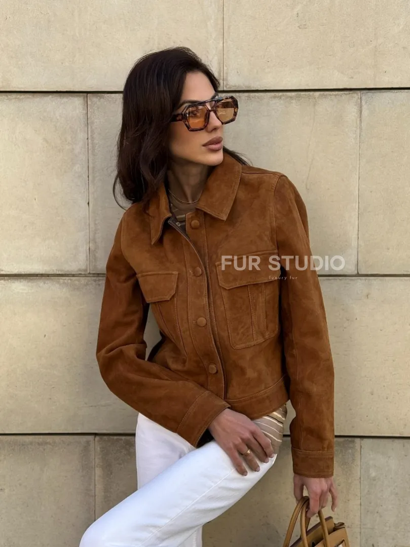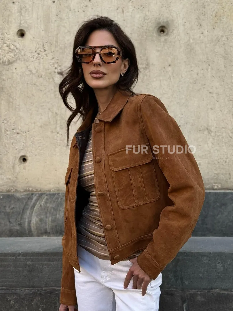 Прямой жакет из натуральной замши с накладными карманами доступна для покупки в нашем шоуруме Furs Studio в Москве, где также предоставляется удобная доставка во все города России.