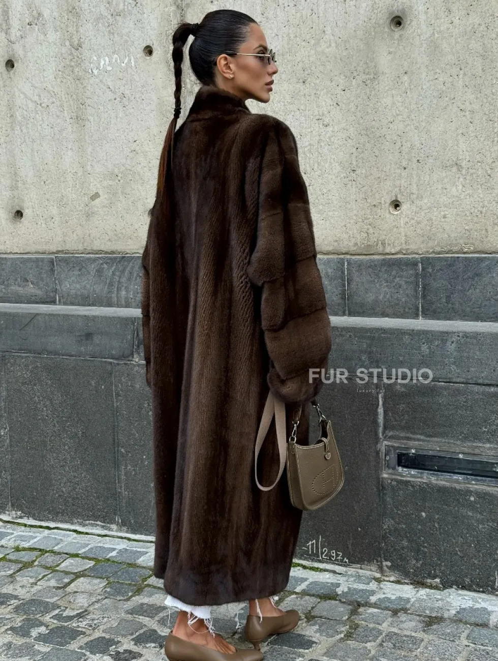 Мех данной шубы аукционная норка , цвет коричневый. Предлагается в размерах от 42 до 52 (инд.пошив от 54 до 68). Длина модели 115-120 см, что выгодно подчеркивает фигуру девушек. Эта модель идеально подойдет для девушек и женщин, предпочитающих роскошные натуральные меха.