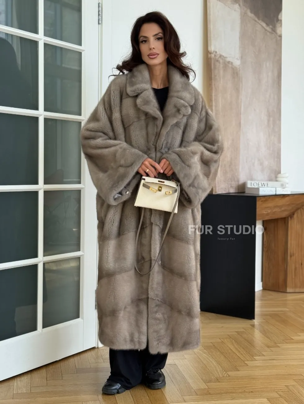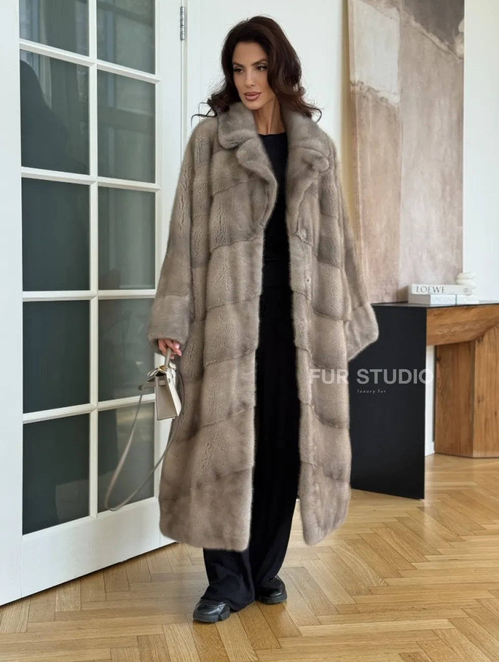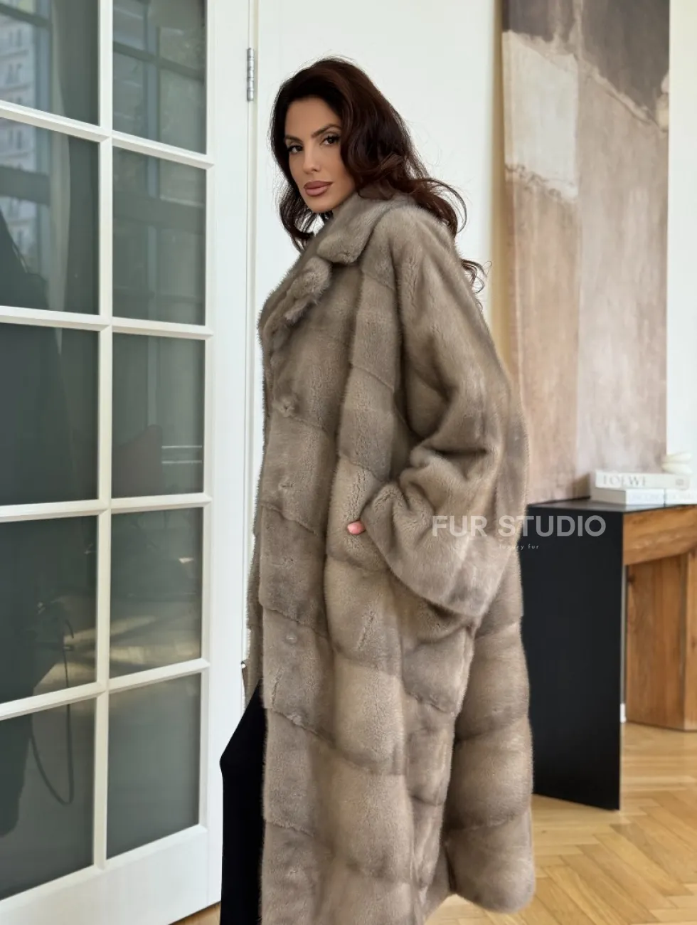 Мех данной шубы аукционная норка, цвет серый. Предлагается в размерах от 42 до 66. Длина модели 120-125 см, что выгодно подчеркивает фигуру девушек. Эта модель идеально подойдет для девушек и женщин, предпочитающих роскошные натуральные меха.