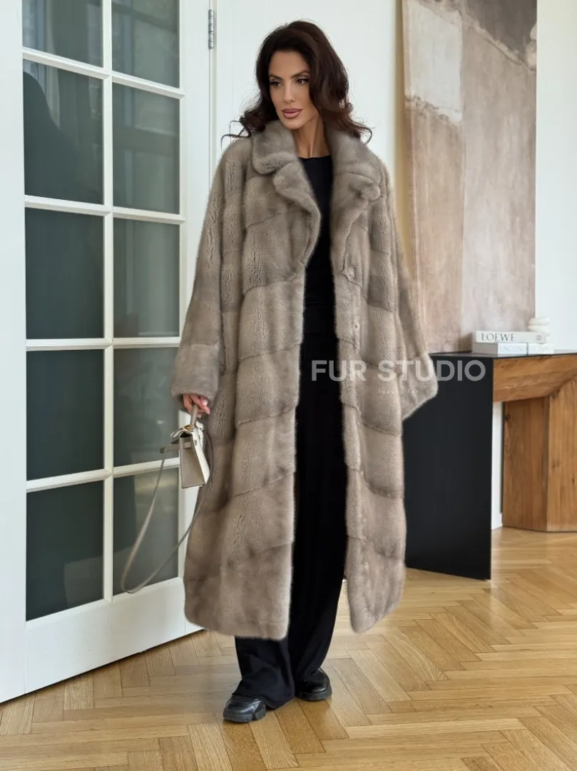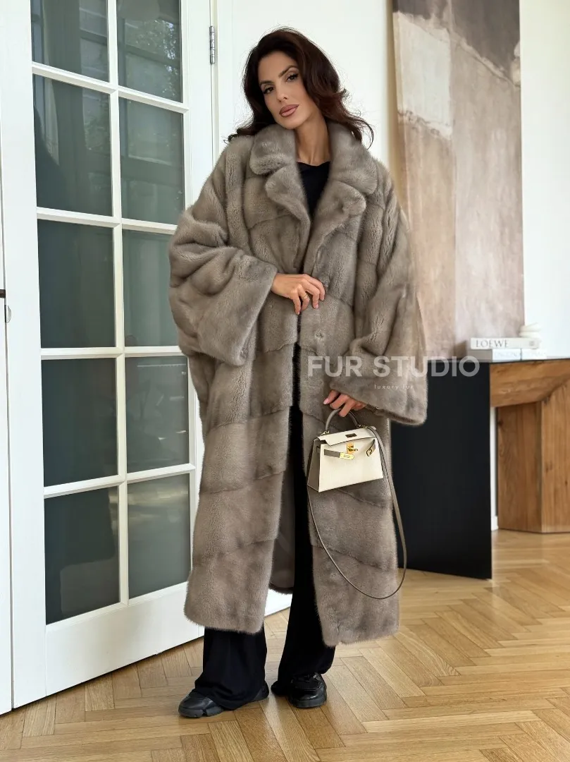 Мех данной шубы аукционная норка, цвет серый. Предлагается в размерах от oversize (42 до 66). Длина модели 120-125 см, что выгодно подчеркивает фигуру девушек. Эта модель идеально подойдет для девушек и женщин, предпочитающих роскошные натуральные меха.