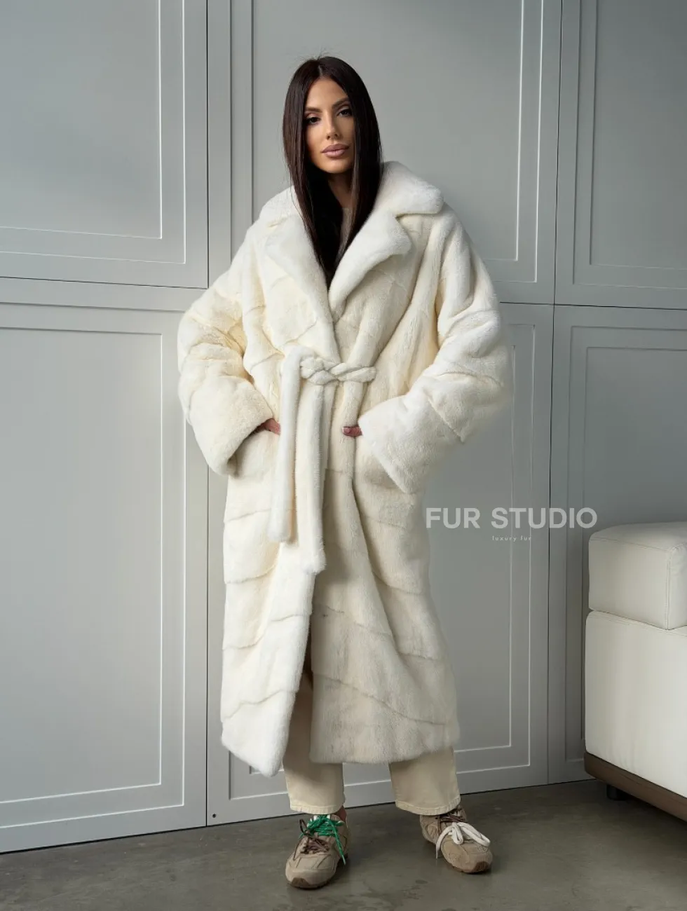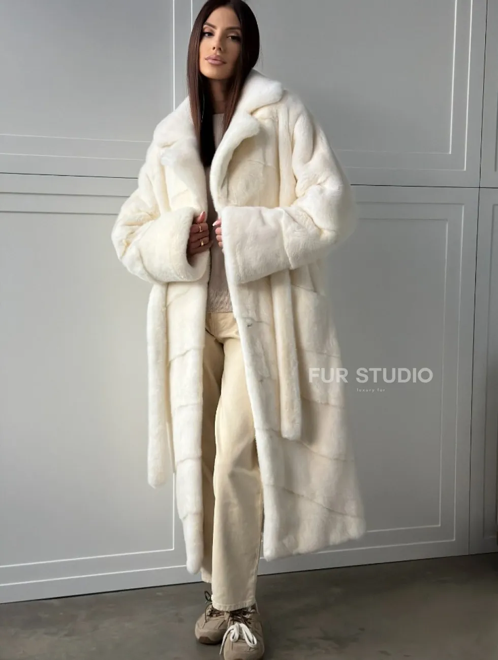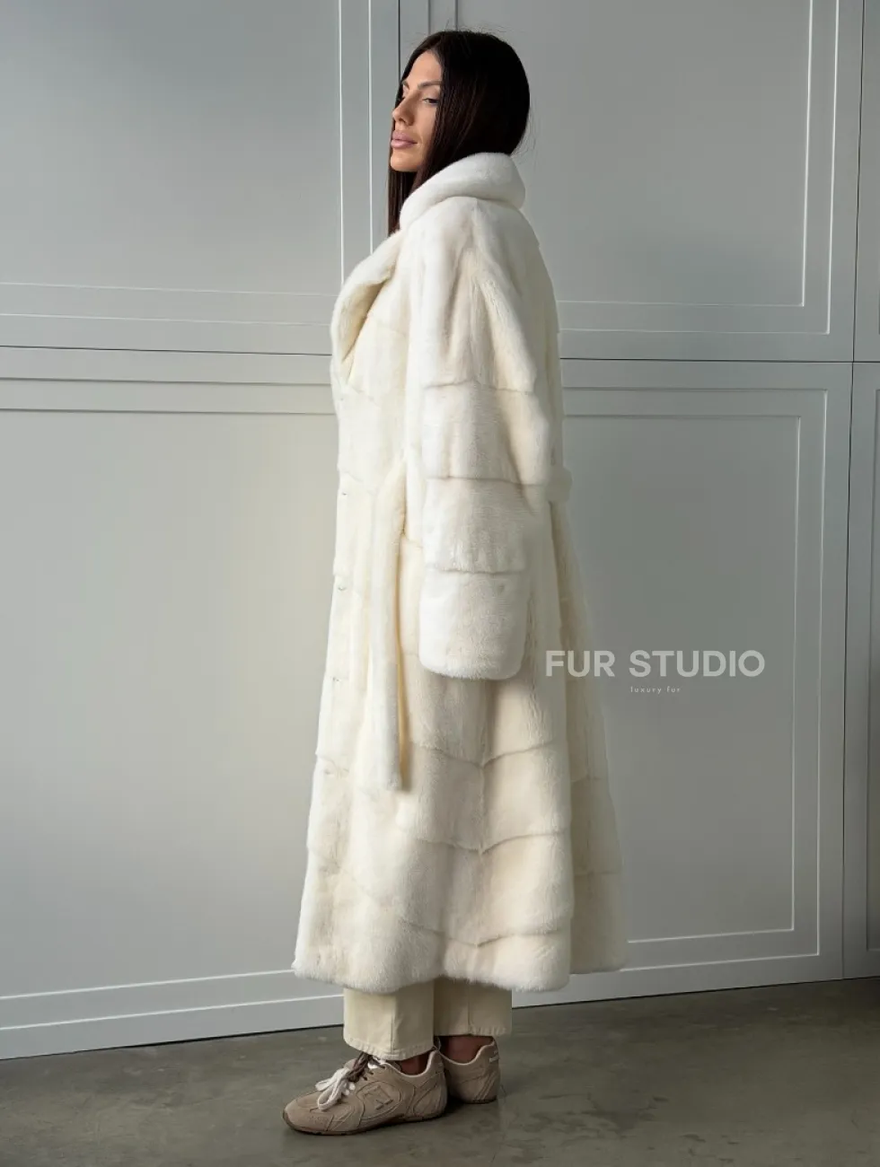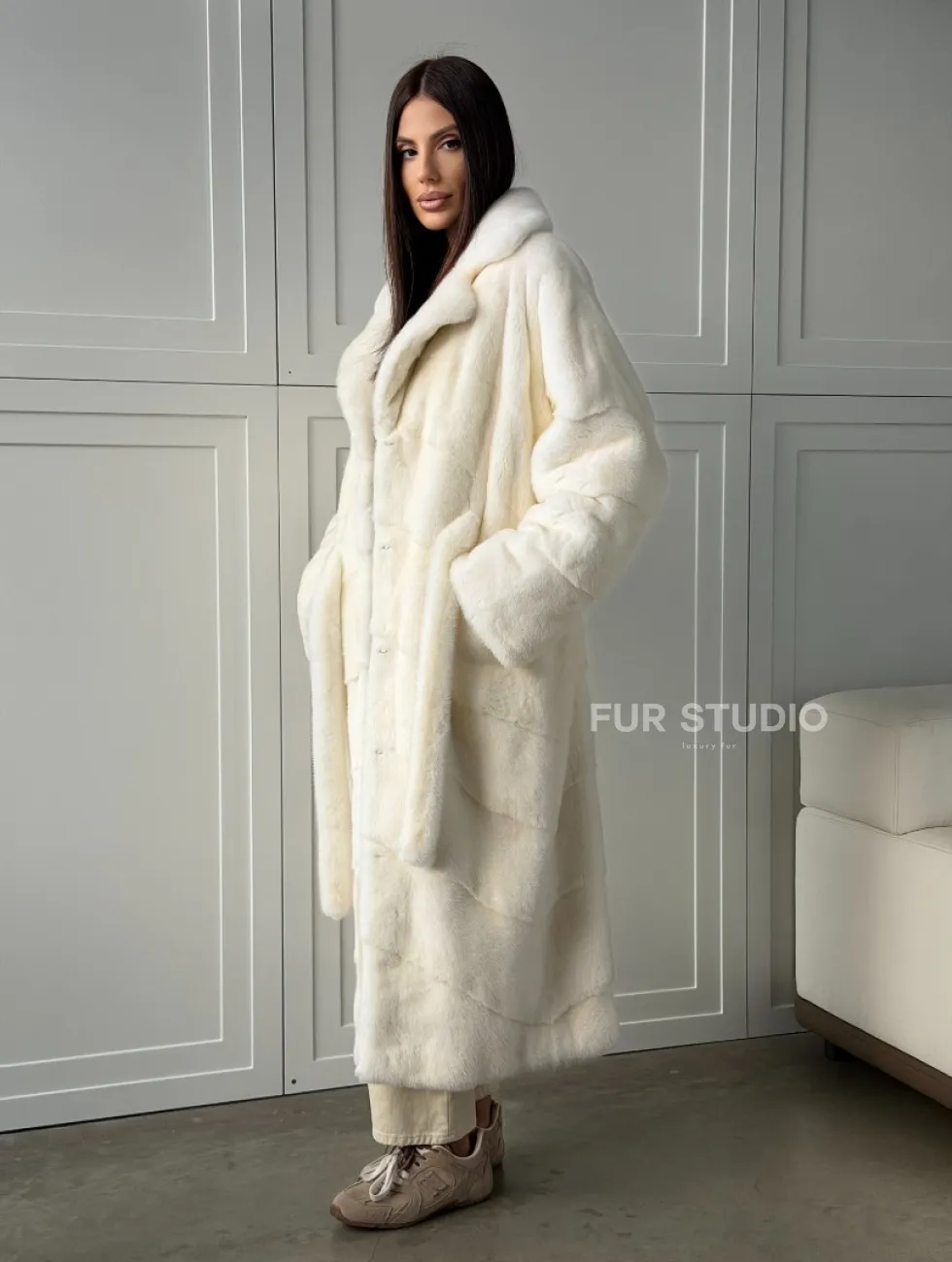 Роскошные рукава добавляют изысканности модели. Шикарные карманы позаботятся о комфорте ручек. Миниатюрная сумочка и грубая обувь сделают ваш образ гармоничным. Качество изделия будет радовать многие годы. Купить белую шубу из плюшевой норки с английским воротником могут дамы, которые обладают безукоризненным вкусом стиля.