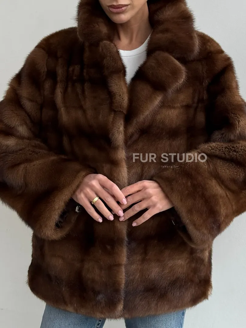 Мех данной шубы аукционная норка, цвет коричневый. Предлагается в размерах от 42 до 50. Длина модели 60-65 см, что выгодно подчеркивает фигуру девушек. Эта модель идеально подойдет для девушек и женщин, предпочитающих роскошные натуральные меха.