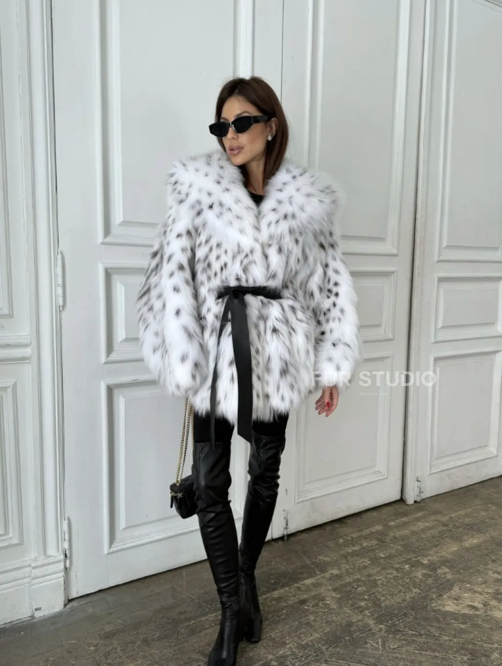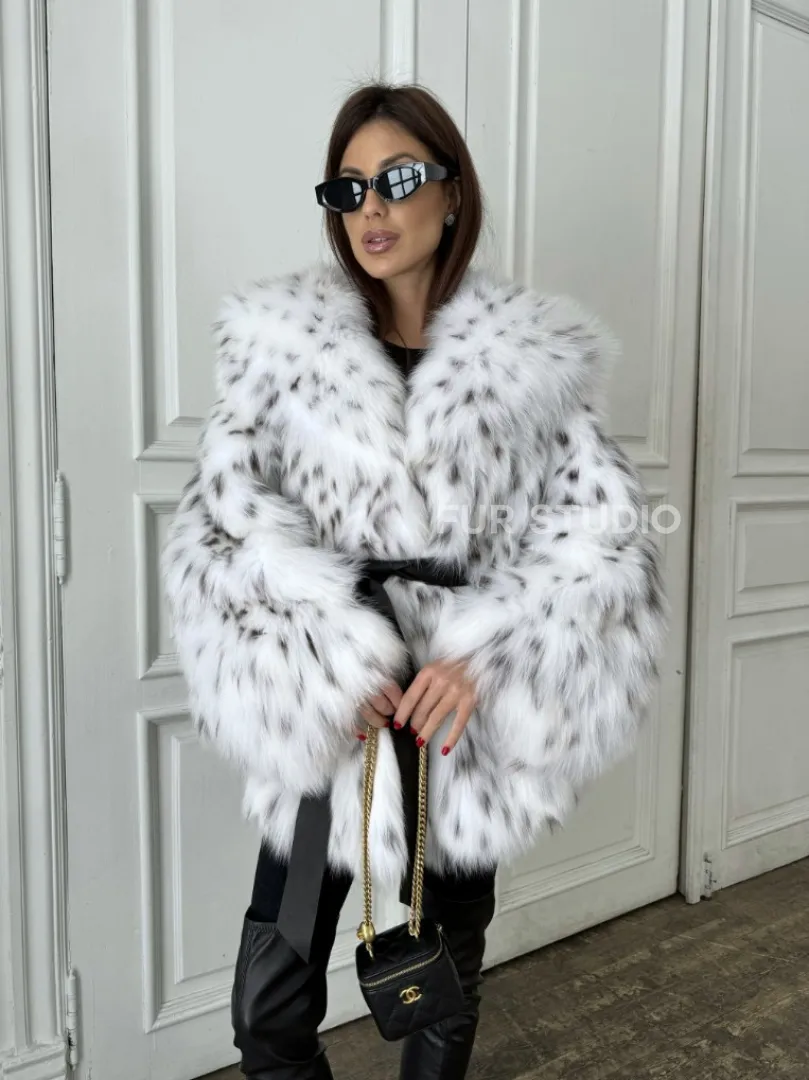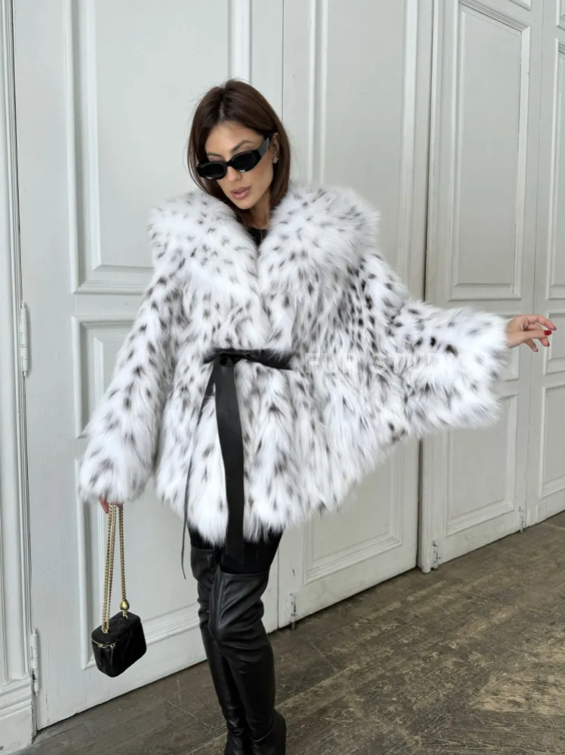Шуба - Белая лиса с вшитыми пятнами из рыси PREMIUM качество, фасон «летучая мышь» легкая и стильная, созданная специально для уверенной в сете активной роскошной женщины. Даже в длине до середины бедра шуба из лисы подарит уют и тепло в любую погоду: в ней комфортно прогуливаться в морозные и ветреные дни, причем не только от такси до ресторана.