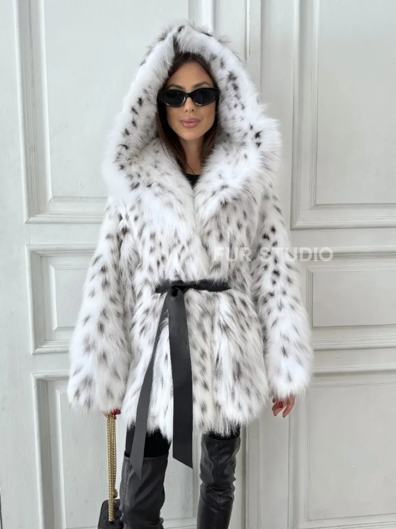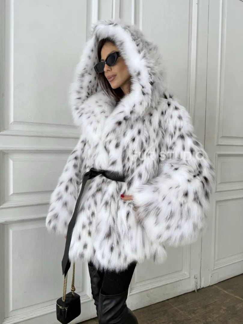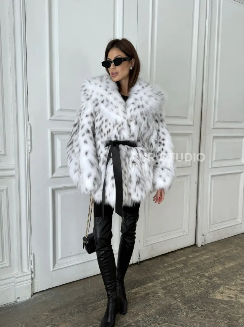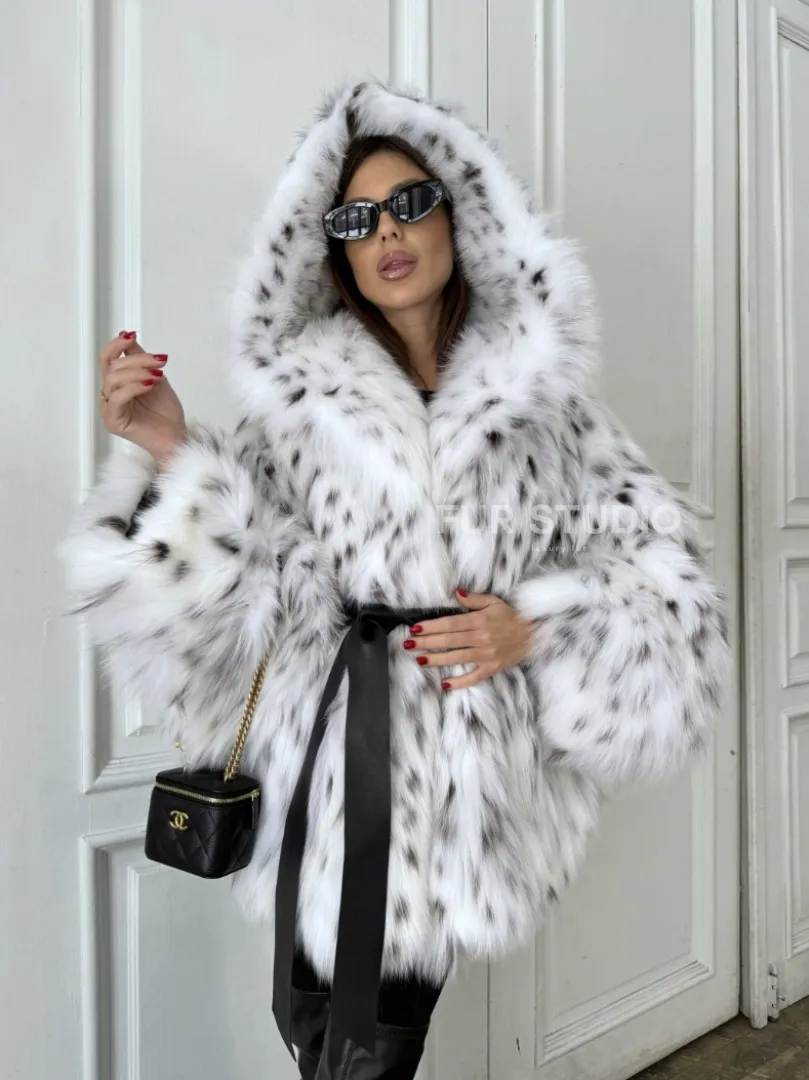 Шуба - Белая лиса с вшитыми пятнами из рыси PREMIUM качество, фасон «летучая мышь» легкая и стильная, созданная специально для уверенной в сете активной роскошной женщины. Даже в длине до середины бедра шуба из лисы подарит уют и тепло в любую погоду: в ней комфортно прогуливаться в морозные и ветреные дни, причем не только от такси до ресторана.