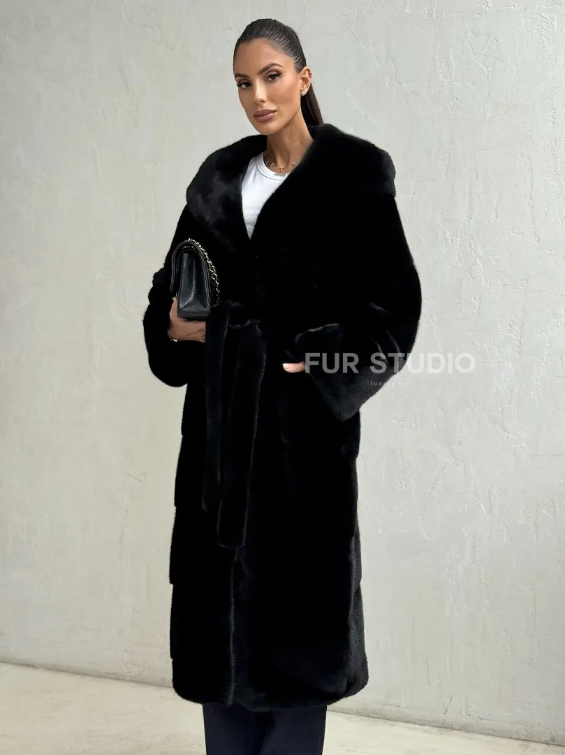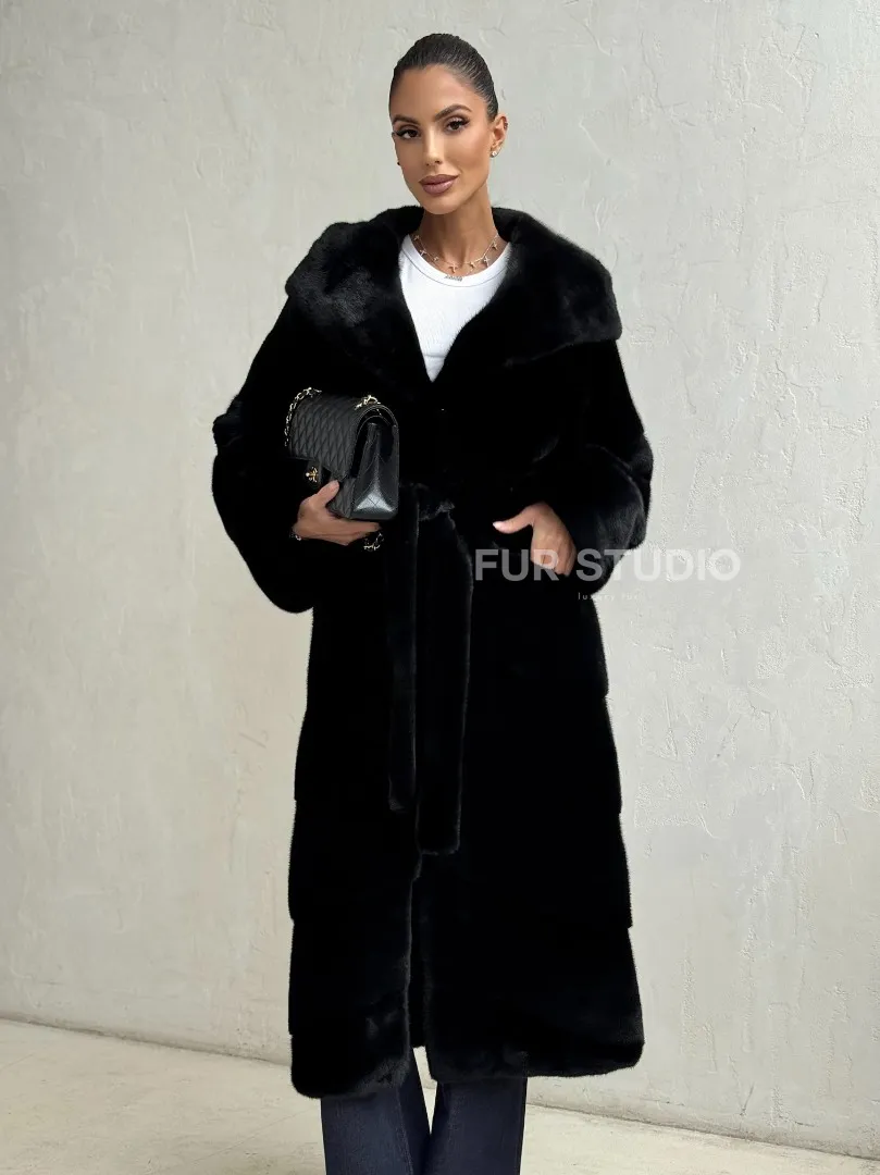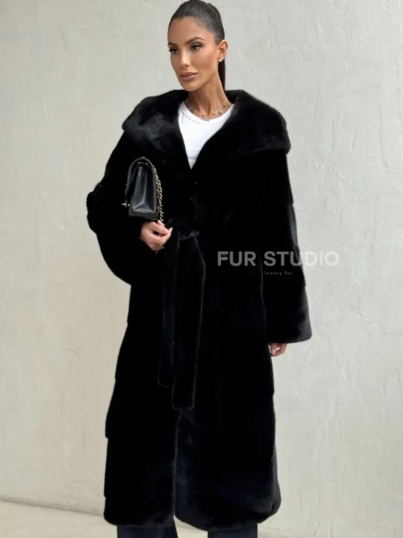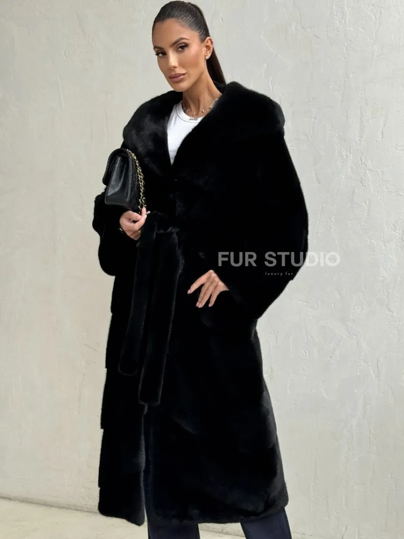 Мех данной шубы норка Blackglama , цвет черный. Предлагается в размерах от 42 до 50. Длина модели 115-120 см, что выгодно подчеркивает фигуру девушек. Эта модель идеально подойдет для девушек и женщин, предпочитающих роскошные натуральные меха.