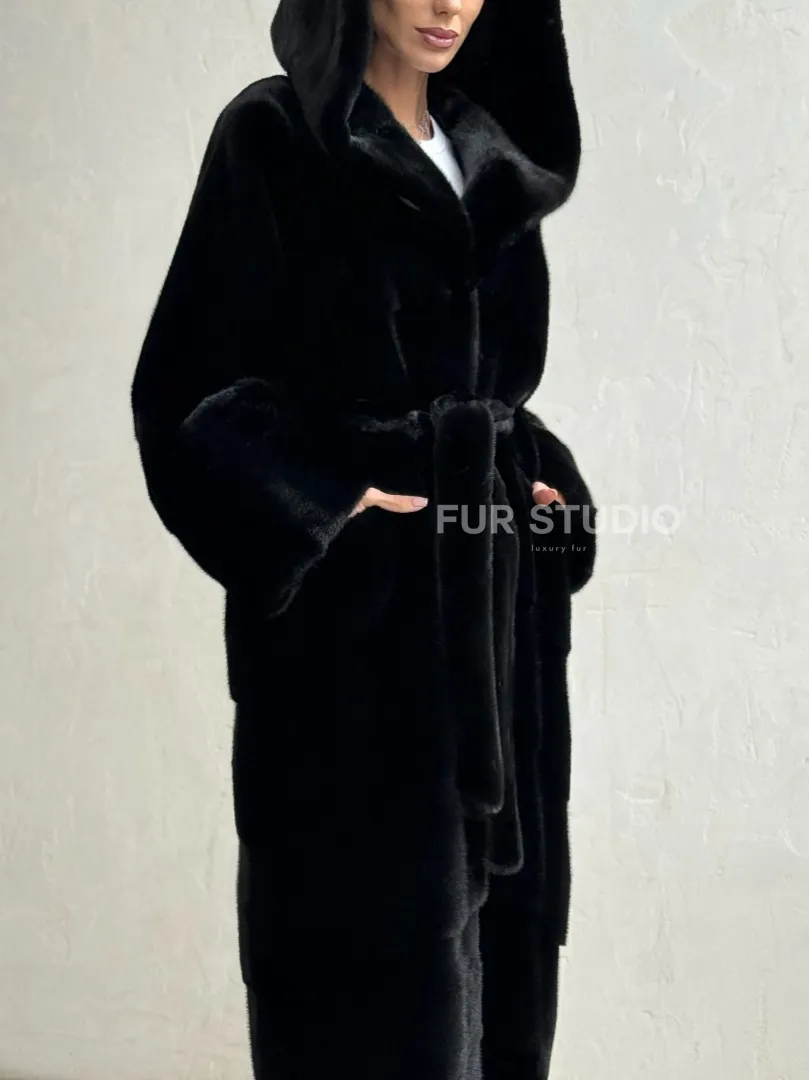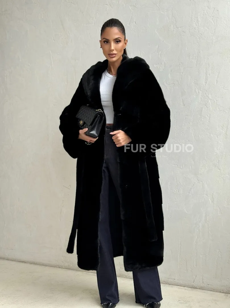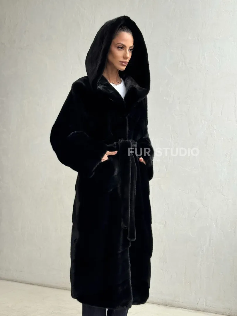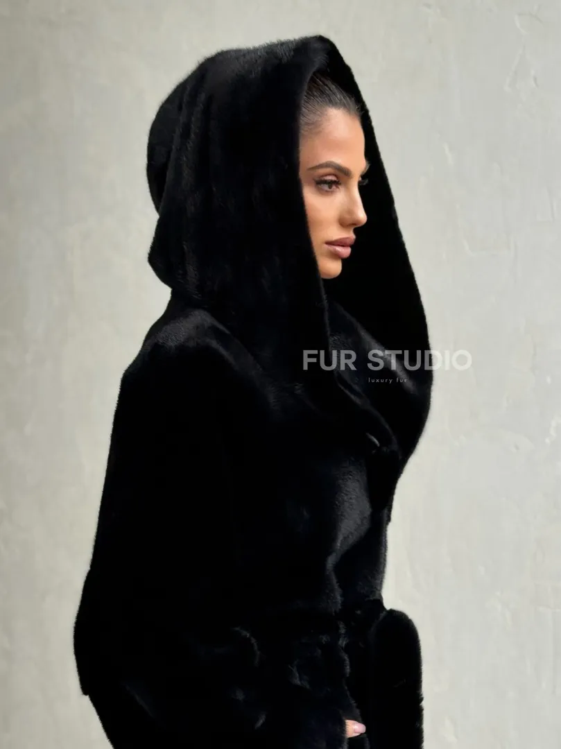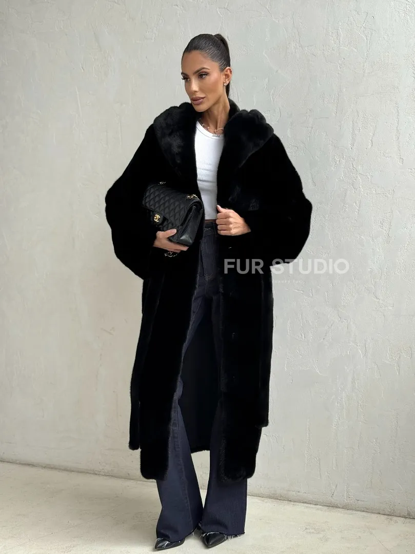 Мех данной шубы норка Blackglama , цвет черный. Предлагается в размерах от 42 до 50. Длина модели 115-120 см, что выгодно подчеркивает фигуру девушек. Эта модель идеально подойдет для девушек и женщин, предпочитающих роскошные натуральные меха.