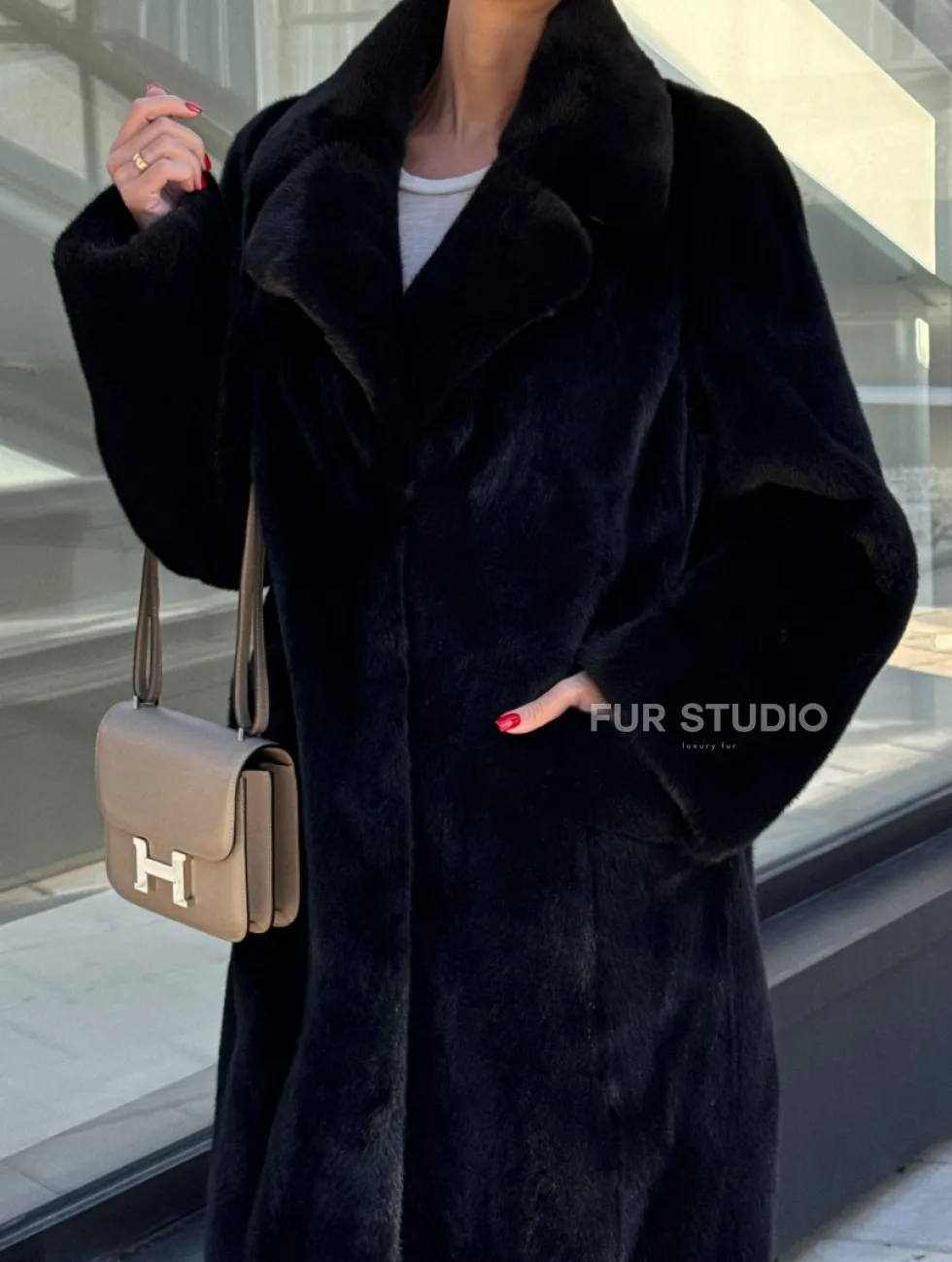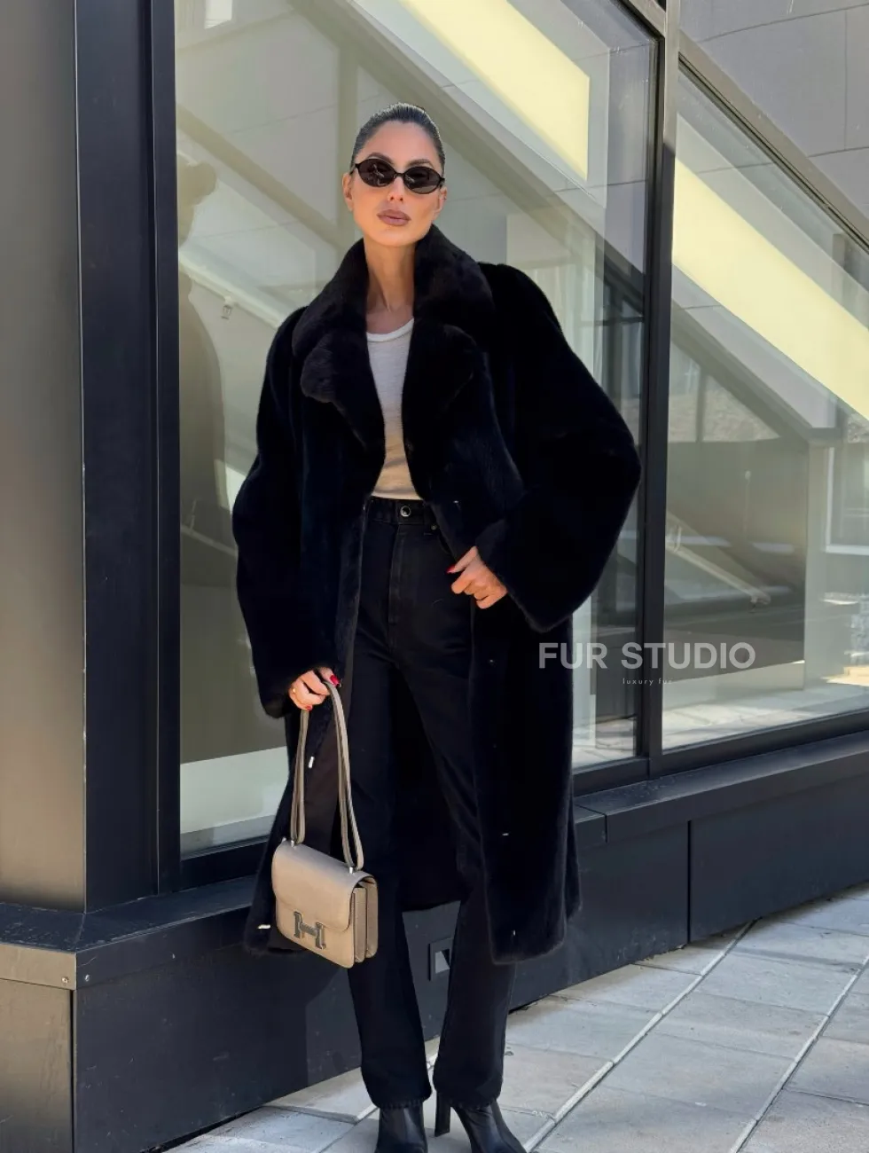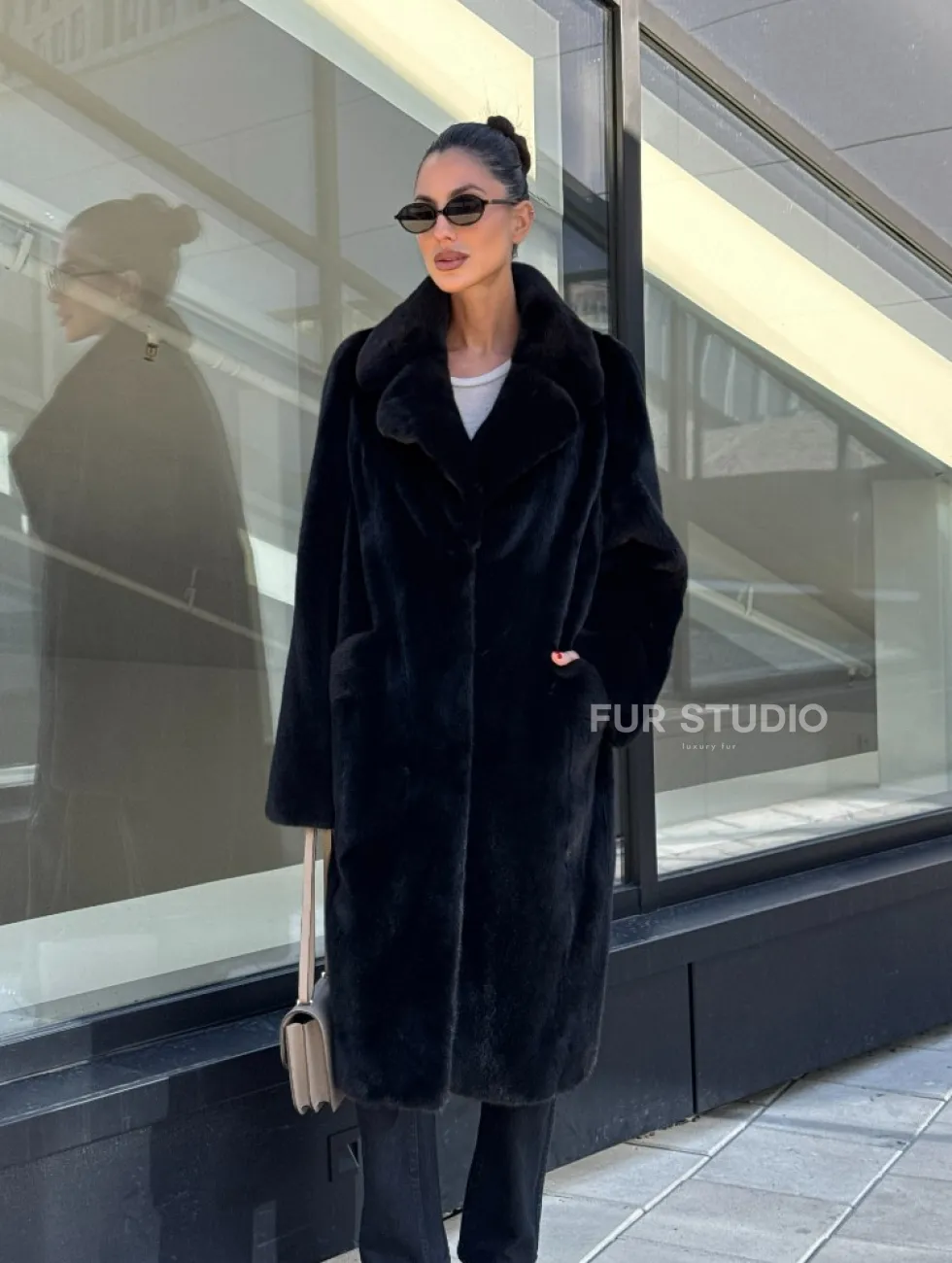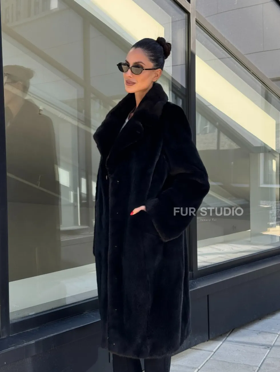 Мех данной шубы аукционная норка, цвет черный. Предлагается в размерах от 42 до 50. Длина модели 105-110 см, что выгодно подчеркивает фигуру девушек. Эта модель идеально подойдет для девушек и женщин, предпочитающих роскошные натуральные меха.