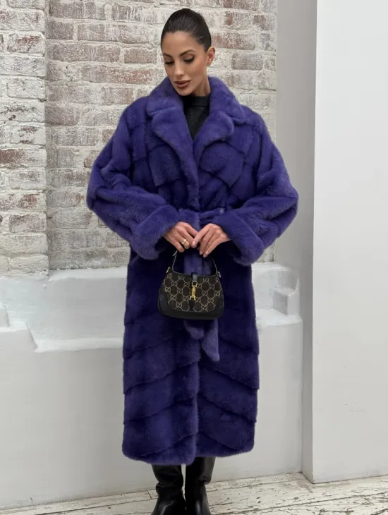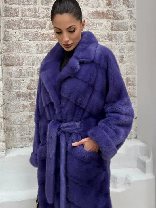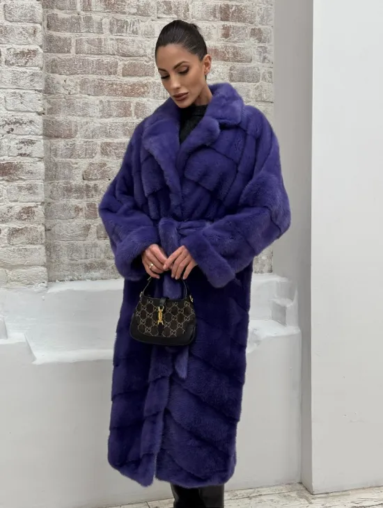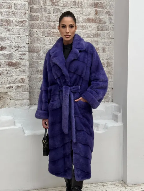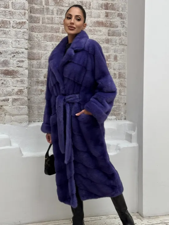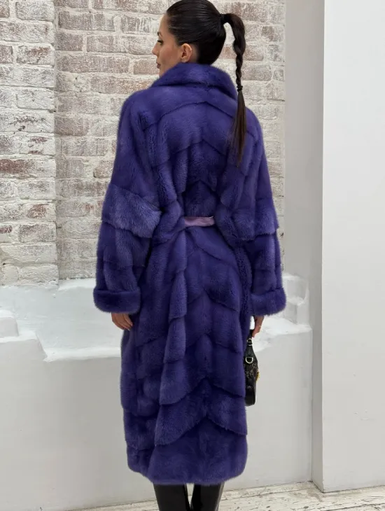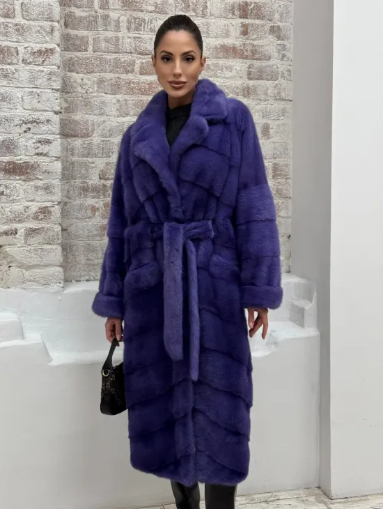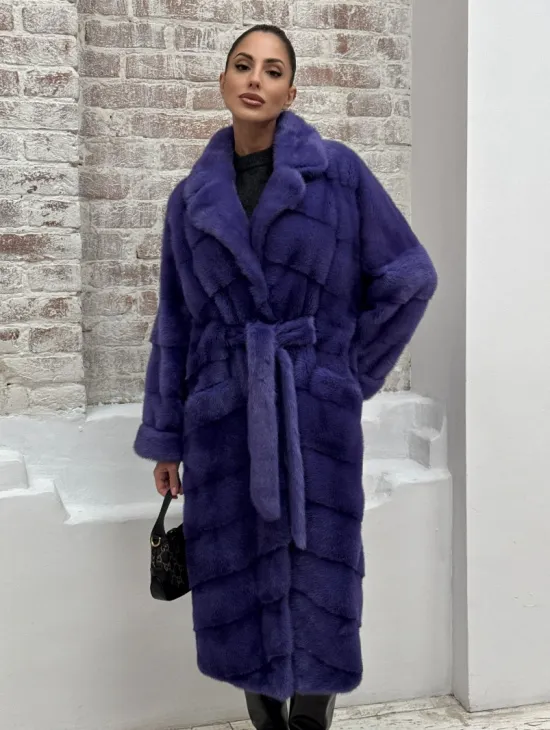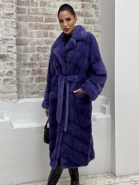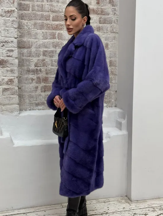 Мех данной шубы скандинавская норка, цвет фиолетовый. Предлагается в размерах от 48 до 62. Длина модели 90-95 см, что выгодно подчеркивает фигуру девушек. Эта модель идеально подойдет для девушек и женщин, предпочитающих роскошные натуральные меха.