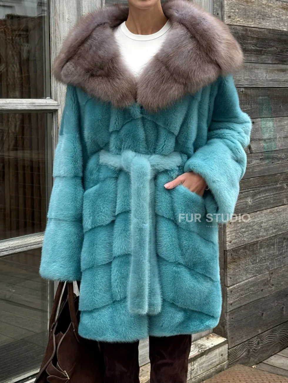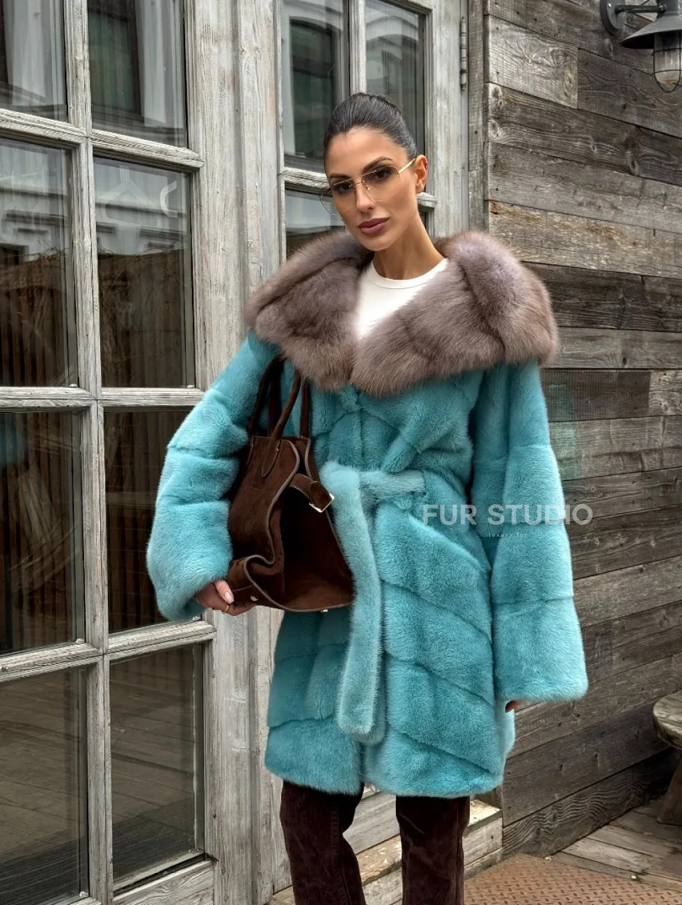 Мех данной шубы аукционная норка, цвет голубой. Предлагается в размерах от 40 до 50. Длина модели 85-90 см, что выгодно подчеркивает фигуру девушек. Эта модель идеально подойдет для девушек и женщин, предпочитающих роскошные натуральные меха.